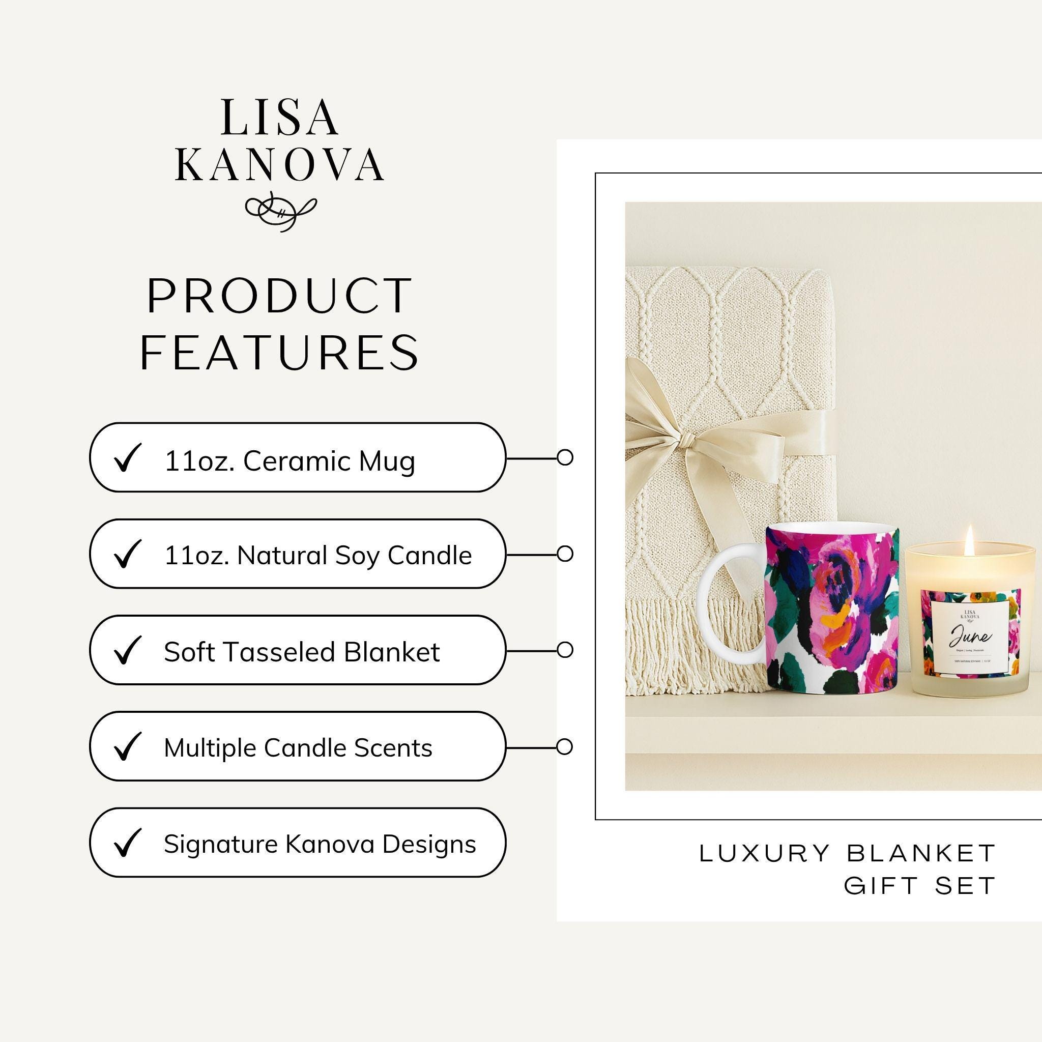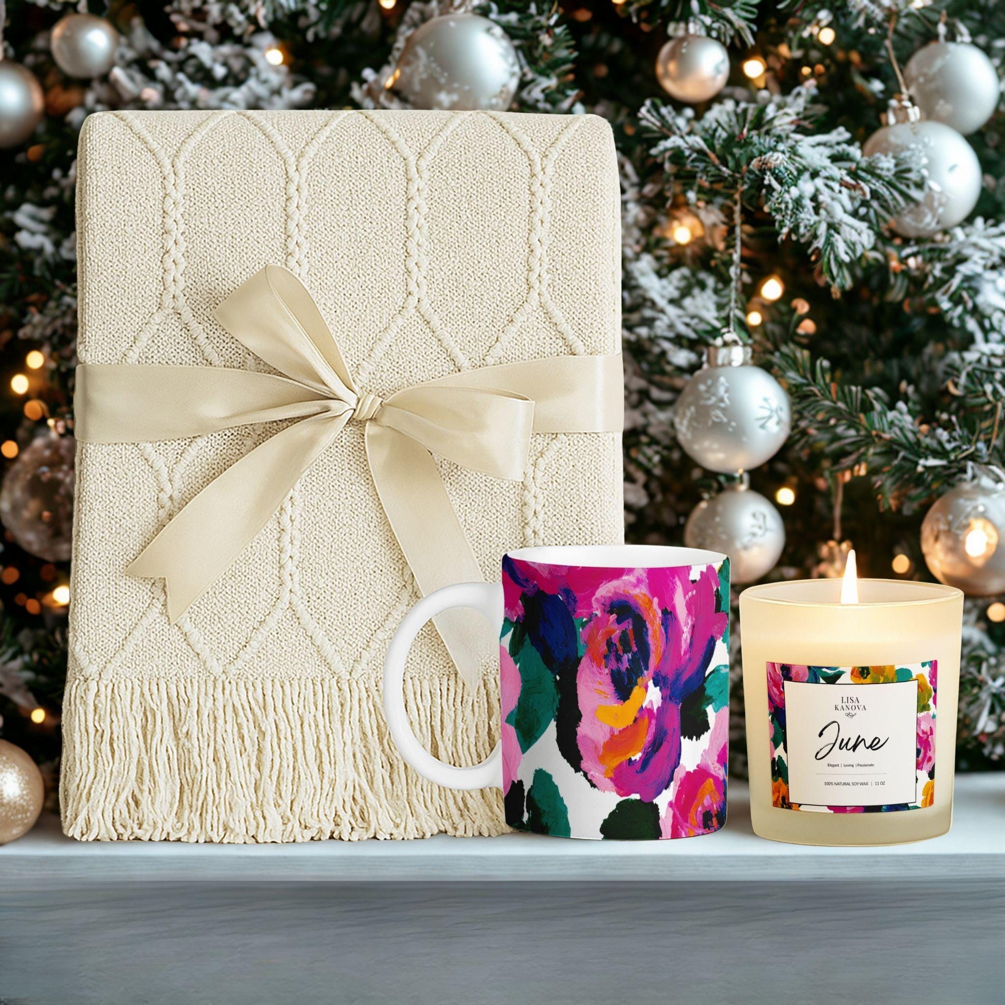 Bring a touch of curated beauty to any moment with this personalized toile gift set. Designed to feel timeless, elegant, and unmistakably special, this three-piece collection transforms everyday comfort into a refined ritual. Each set includes a soft tassel throw, a fine-art floral mug, and a personalized soy candle wrapped in coordinating toile — a blend of classic charm and modern style.