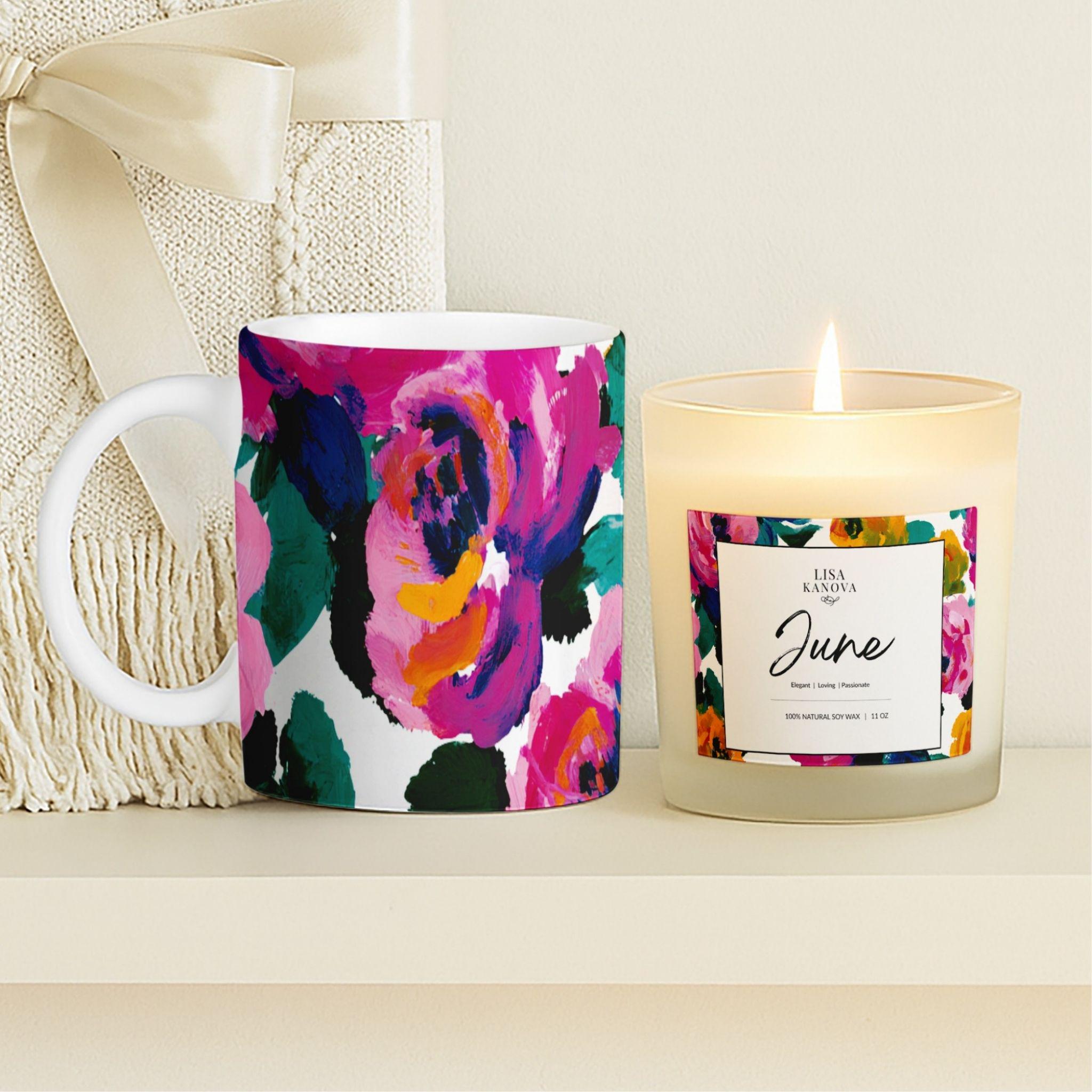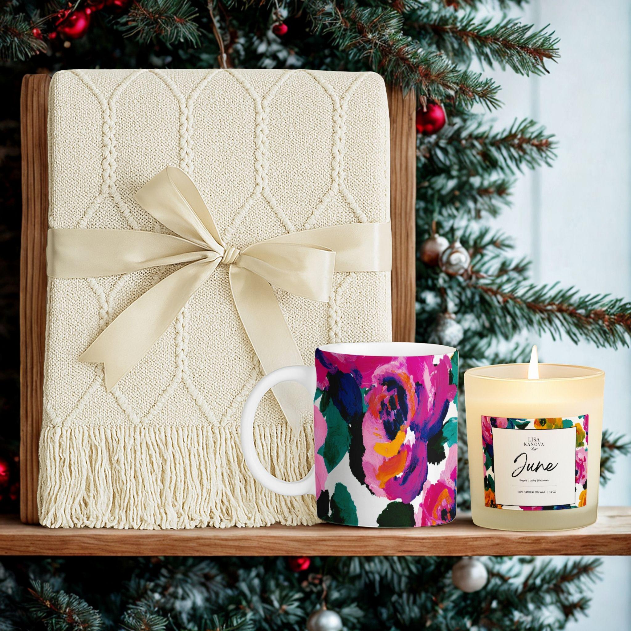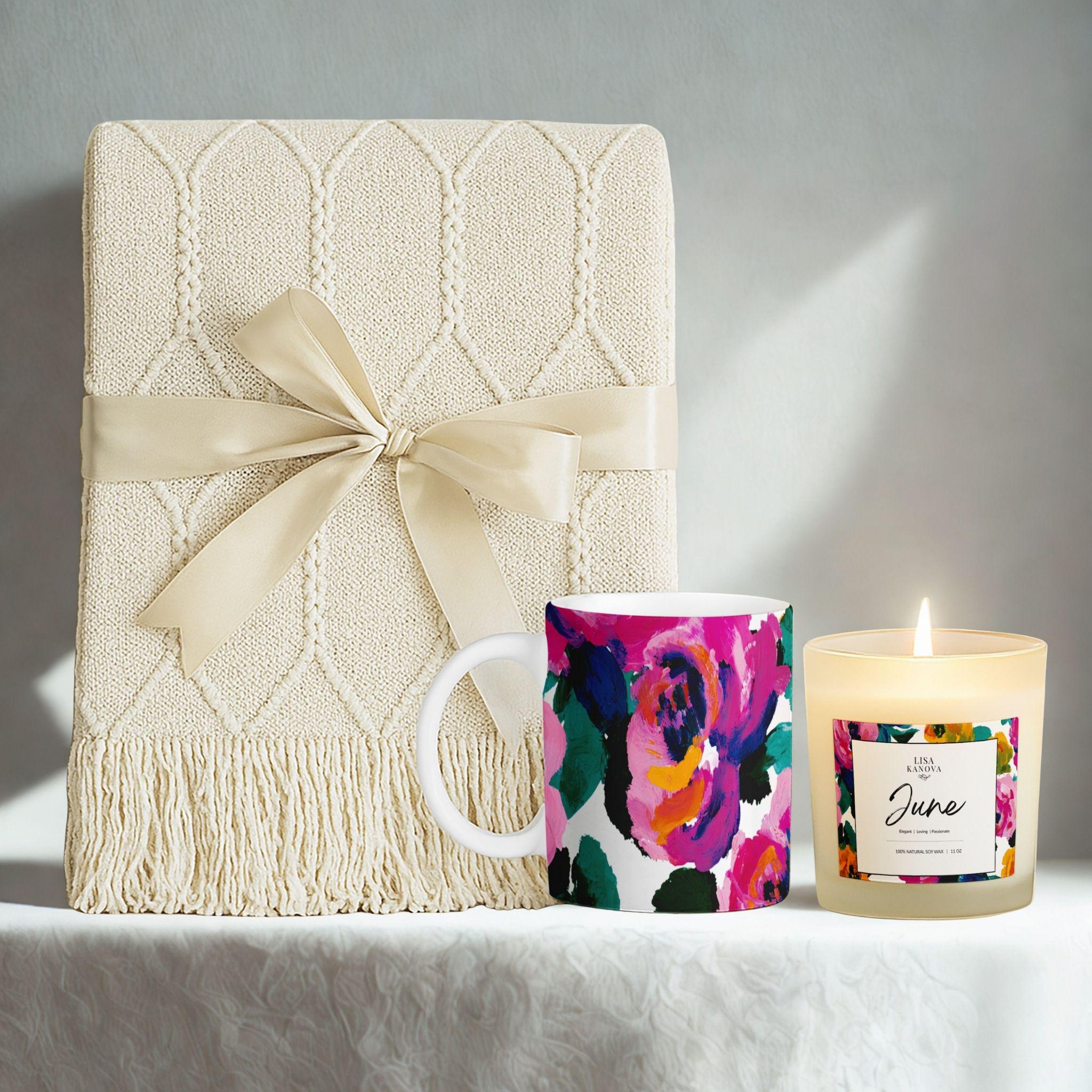 Luxury Birth Flower Cozy Gift Set • Tassel Blanket, Soy Candle & Ceramic Mug - June Rose