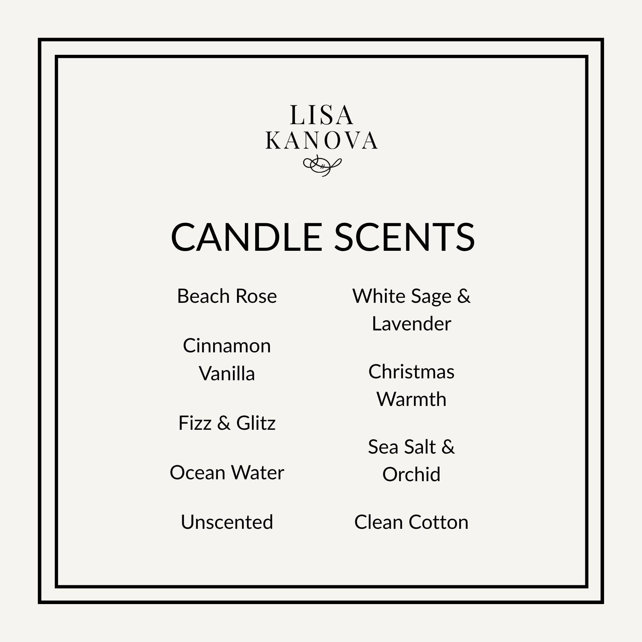 A clean-burning candle in a frosted glass jar, wrapped in your coordinating toile artwork.