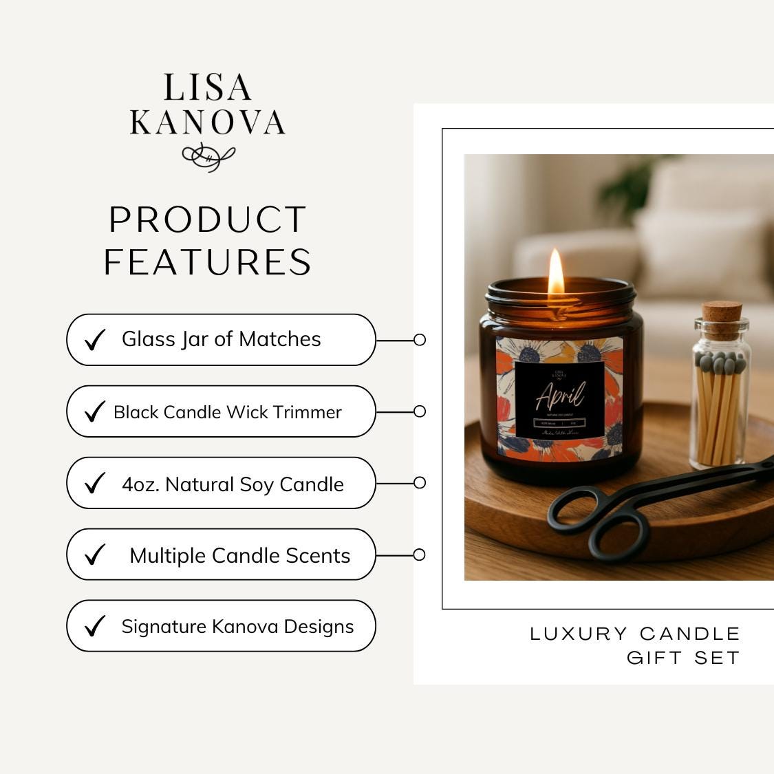 This elegant 3-piece gift set includes 1 x 4oz scented candle, 1 Black Candle Trimmer, and 1 jar of matches — a thoughtfully curated collection for any candle lover. The eco-friendly soy candle offers a clean, consistent burn with a customizable label for a personal or branded touch. The wick trimmer helps maintain optimal burning conditions, while the included matches make lighting simple and stylish. Perfect for gifting, client appreciation, or adding a personalized flair to your product line, this set combines quality, function, and a refined presentation.