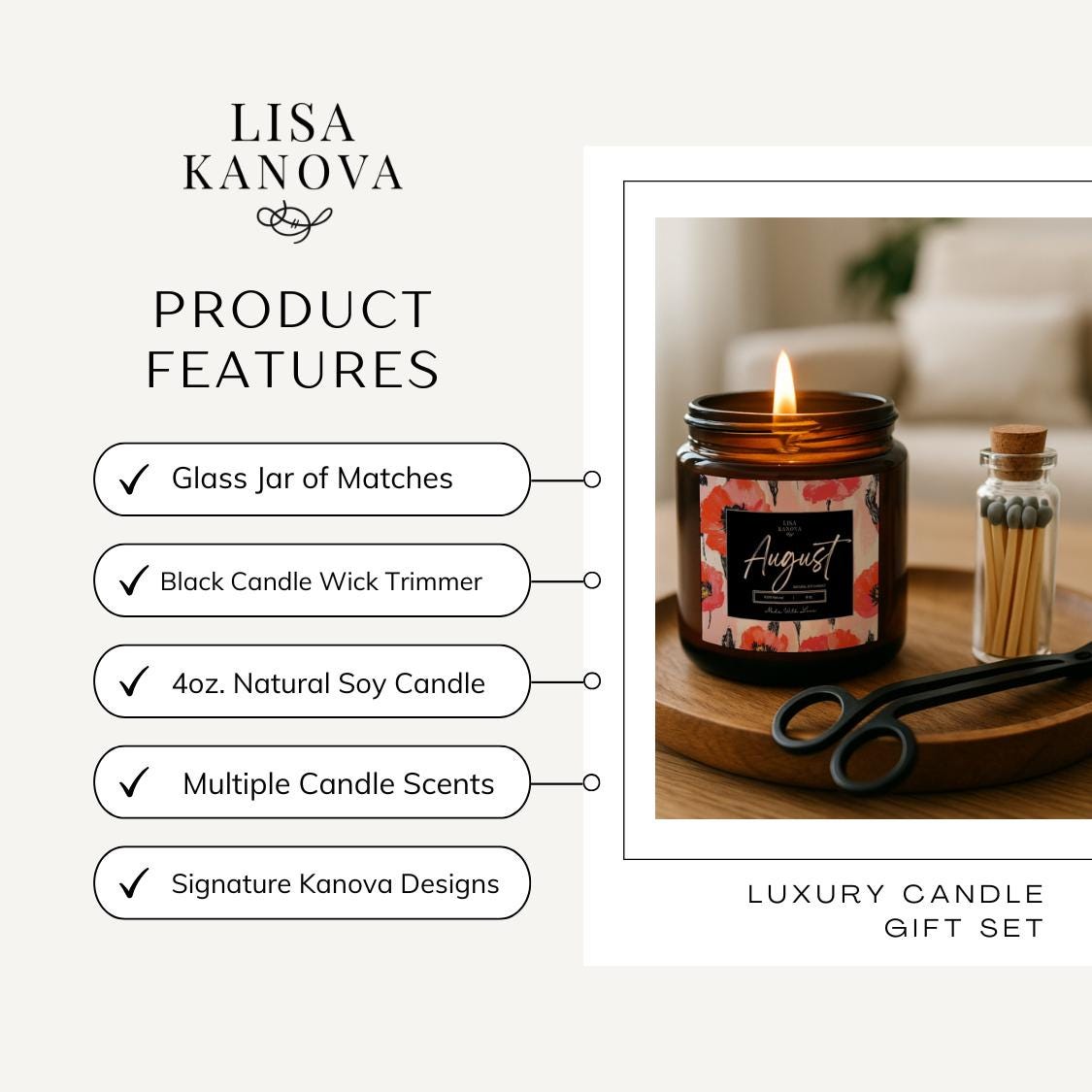 This elegant 3-piece gift set includes 1 x 4oz scented candle, 1 Black Candle Trimmer, and 1 jar of matches — a thoughtfully curated collection for any candle lover. The eco-friendly soy candle offers a clean, consistent burn with a customizable label for a personal or branded touch. The wick trimmer helps maintain optimal burning conditions, while the included matches make lighting simple and stylish. Perfect for gifting, client appreciation, or adding a personalized flair to your product line, this set combines quality, function, and a refined presentation.