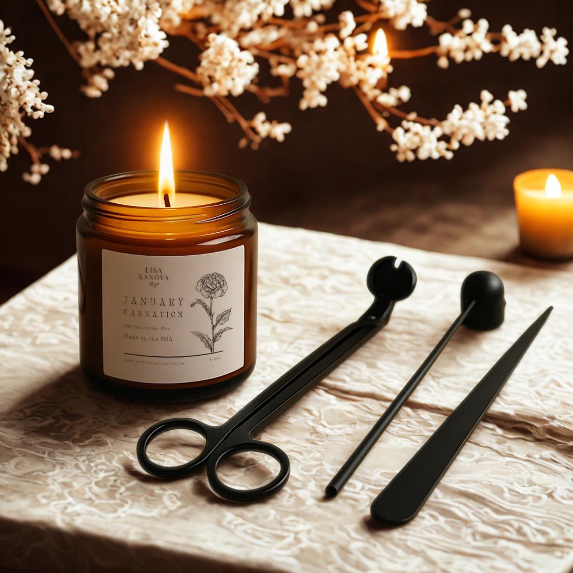 Candle Care Set with Wick Trimmer, Snuffer & Dipper, Soy Wax Candle | January Carnation