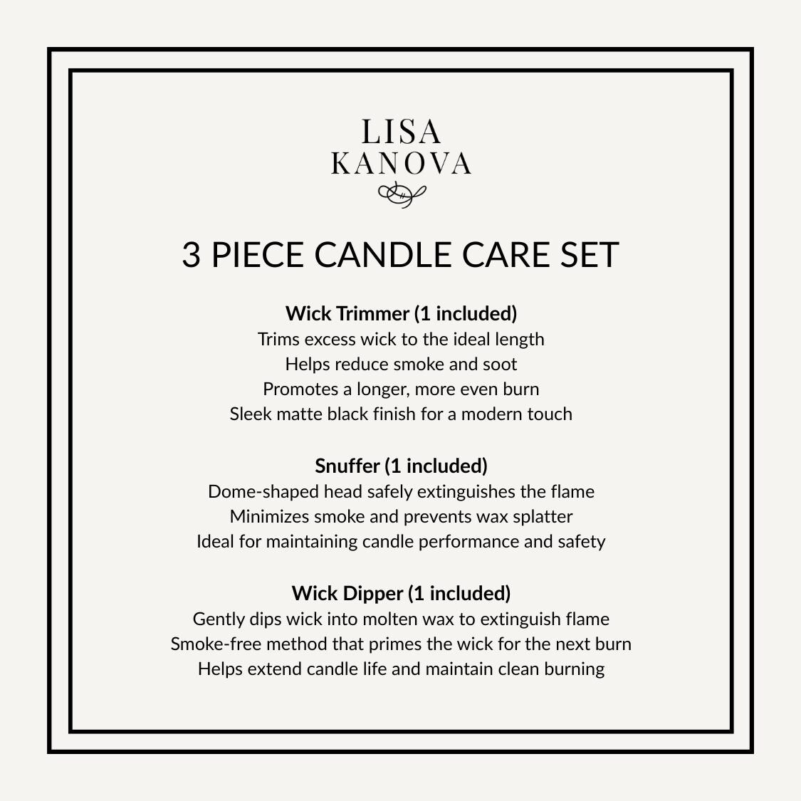 This complete Candle Care Gift Set includes a 4 oz natural soy candle and a trio of matte-black tools designed to elevate every burn — stylish, thoughtful, and perfect for gifting.