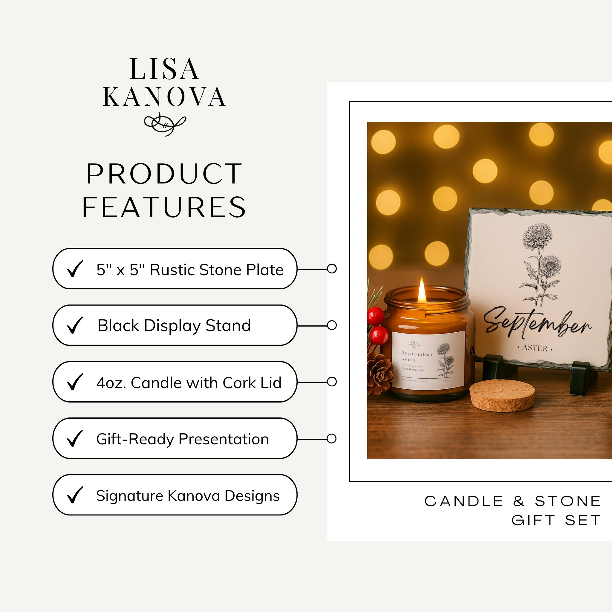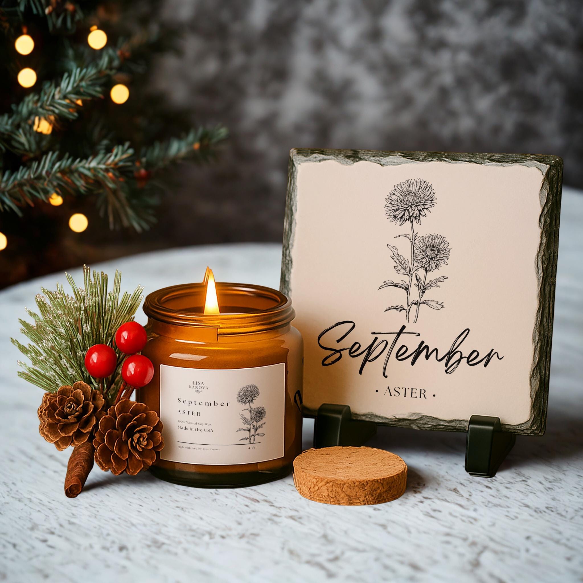 Birth Flower Gift Set • Candle & Slate Stone • September Aster • Birthday • Holiday • Keepsake Home Decor