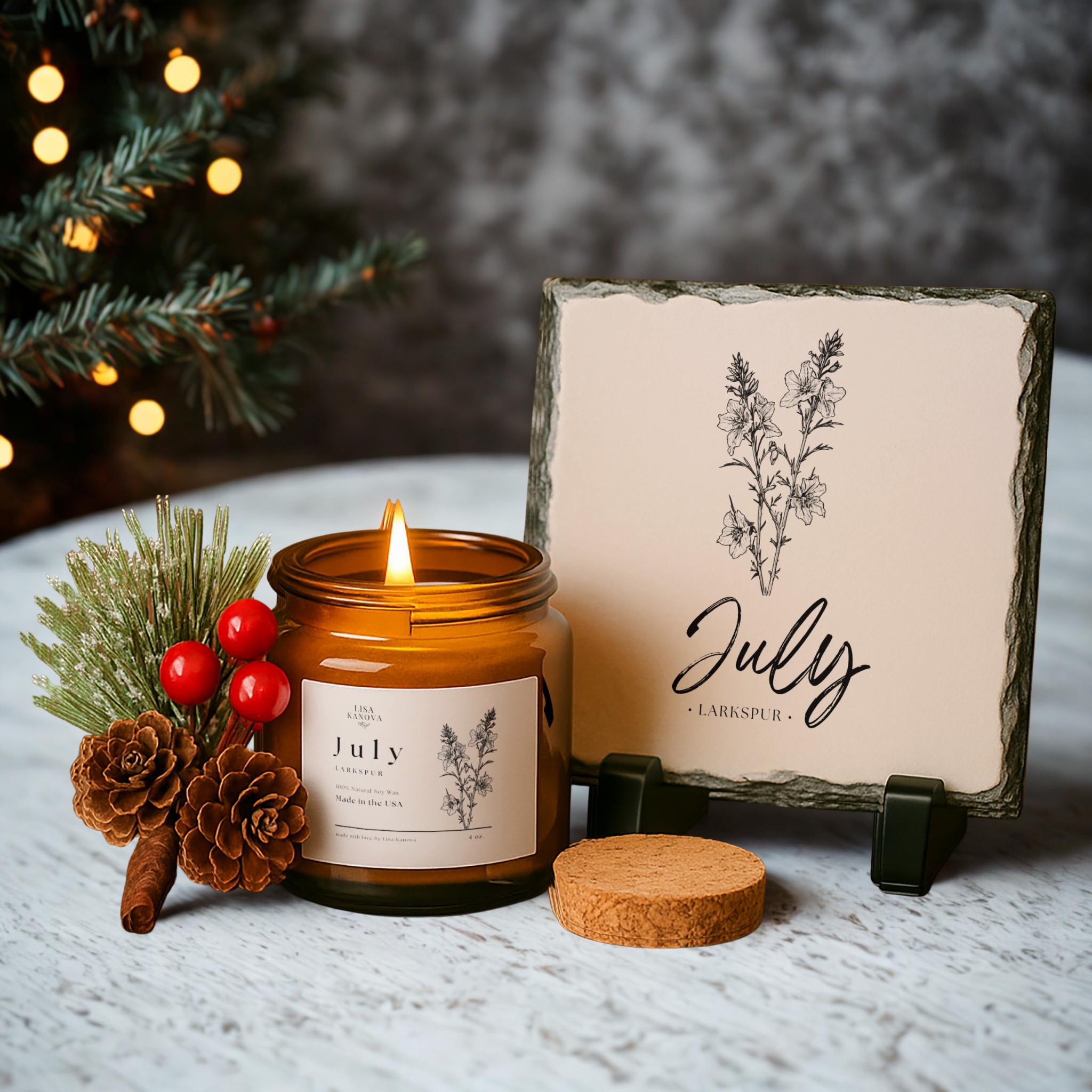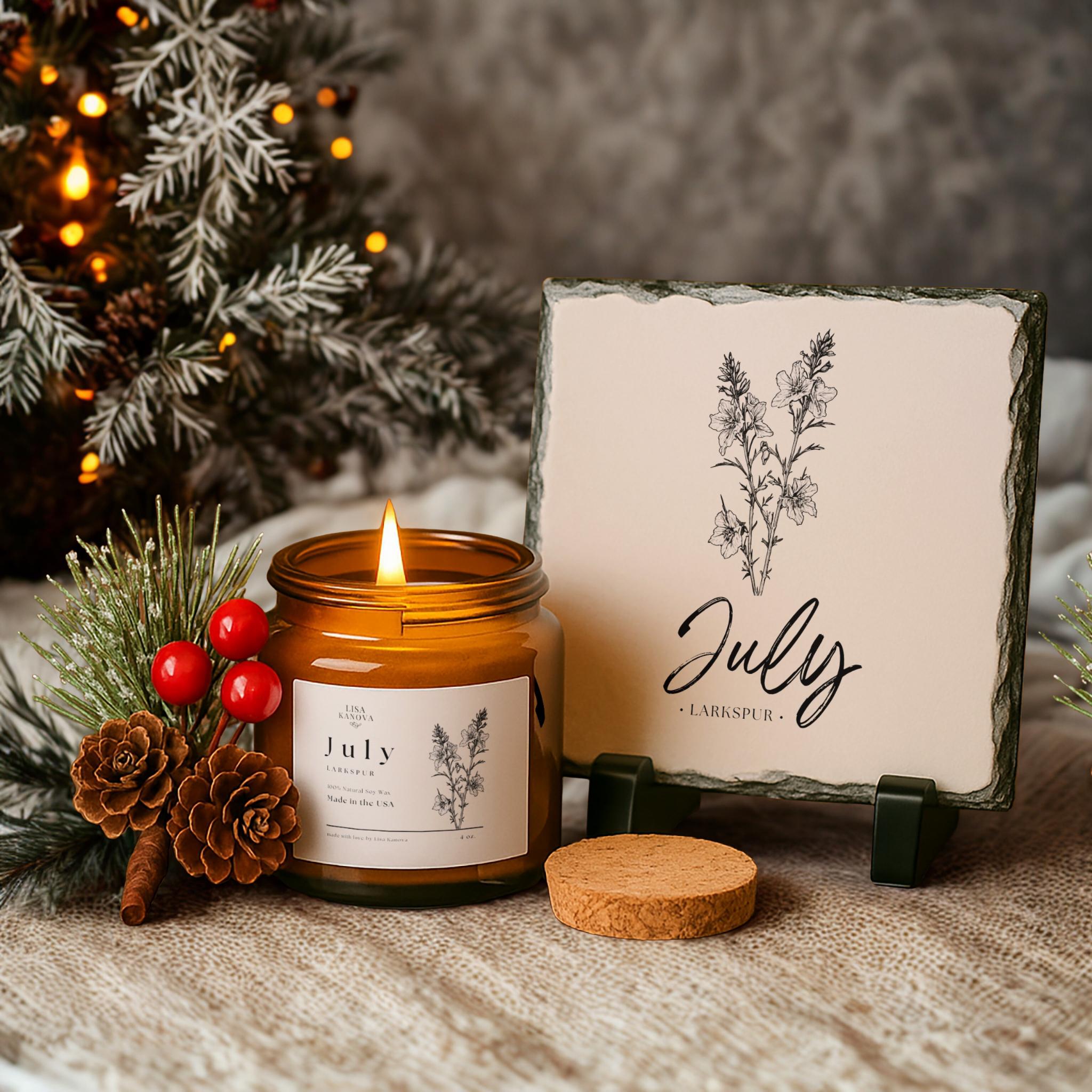 Each Birth Flower Gift Set includes a cozy 4oz soy candle, a natural slate stone featuring that month’s botanical illustration, and a festive seasonal accent — all curated to create a warm, sentimental moment right out of the box.