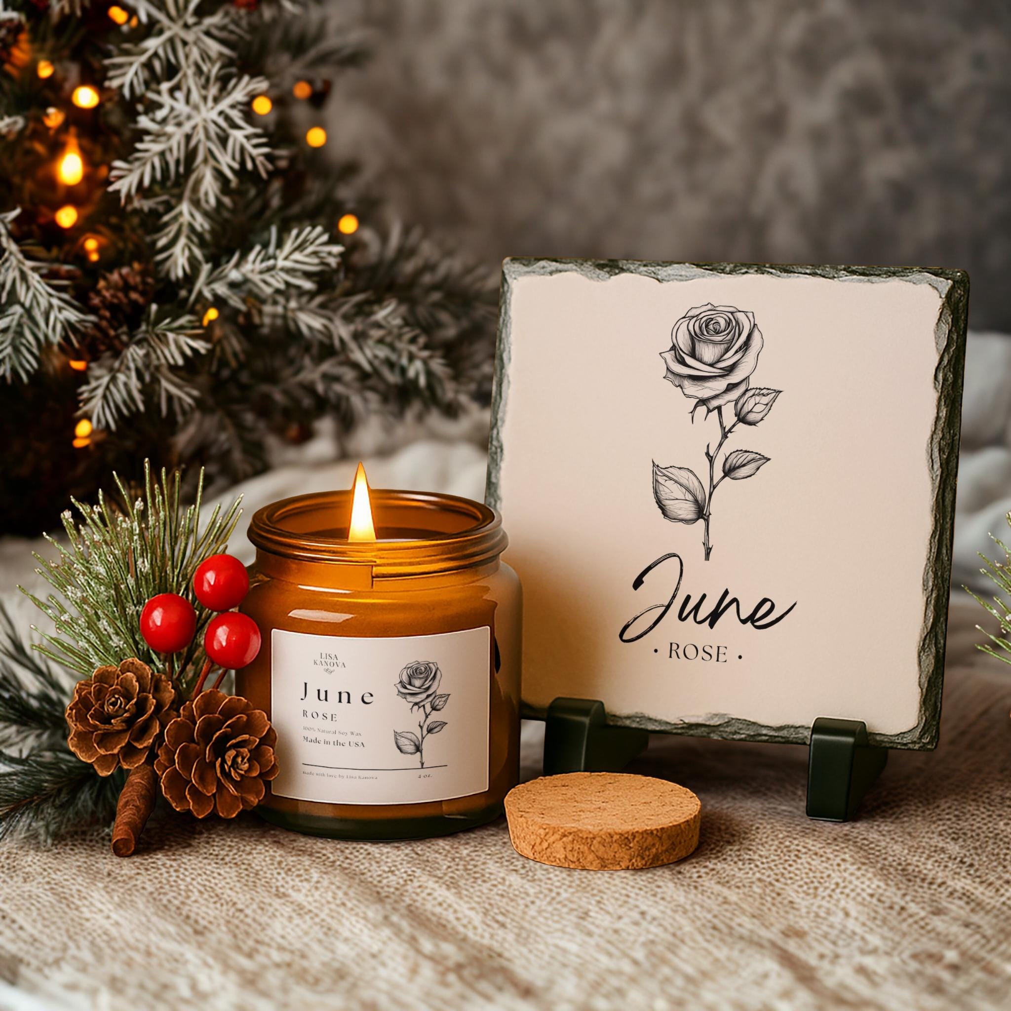 Birth Flower Gift Set • Candle & Slate Stone • June Rose • Birthday • Holiday • Keepsake Home Decor