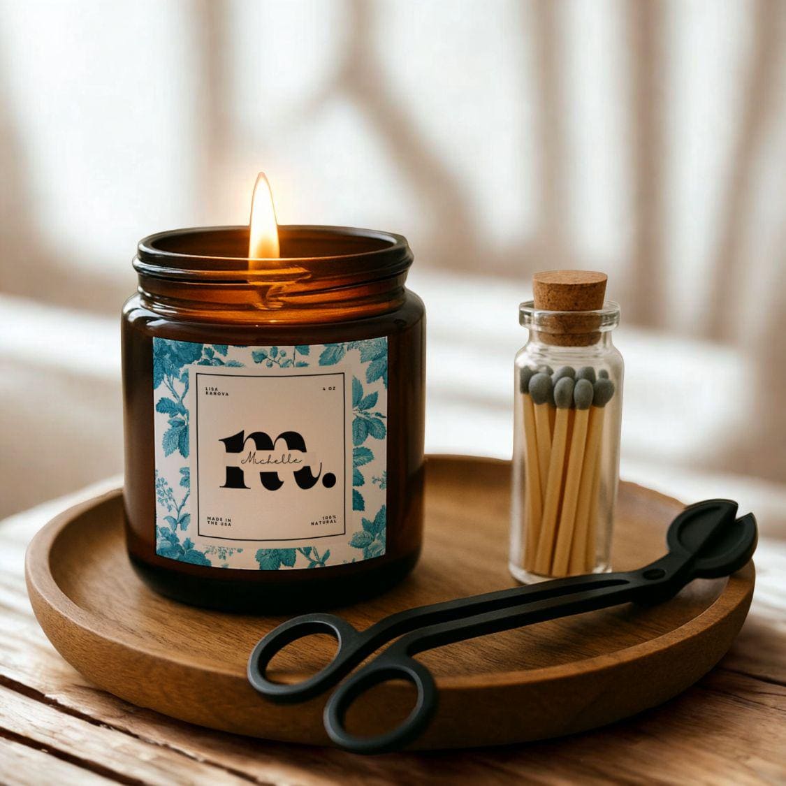 The eco-friendly soy candle delivers a clean, steady burn, enhanced by your customizable label for a personal or branded touch. The wick trimmer keeps the flame performing at its best, while the included matches provide an elegant finishing detail.
