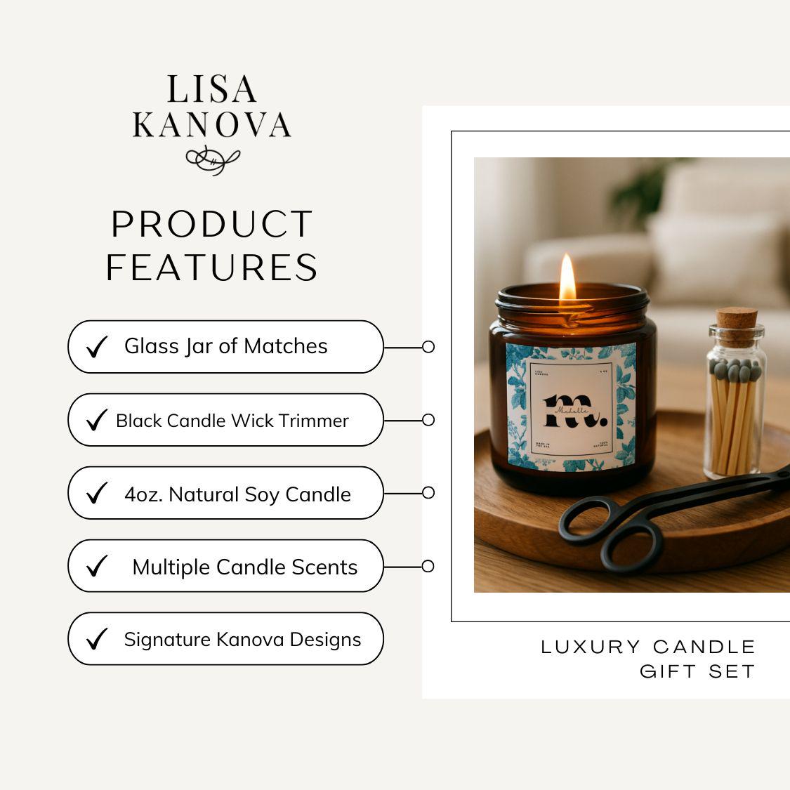 Each set includes a coordinating jar of matches and a matte black wick trimmer, creating a complete candle-lover’s kit that feels luxurious and meaningful. A beautiful customized gift for her, best friend, new home, self-care nights, or holiday gifting — stylish, unique, and ready to delight.