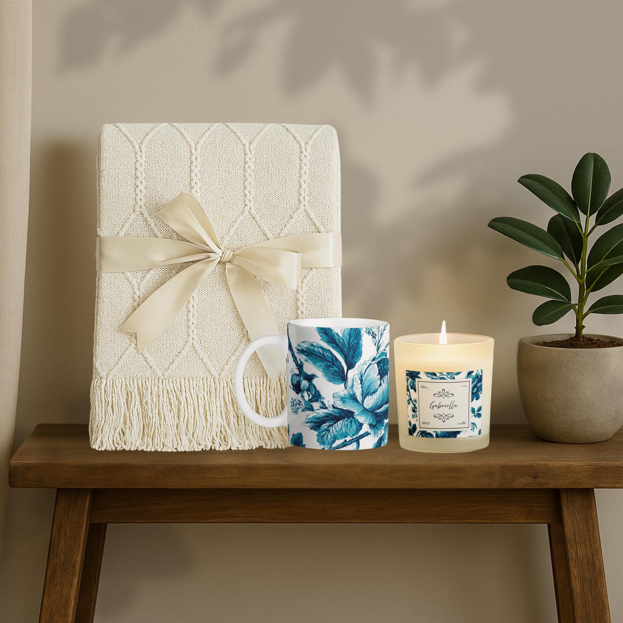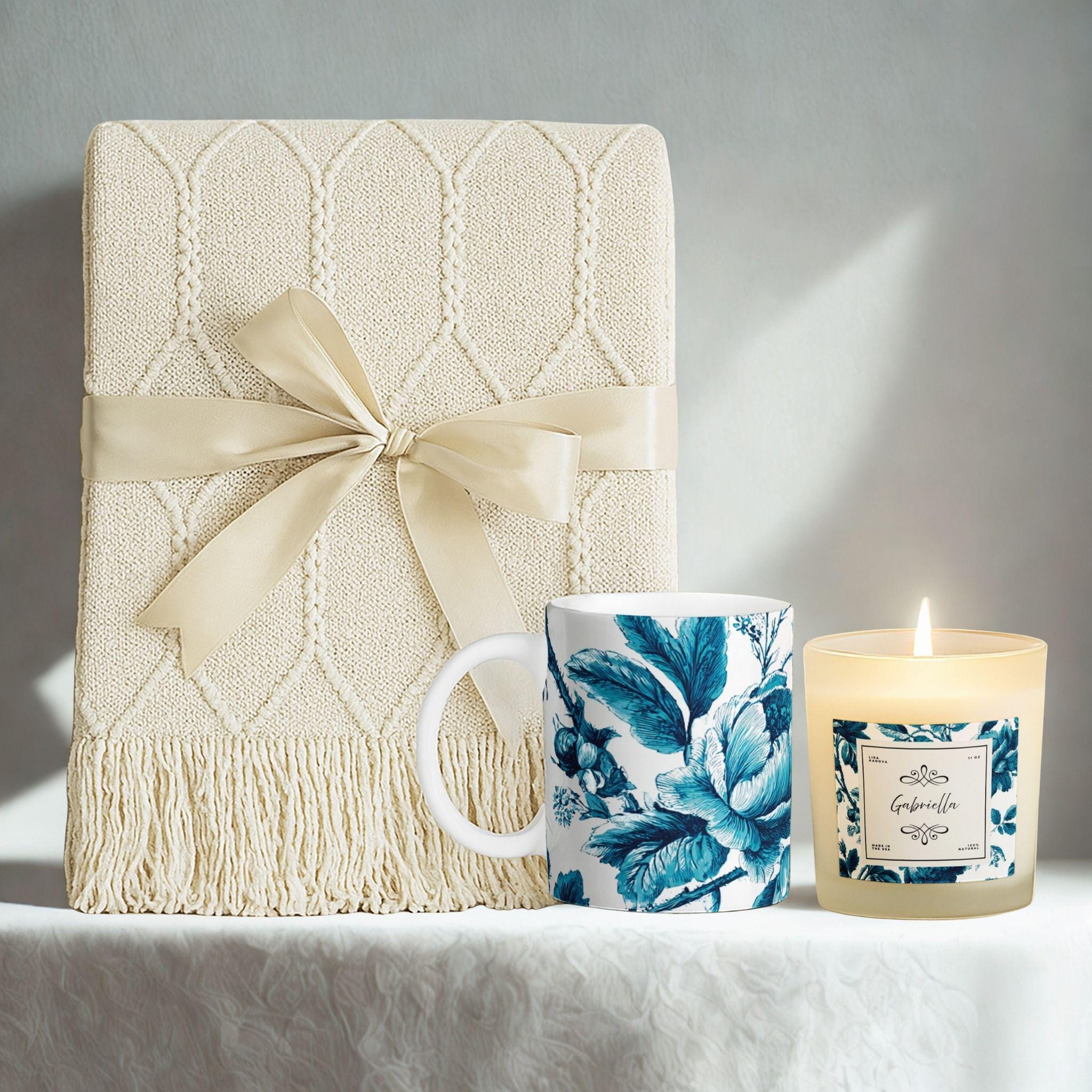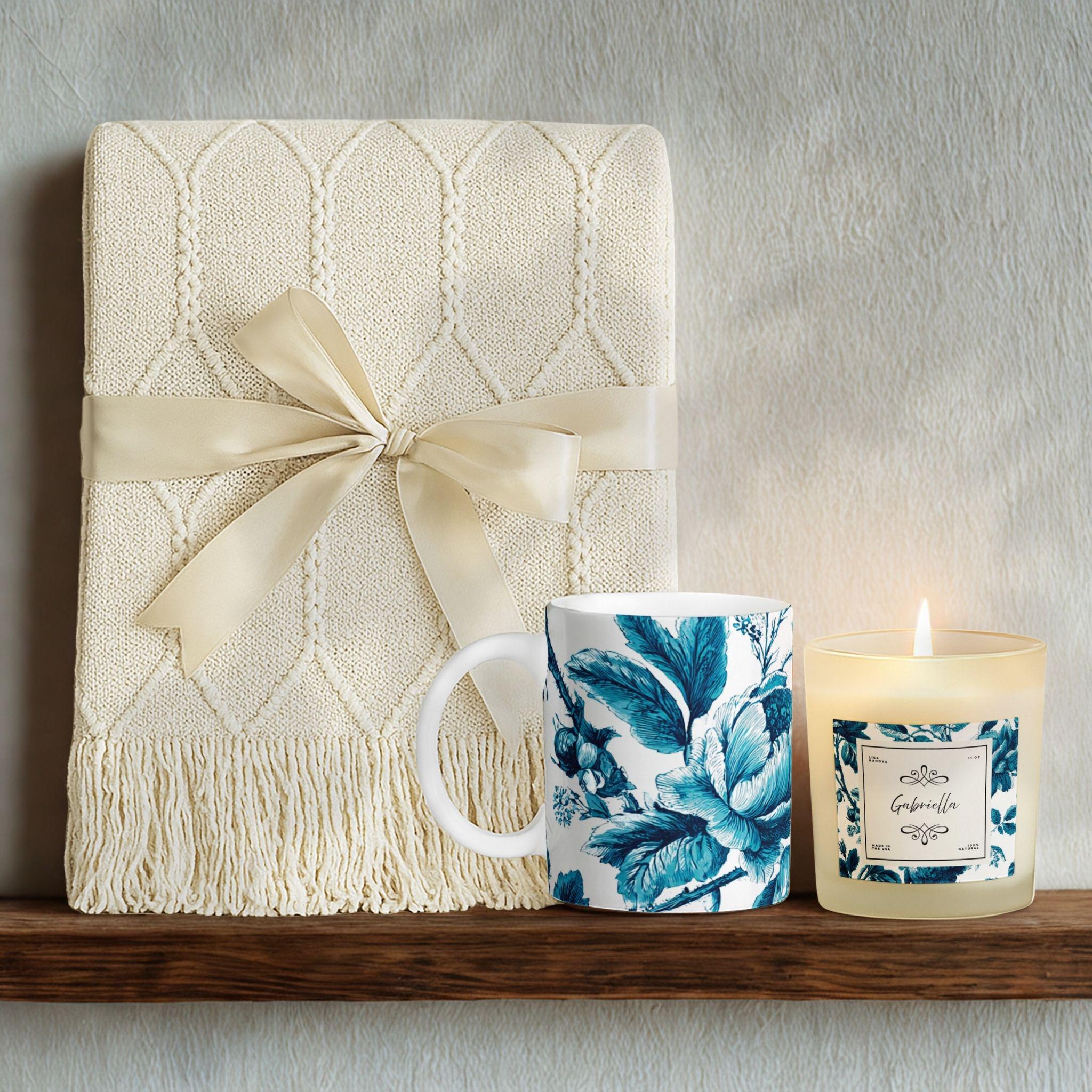 Bring a touch of curated beauty to any moment with this personalized toile gift set. Designed to feel timeless, elegant, and unmistakably special, this three-piece collection transforms everyday comfort into a refined ritual. Each set includes a soft tassel throw, a fine-art floral mug, and a personalized soy candle wrapped in coordinating toile — a blend of classic charm and modern style.