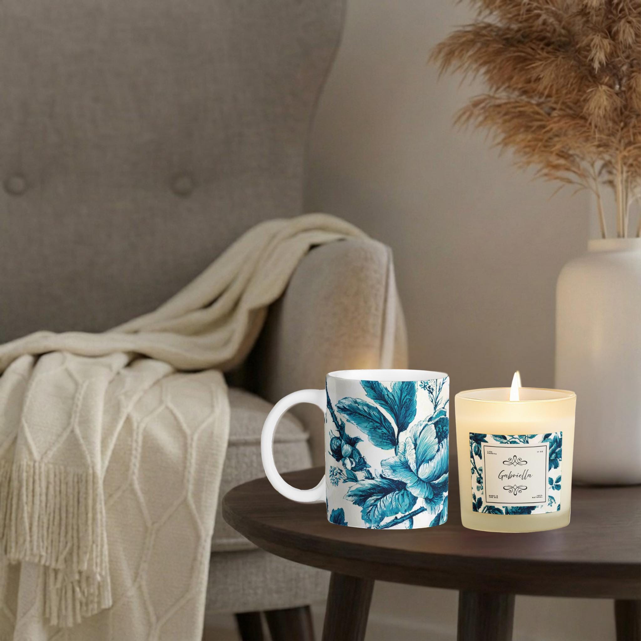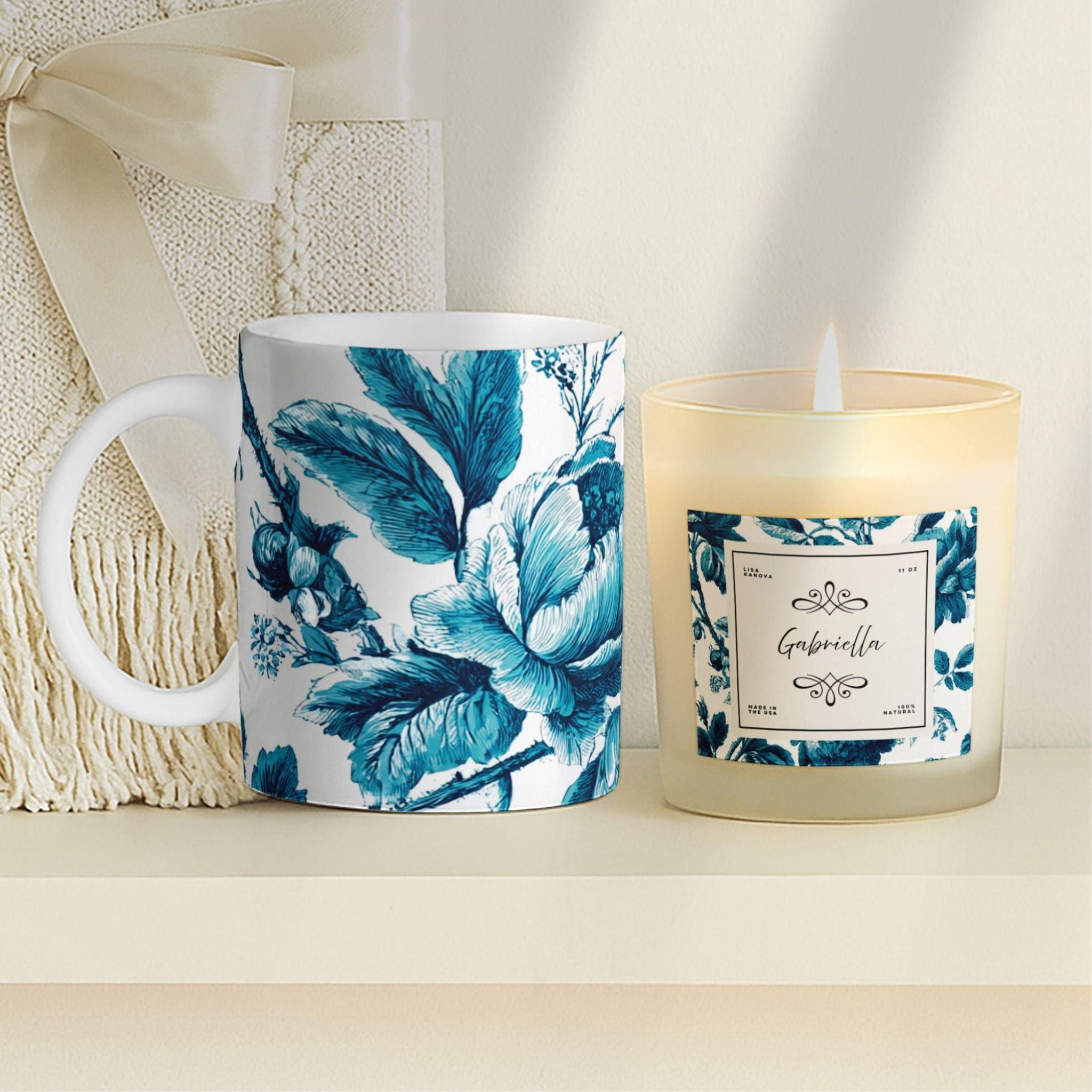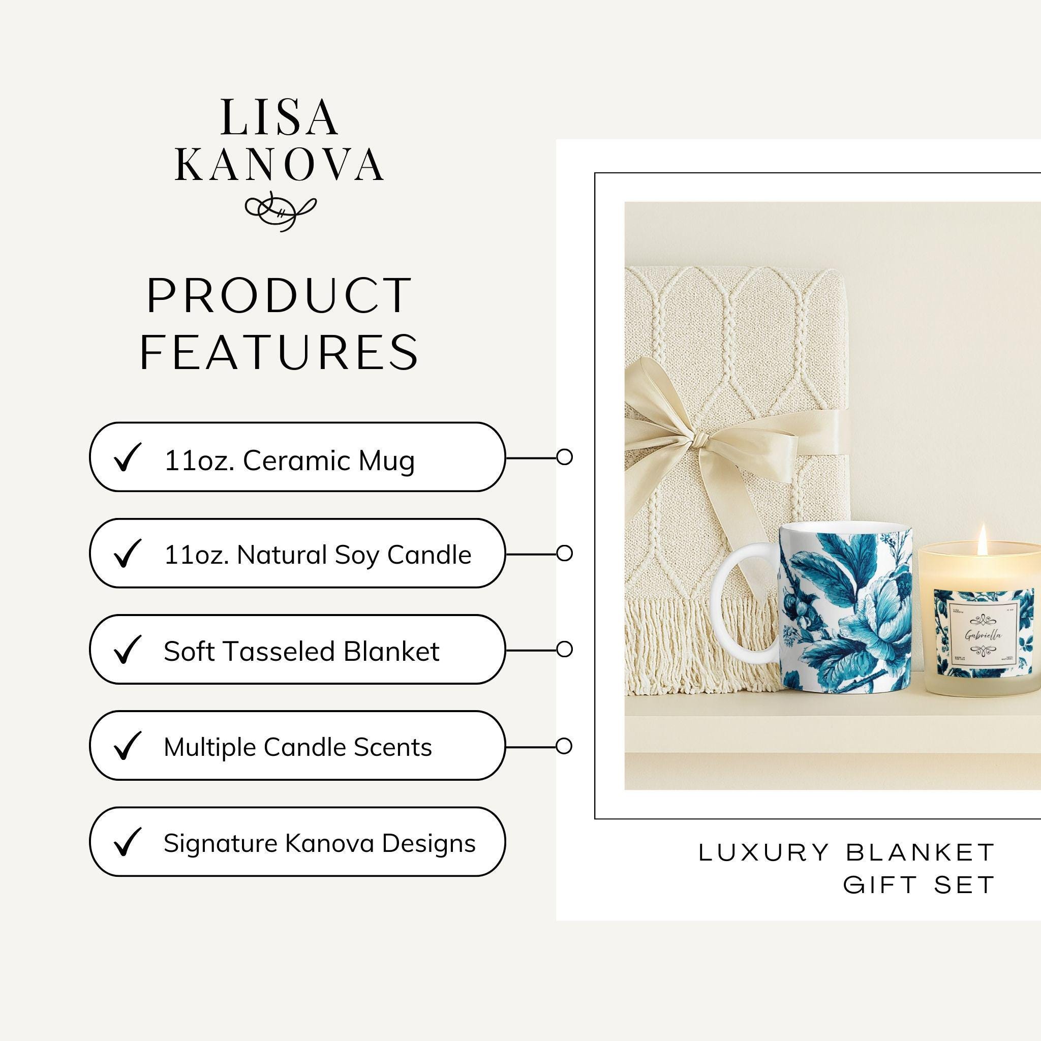Bring a touch of curated beauty to any moment with this personalized toile gift set. Designed to feel timeless, elegant, and unmistakably special, this three-piece collection transforms everyday comfort into a refined ritual. Each set includes a soft tassel throw, a fine-art floral mug, and a personalized soy candle wrapped in coordinating toile — a blend of classic charm and modern style.