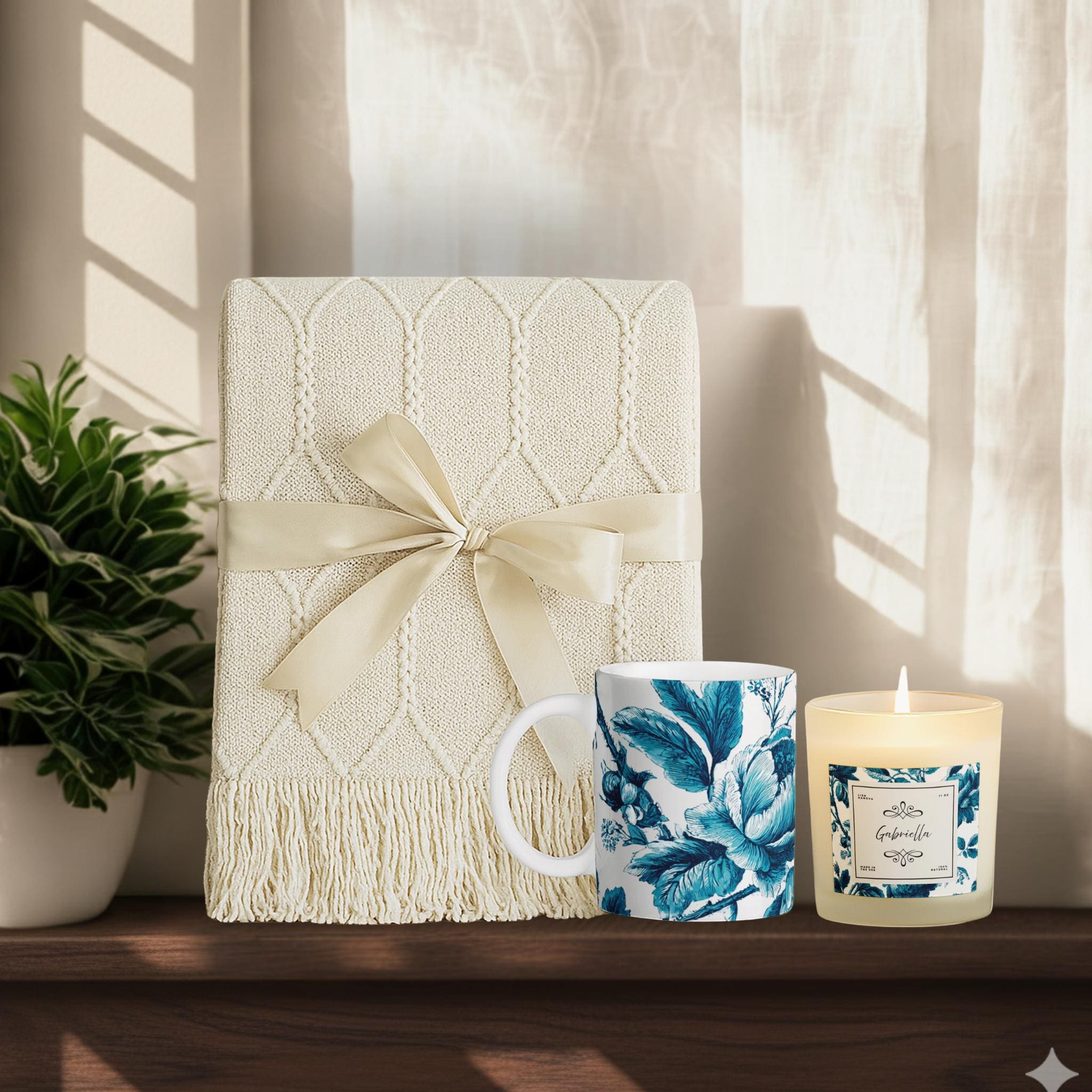 Luxury Personalized Gift Set • Tassel Blanket, 11 oz. Soy Candle & Ceramic Mug