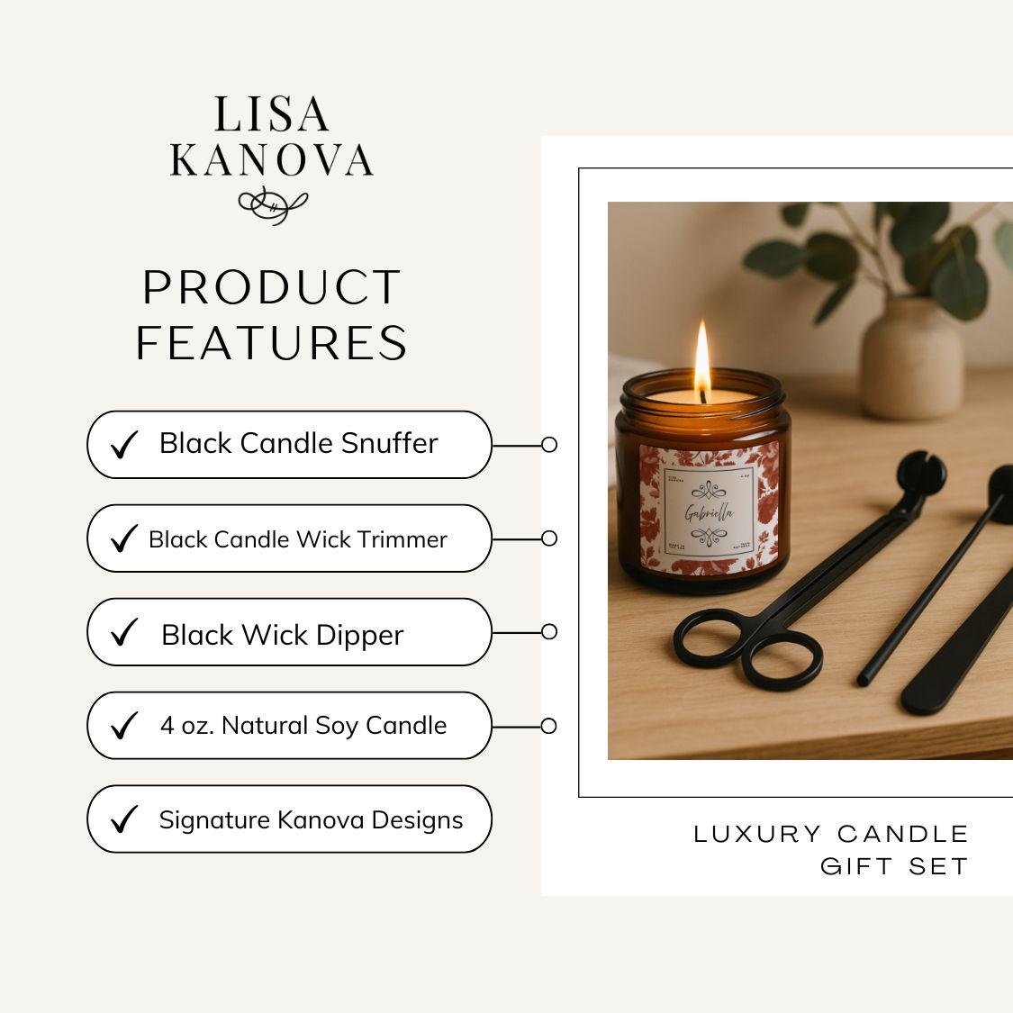 A beautifully curated gift for candle lovers, self-care seekers, and anyone who appreciates refined little luxuries. This complete Candle Care Gift Set features a 4 oz natural soy candle paired with a trio of matte-black tools that elevate every burn. Elegant, functional, and crafted with intention — it’s a modern keepsake designed to turn simple candle moments into a soothing ritual.