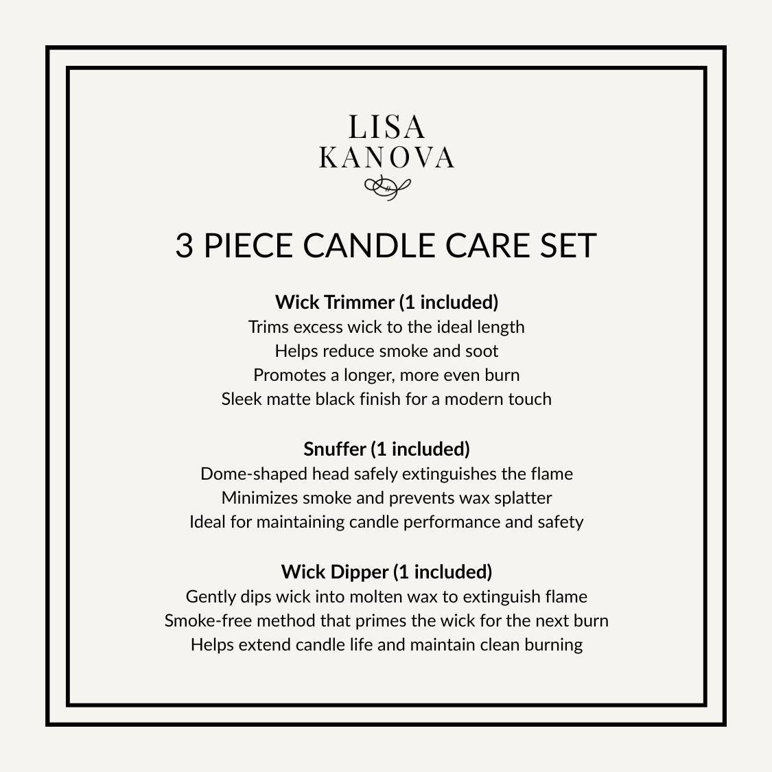 Inside, you’ll find a clean-burning soy candle and three essential tools: a wick trimmer for optimal burn length, a candle snuffer for smoke-free extinguishing, and a wick dipper for maintaining wick health. Each piece works together to enhance safety, longevity, and fragrance quality, creating a thoughtful and timeless gift experience.