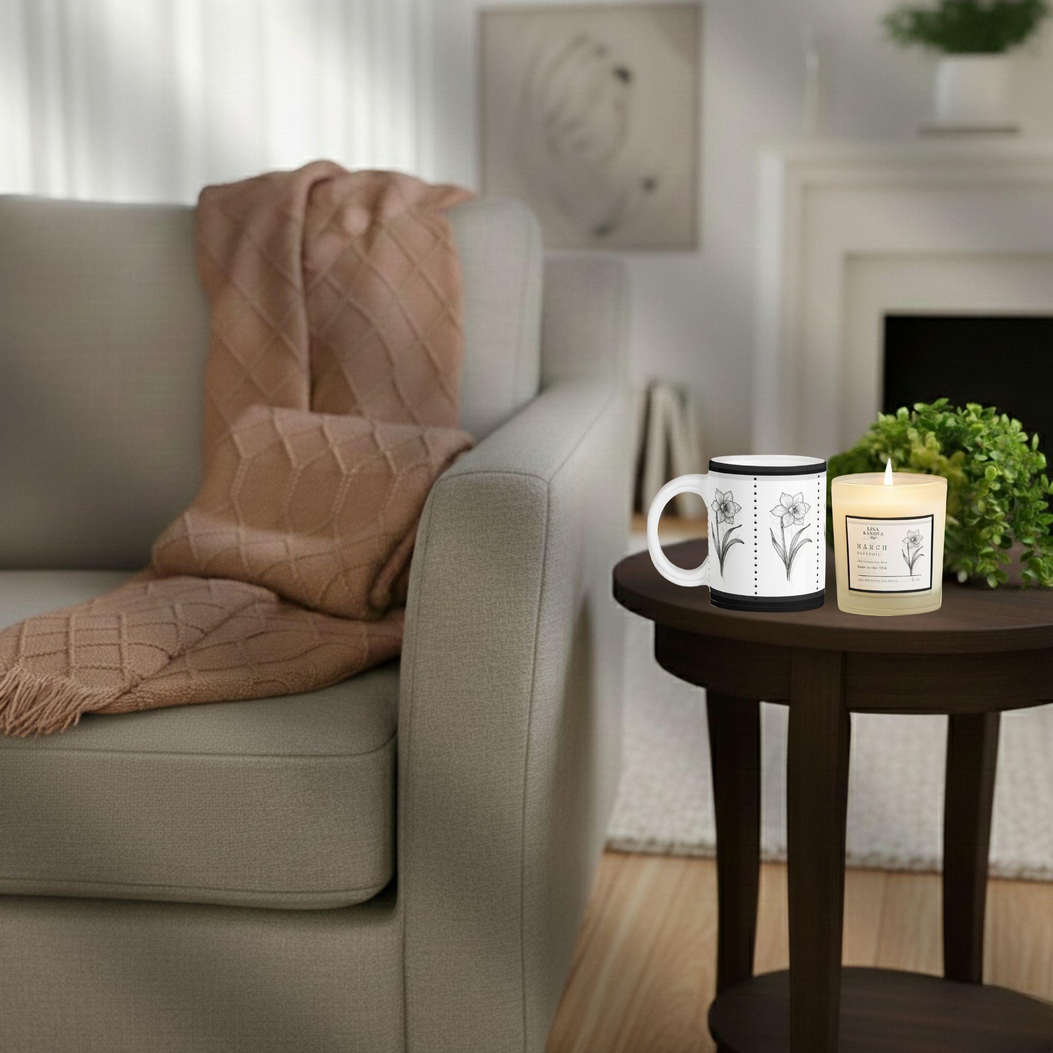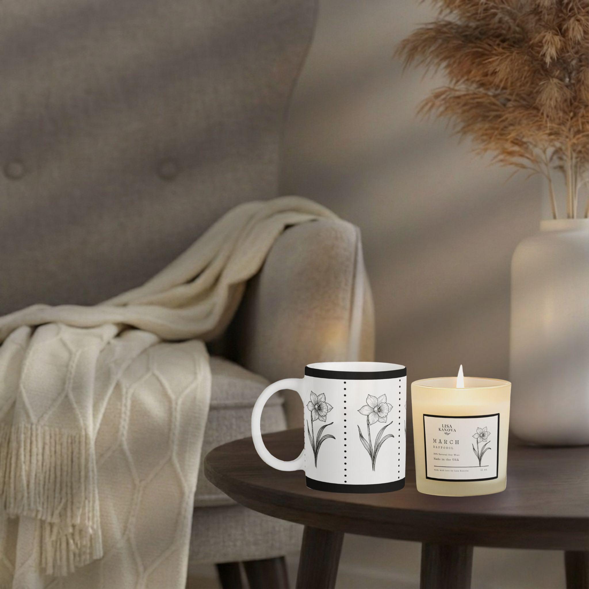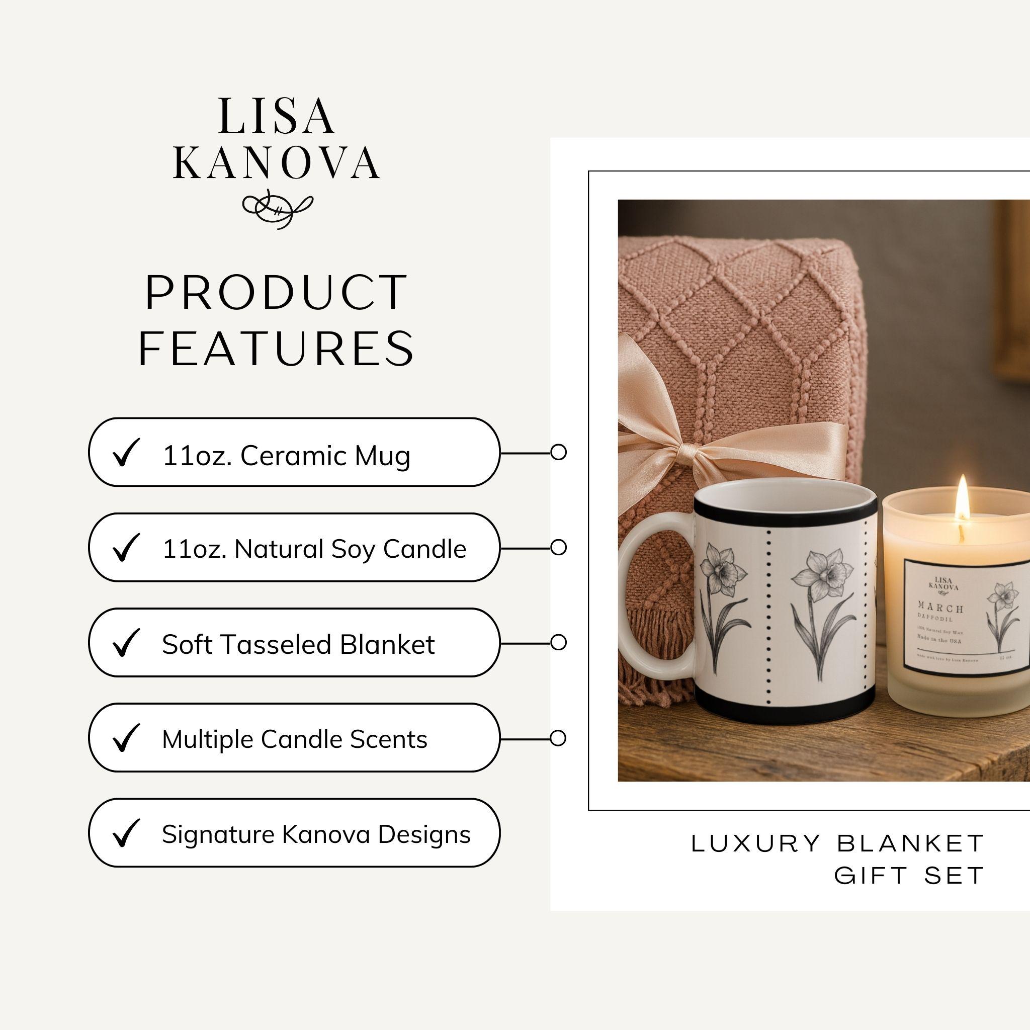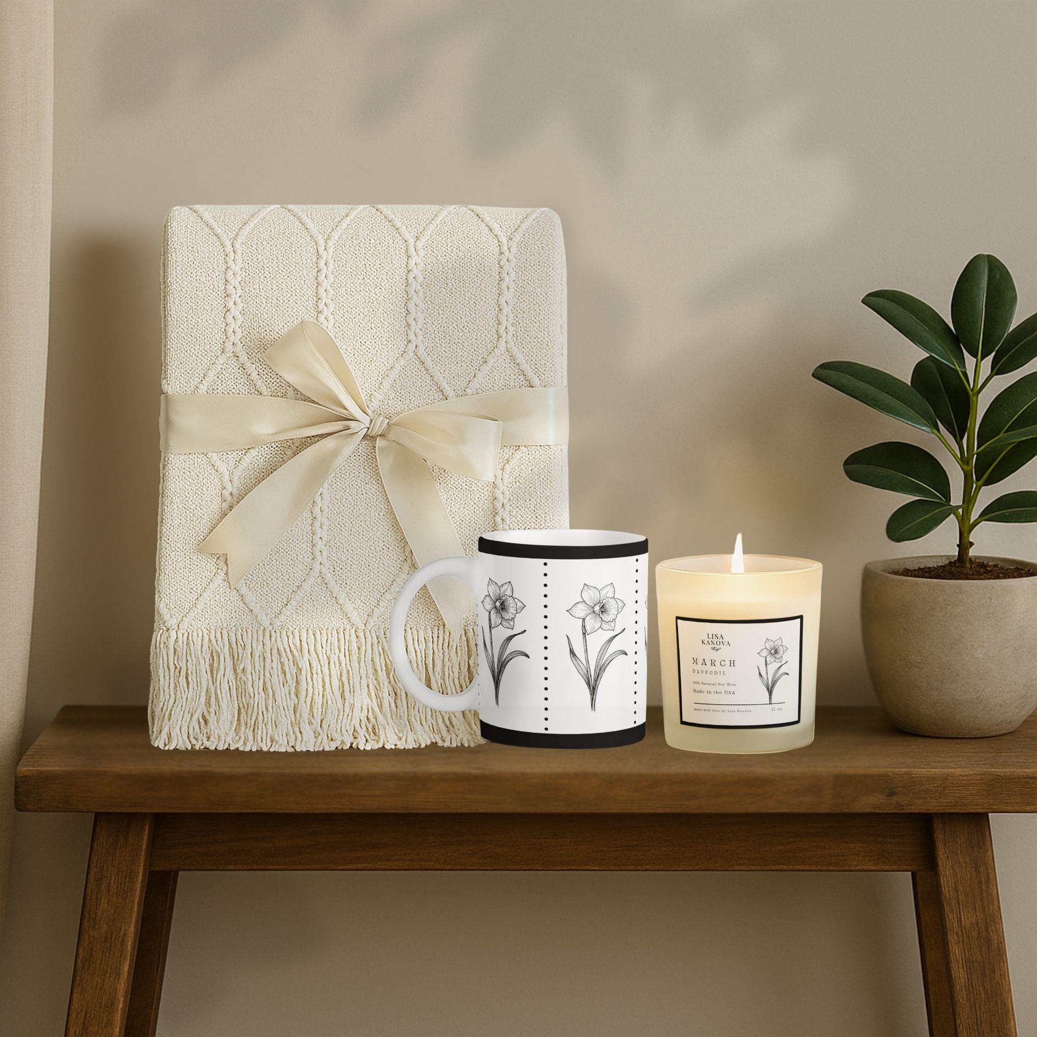 Bring a touch of curated beauty to any moment with this trendy and chic birth flower botanical motif. Designed to feel timeless, elegant, and unmistakably special, this three-piece collection transforms everyday comfort into a refined ritual. Each set includes a soft tassel throw, a fine-art floral mug, and a scented soy candle — a blend of classic charm and modern style.