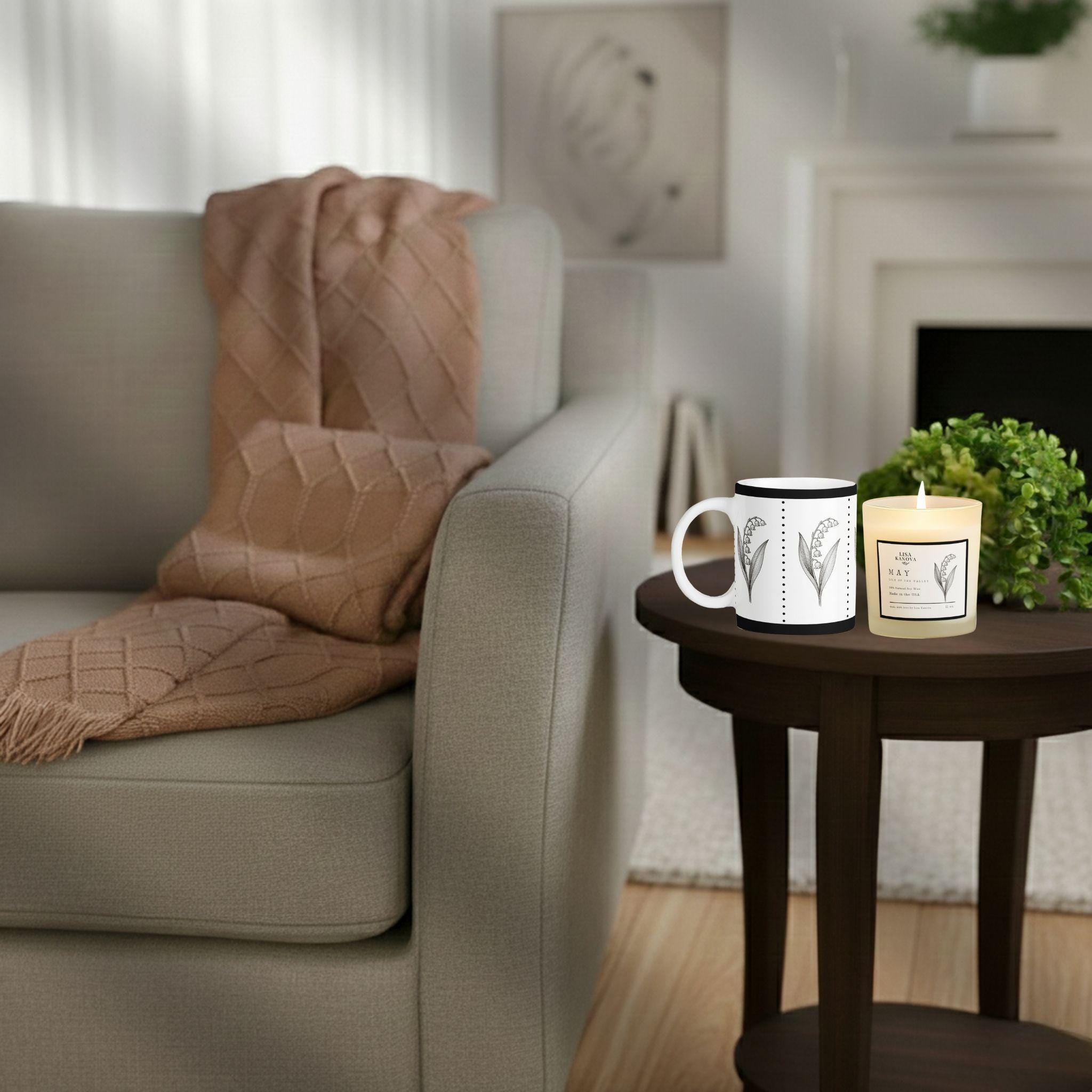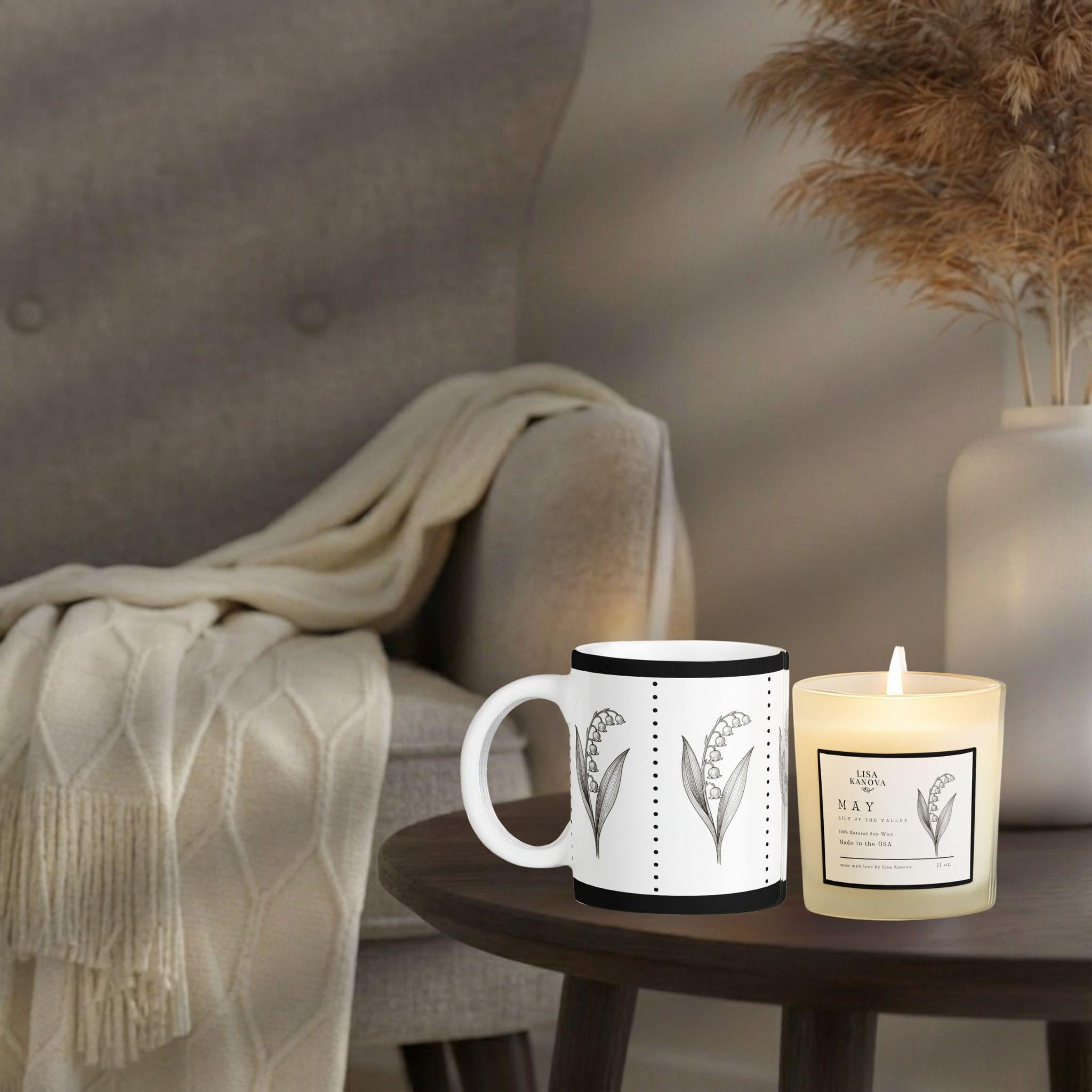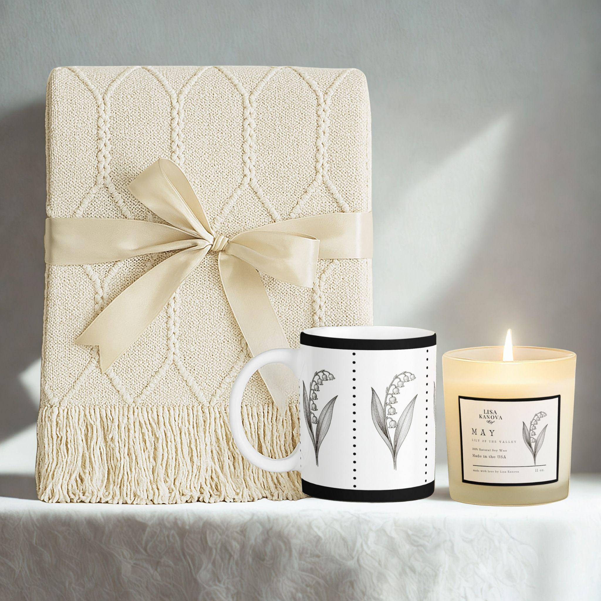 Bring a touch of curated beauty to any moment with this trendy and chic birth flower botanical motif. Designed to feel timeless, elegant, and unmistakably special, this three-piece collection transforms everyday comfort into a refined ritual. Each set includes a soft tassel throw, a fine-art floral mug, and a scented soy candle — a blend of classic charm and modern style.