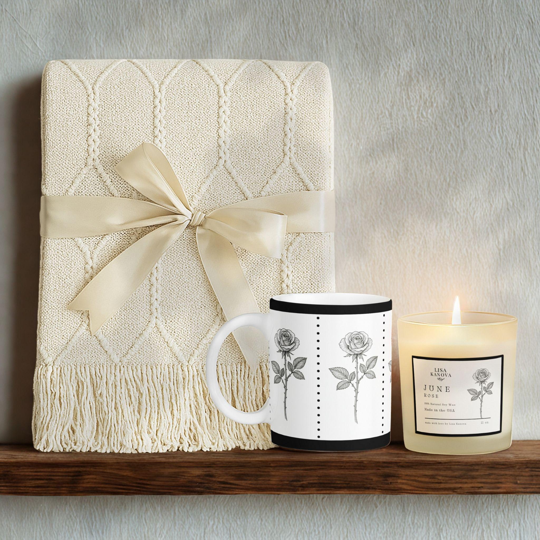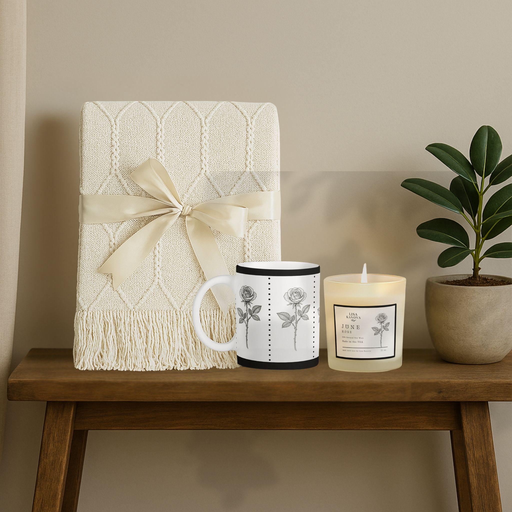 June Rose Gift Set • Tassel Blanket, Art Mug & Soy Candle
