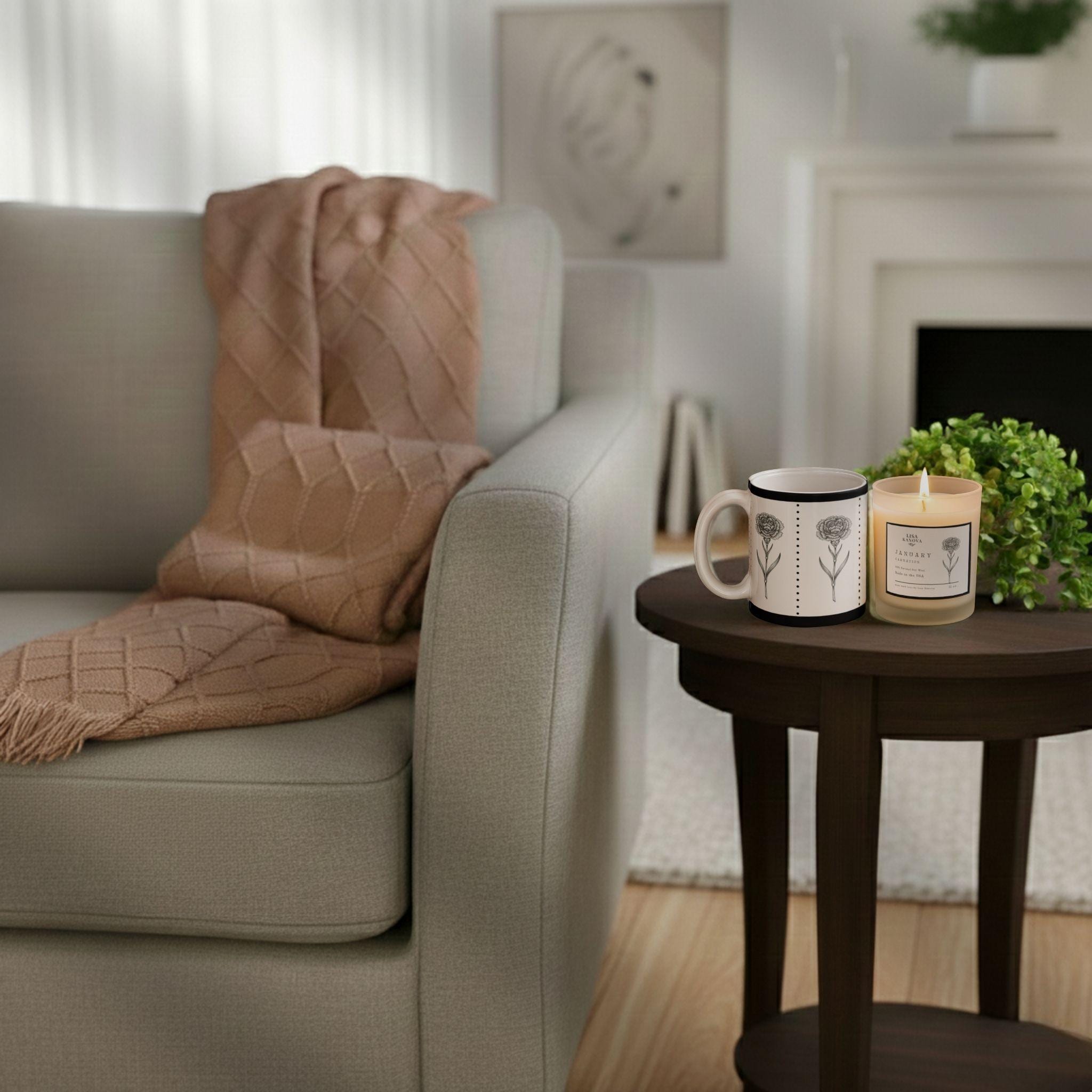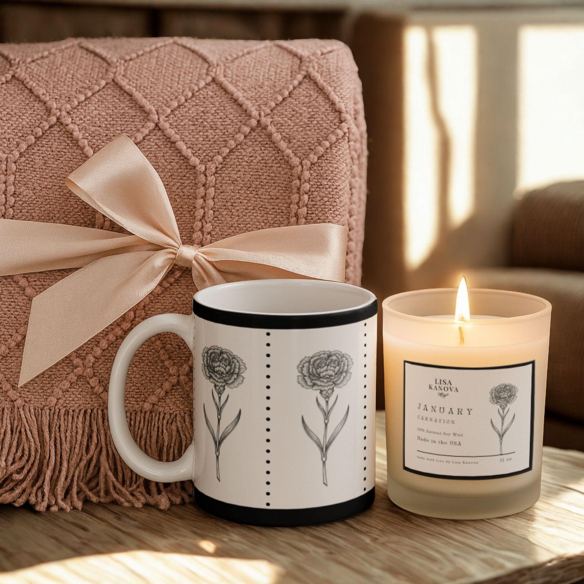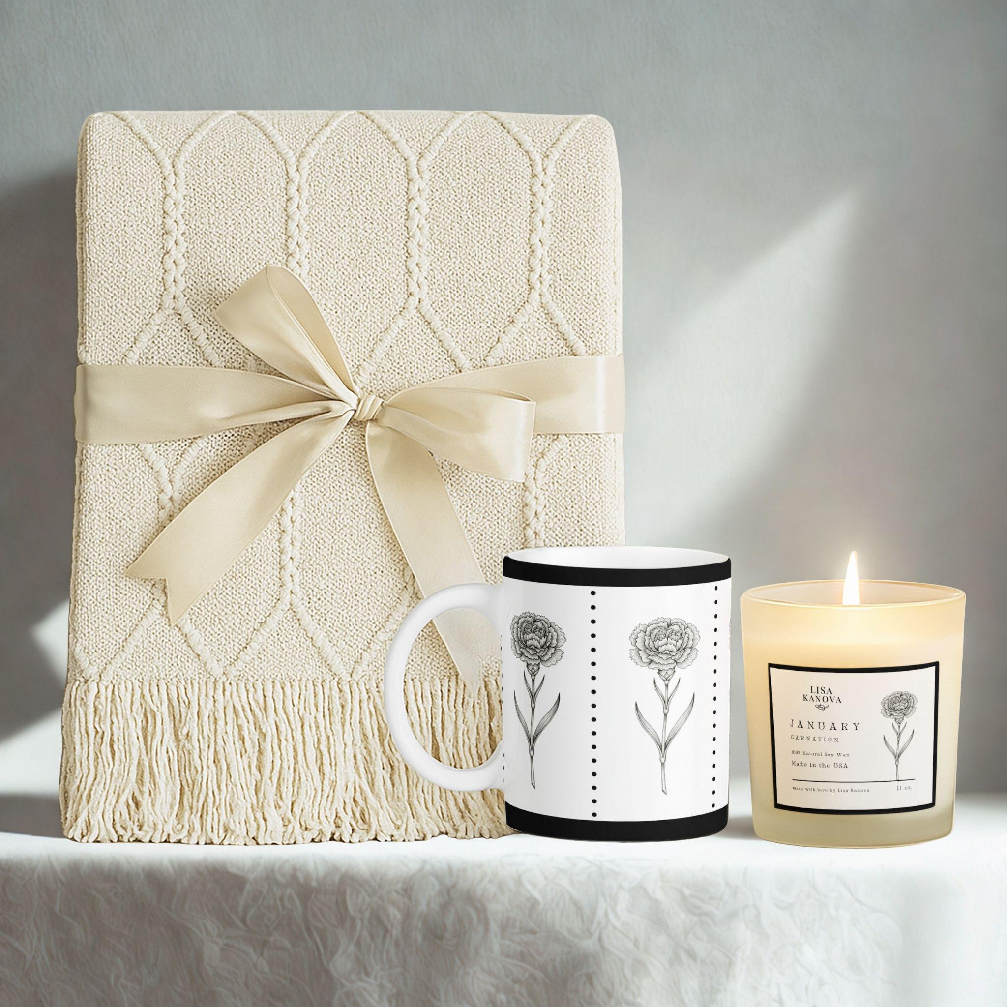 Bring a touch of curated beauty to any moment with this trendy and chic birth flower botanical motif. Designed to feel timeless, elegant, and unmistakably special, this three-piece collection transforms everyday comfort into a refined ritual. Each set includes a soft tassel throw, a fine-art floral mug, and a scented soy candle — a blend of classic charm and modern style.