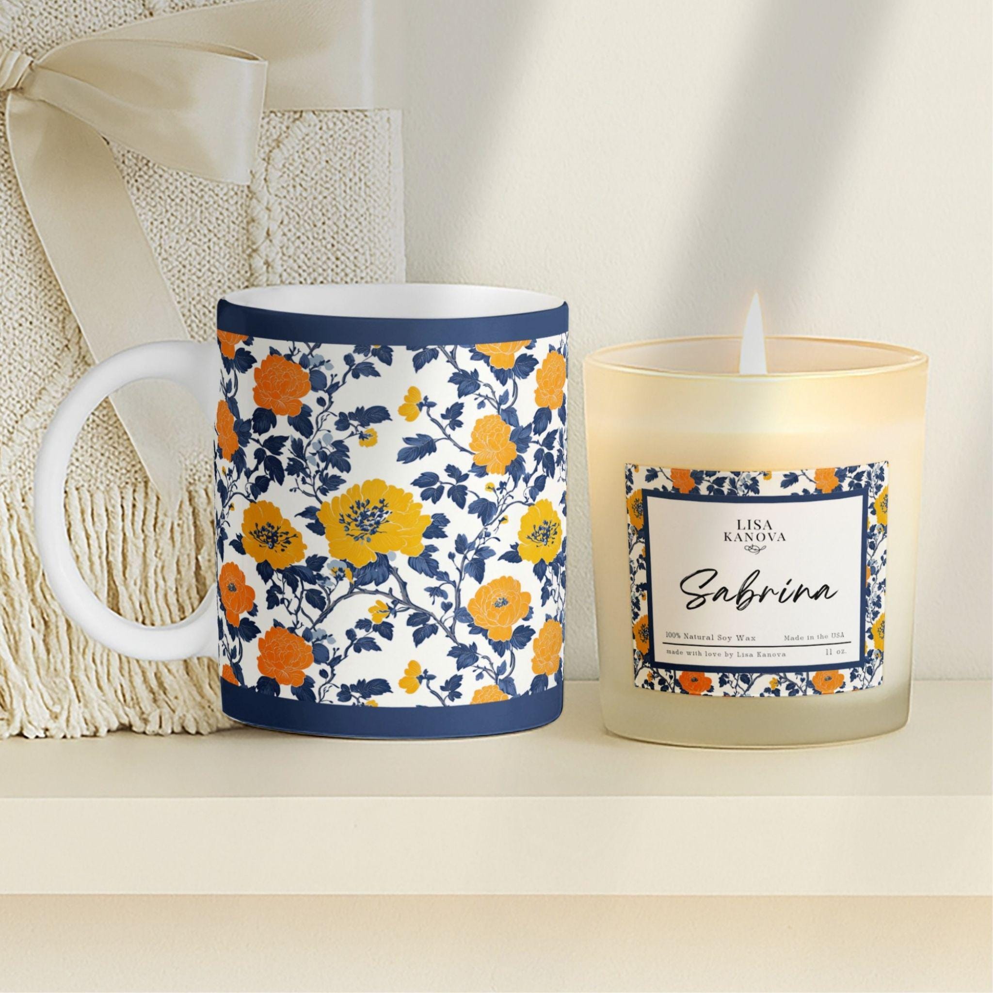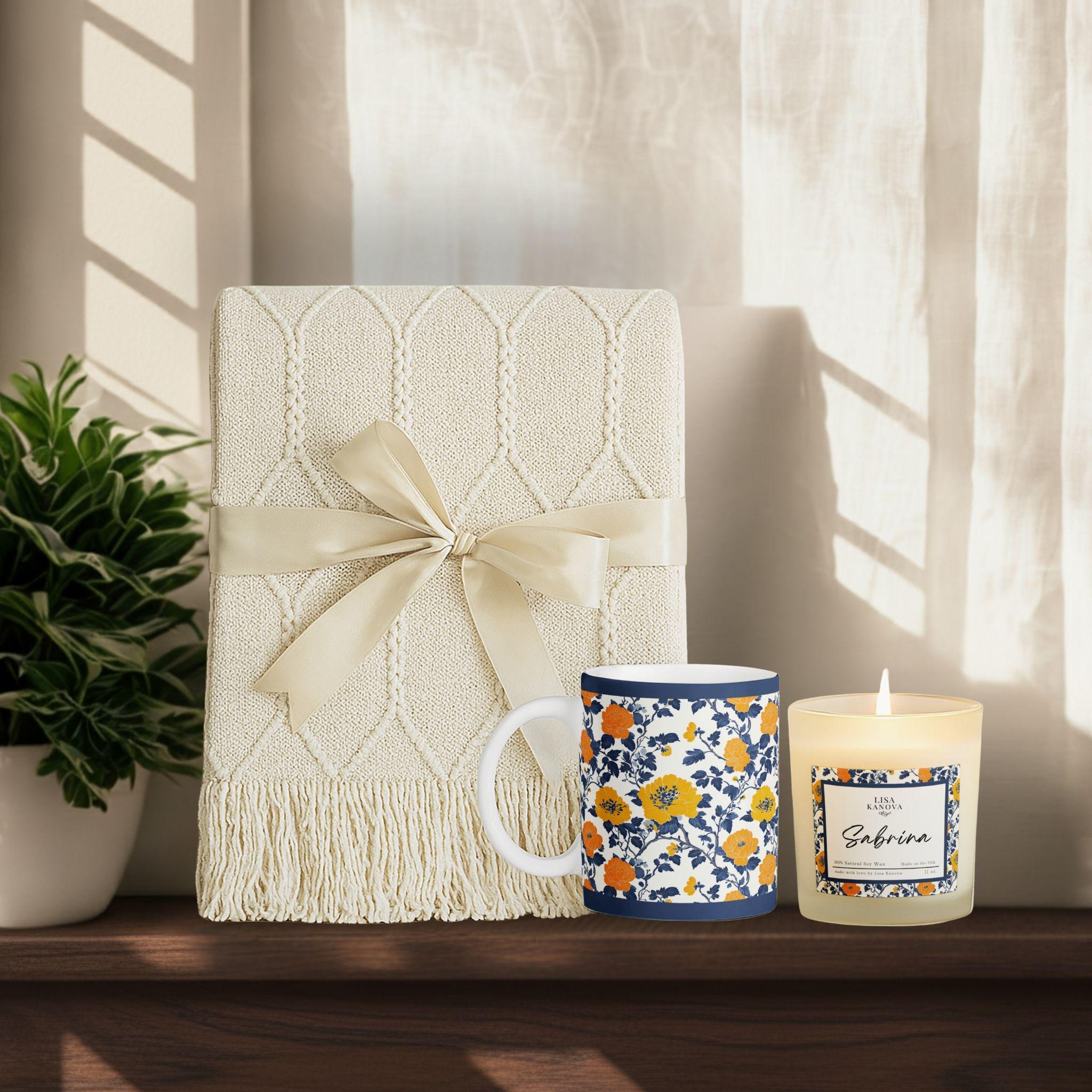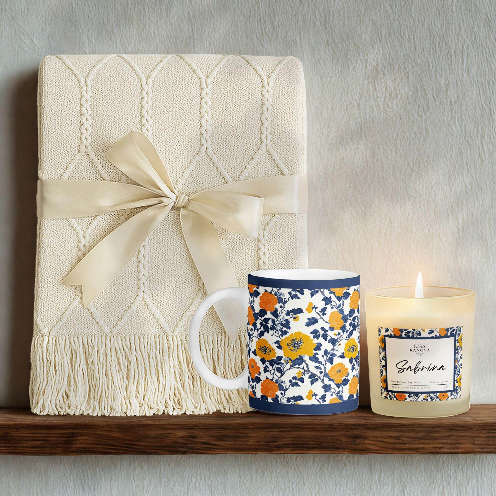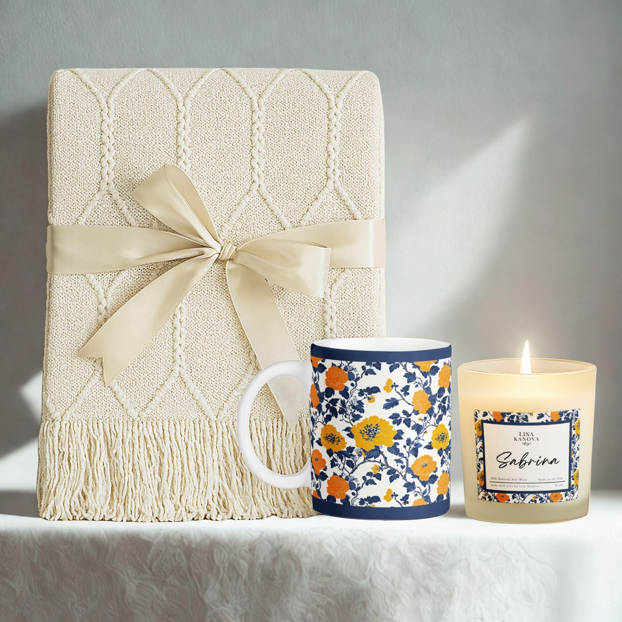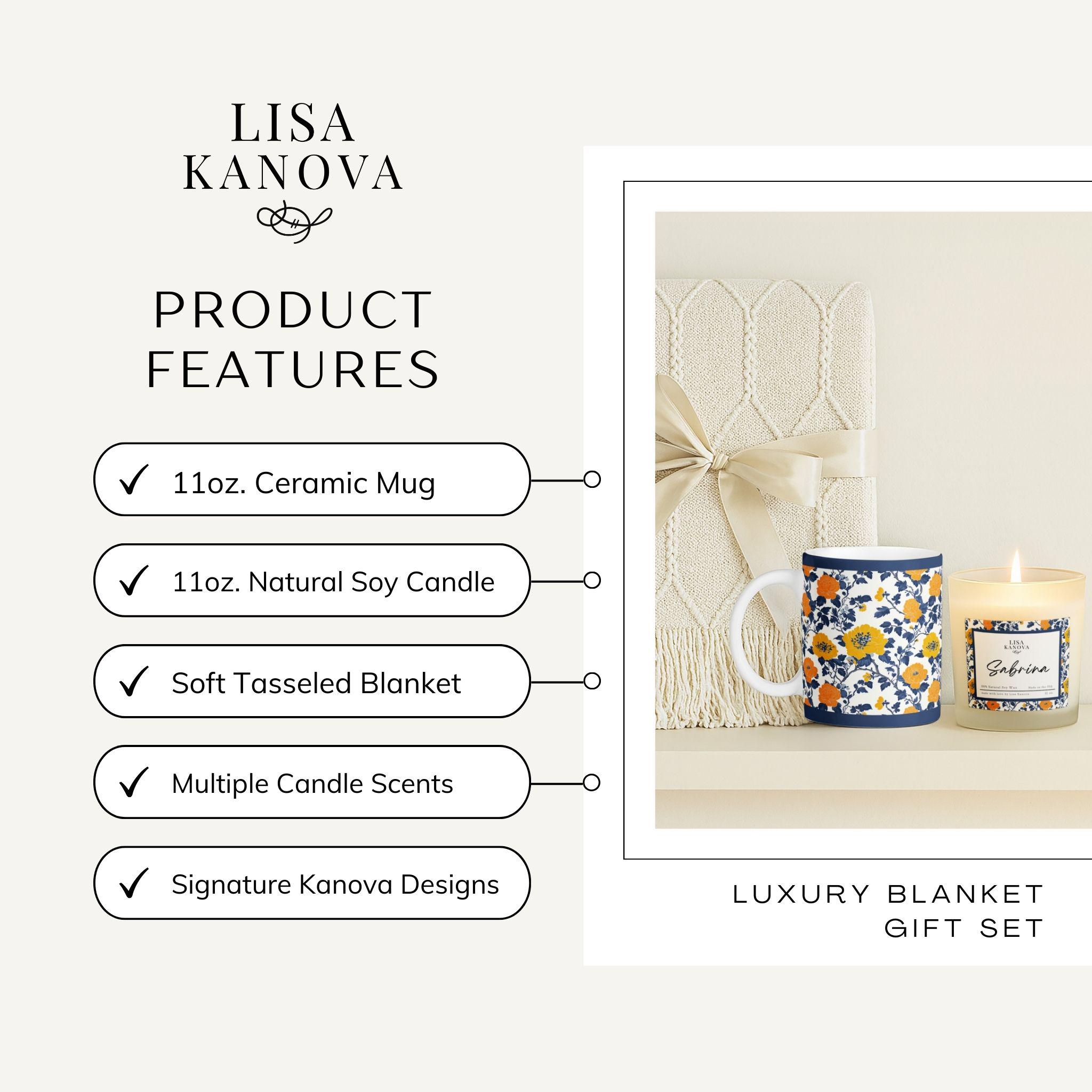 Luxury Blanket, Mug & Candle Gift Set • Exclusive Kanova Toile Collection • Personalized Gift Box in Kanova Blue and Orange