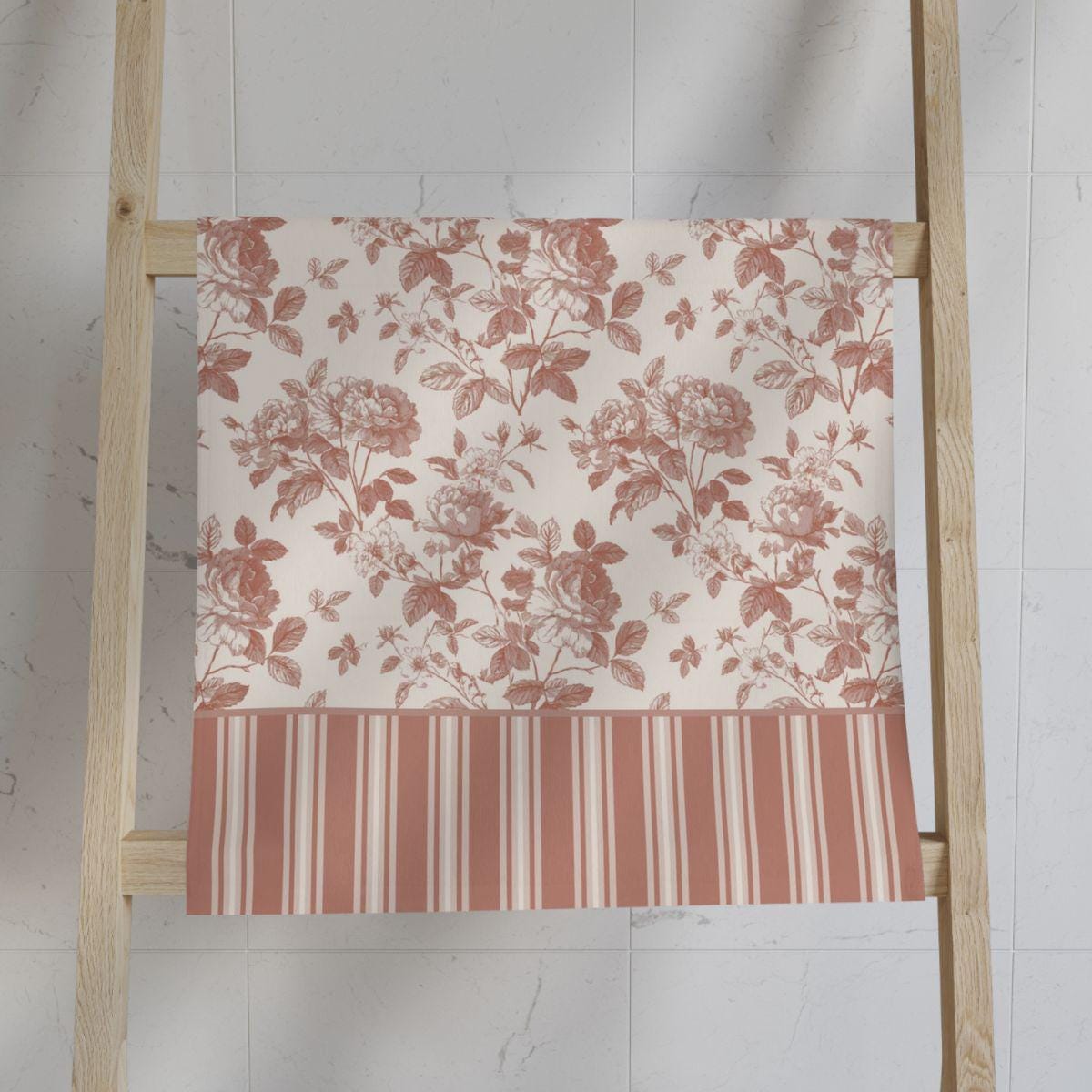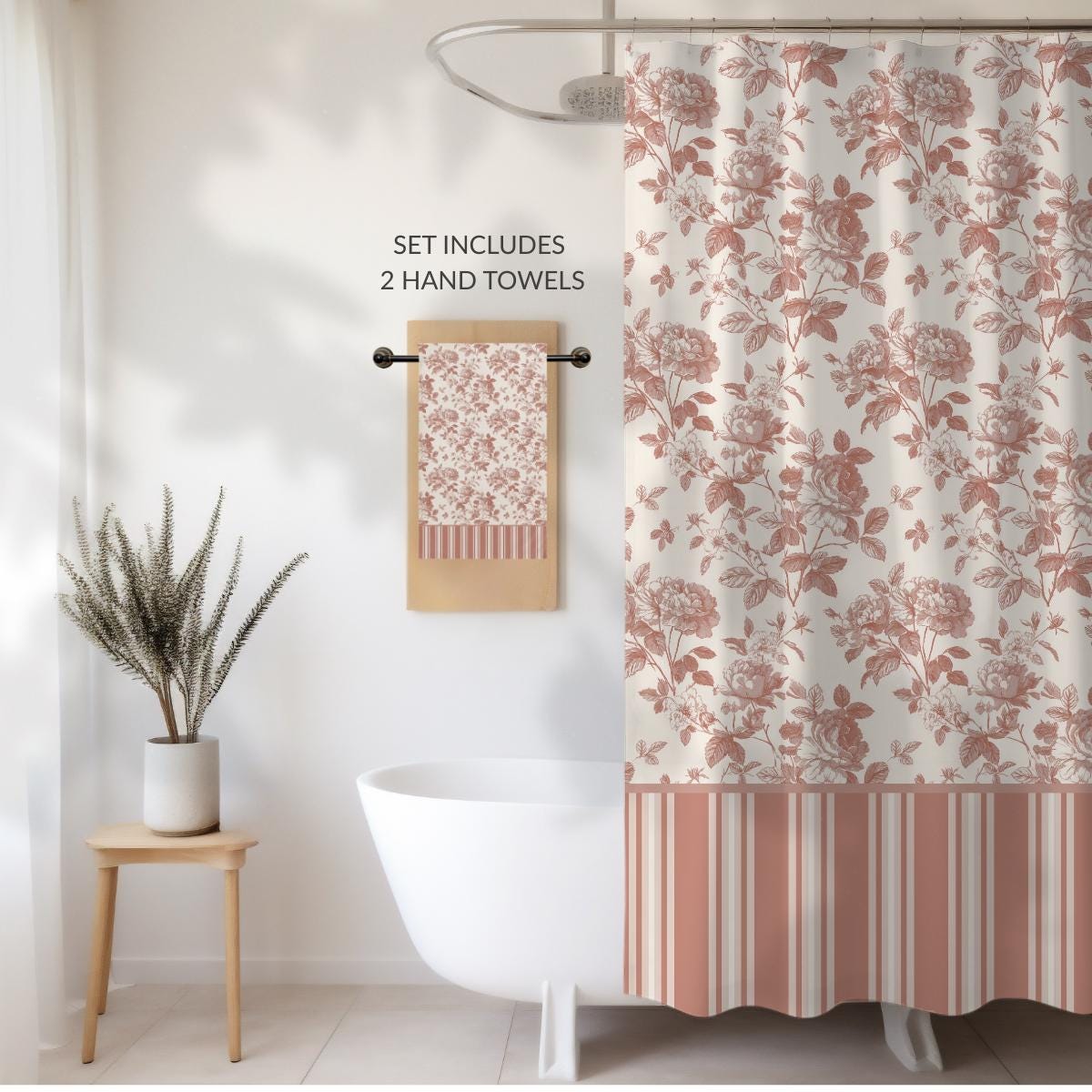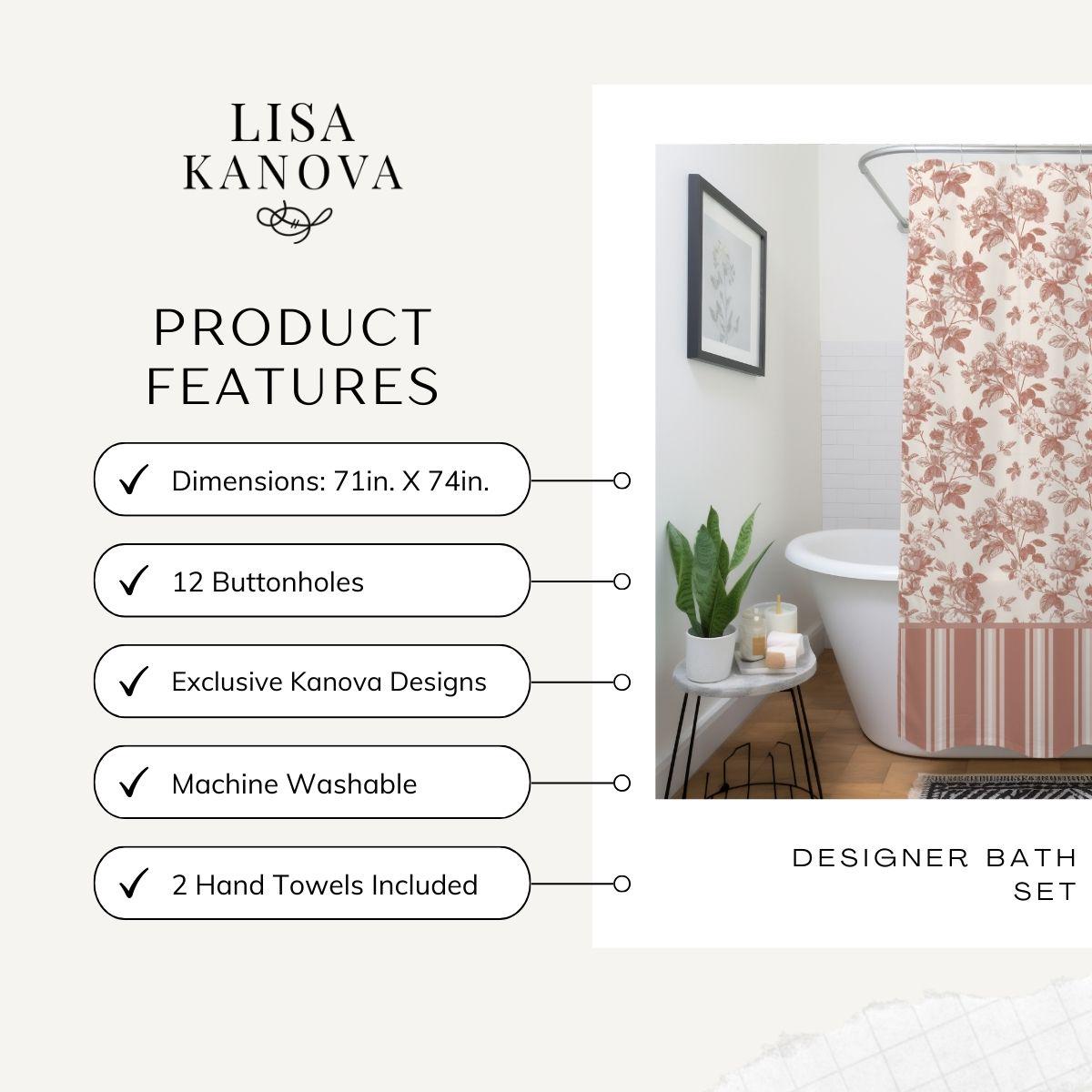 Transform your bathroom into a soft, romantic retreat with this blush-toned Kanova Designer Bath Set. The vintage floral toile brings that timeless elegance you only find in boutique interiors, while the coordinating striped border adds a tailored, high-end finish that looks intentionally styled. This thoughtfully curated set includes two matching hand towels for a beautifully cohesive look that feels luxurious, warm, and effortlessly elevated. Perfect for anyone craving charm, calm, and a bathroom that feels like an escape.