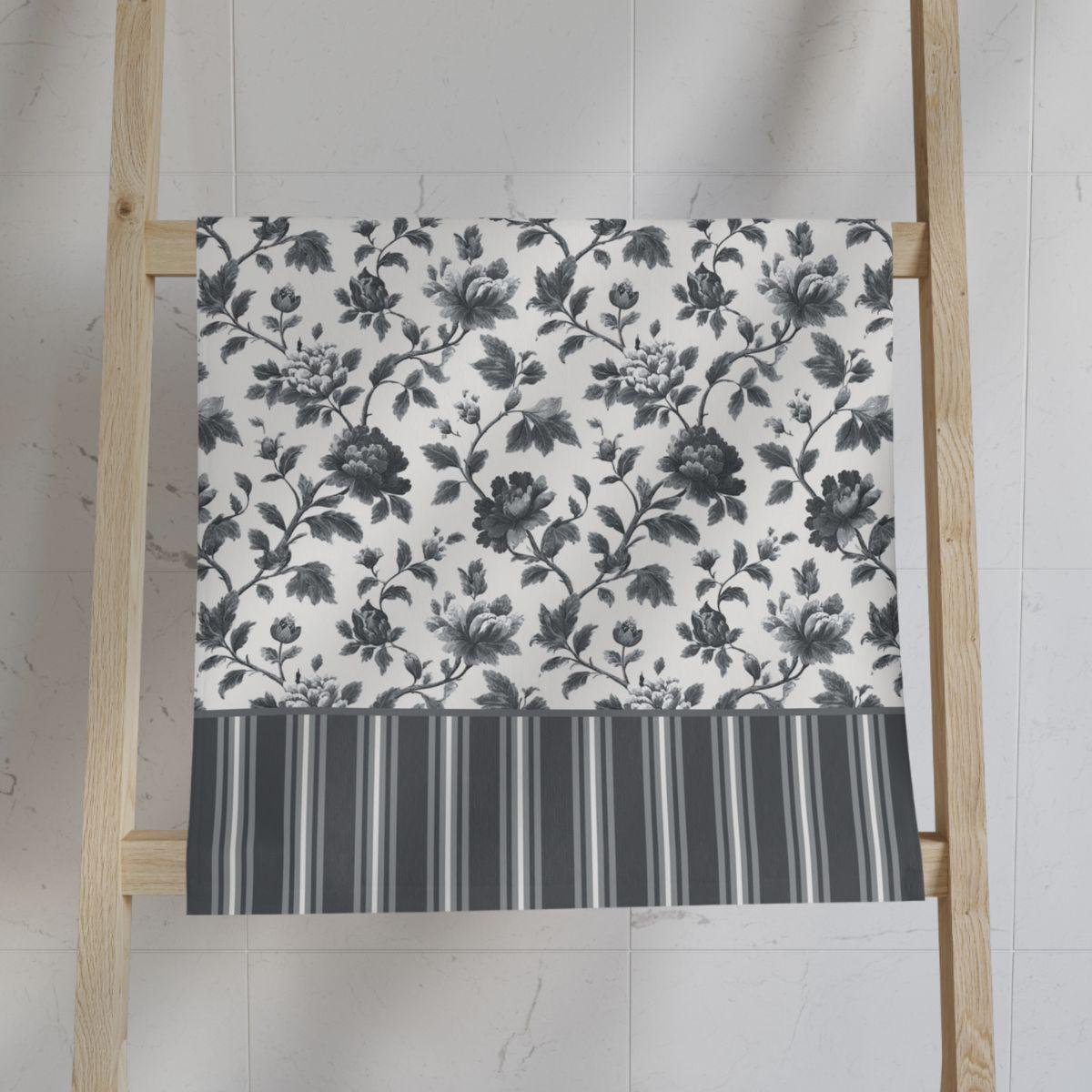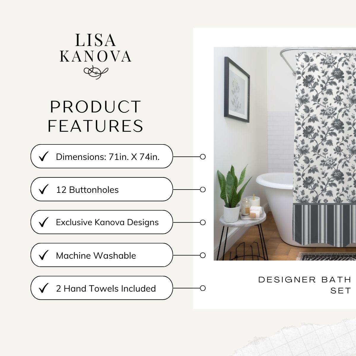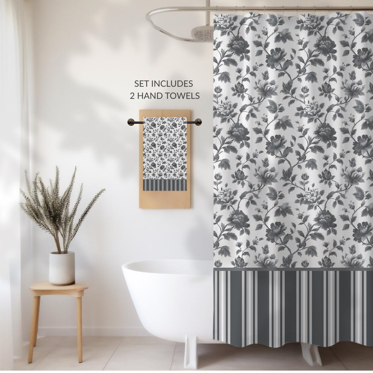 Bring effortless sophistication to your bathroom with the Kanova Charcoal Floral Bath Set—a moody, modern classic that feels straight out of a boutique spa. The vintage-inspired floral print pairs beautifully with the tailored striped hem, creating a look that feels elevated, intentional, and quietly luxurious. Complete with two coordinating hand towels, this set instantly transforms your space into a designer moment without a full renovation. Chic, timeless, and surprisingly easy to style—this is your new signature bathroom upgrade.