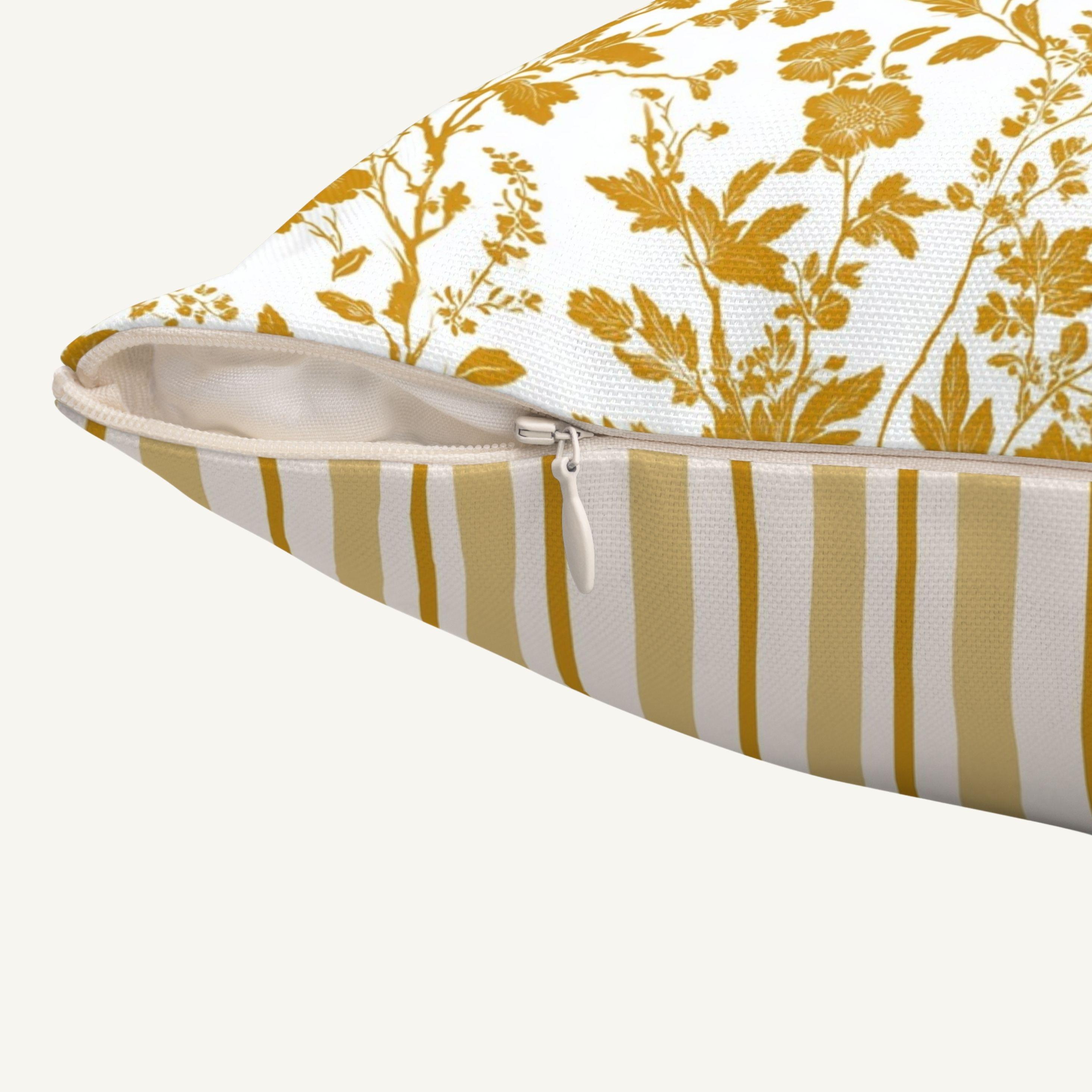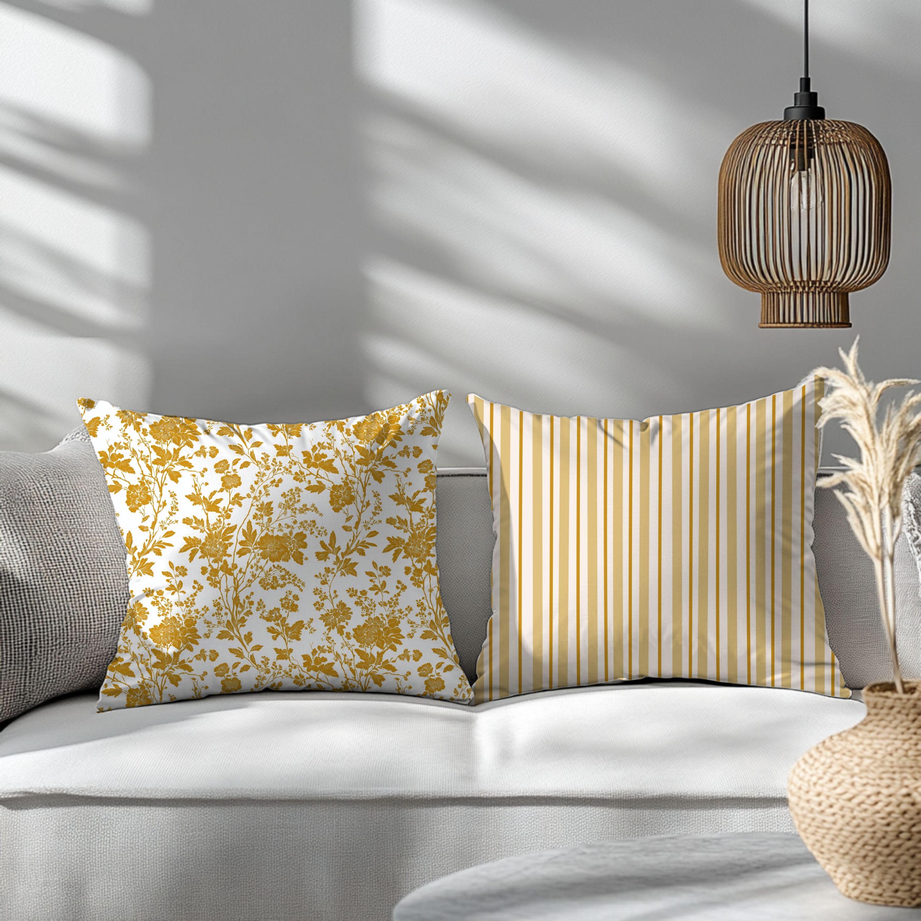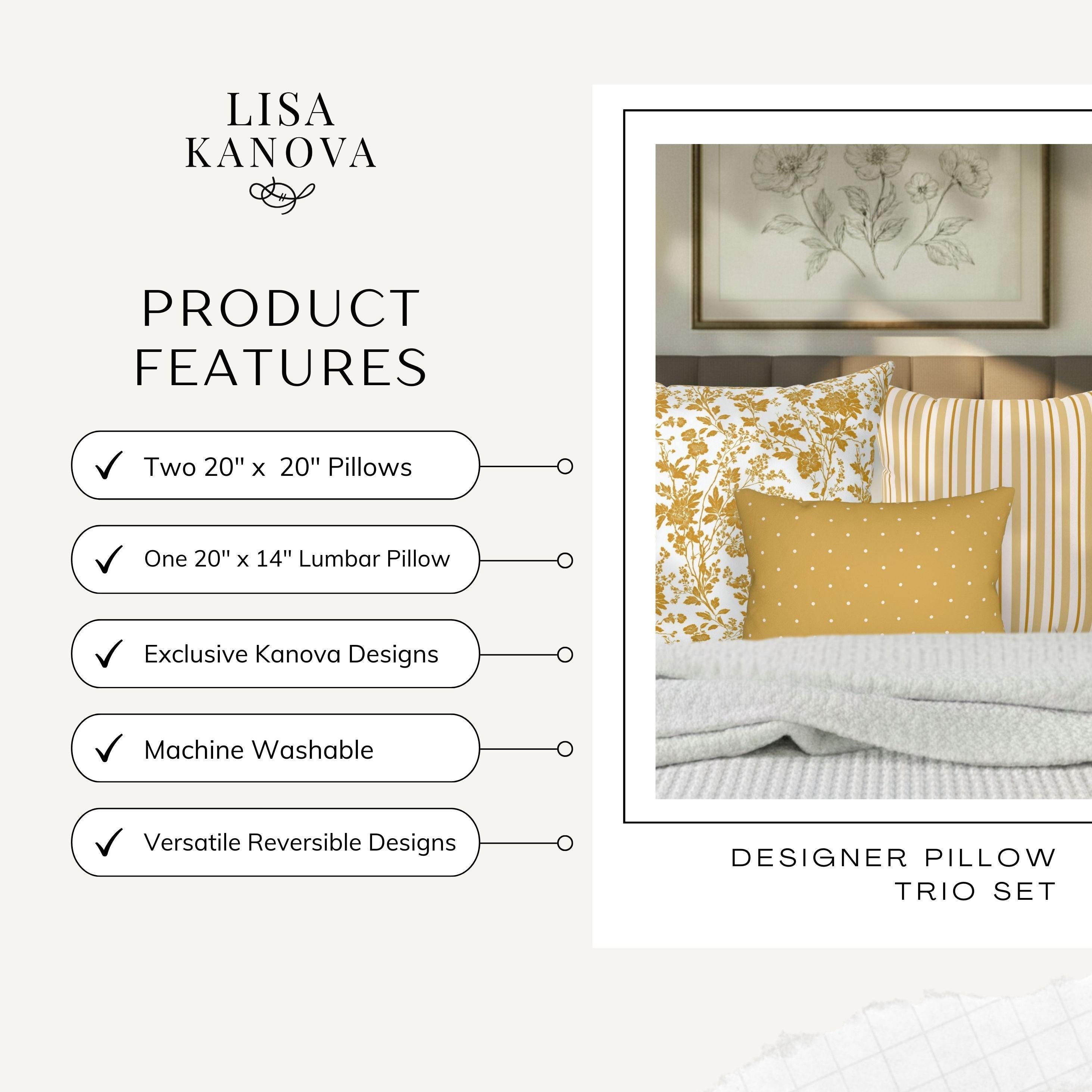 Kanova Designer Pillow Trio – Toile + Stripe + Dotted Lumbar | 2 x 20" Pillows + 20x14 Lumbar | Vintage Bedding | Heirloom Gold Set