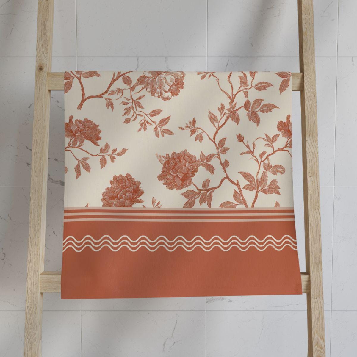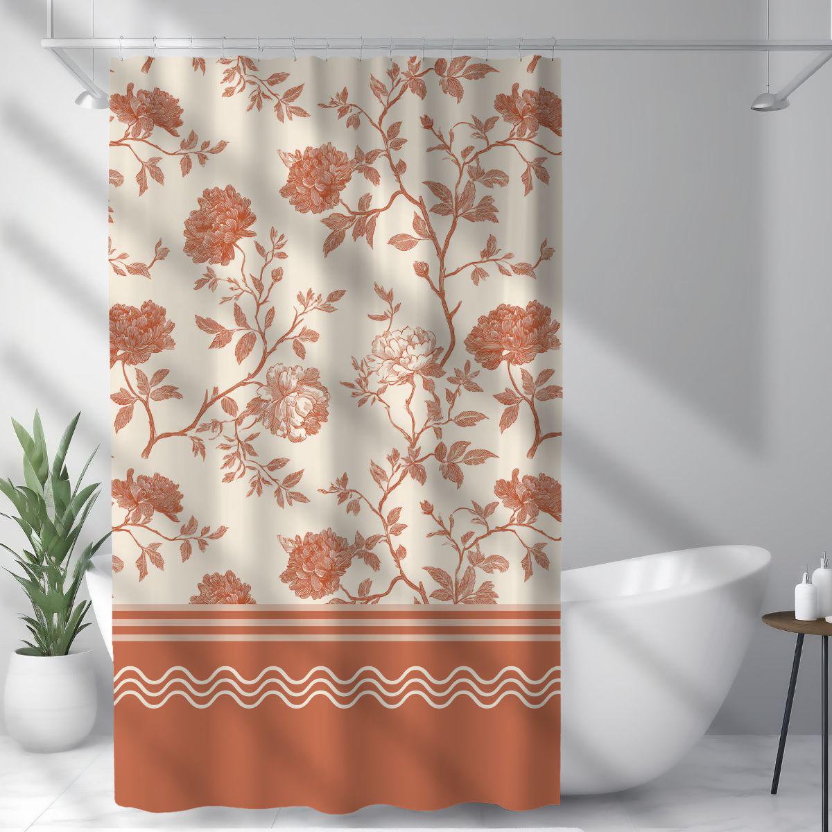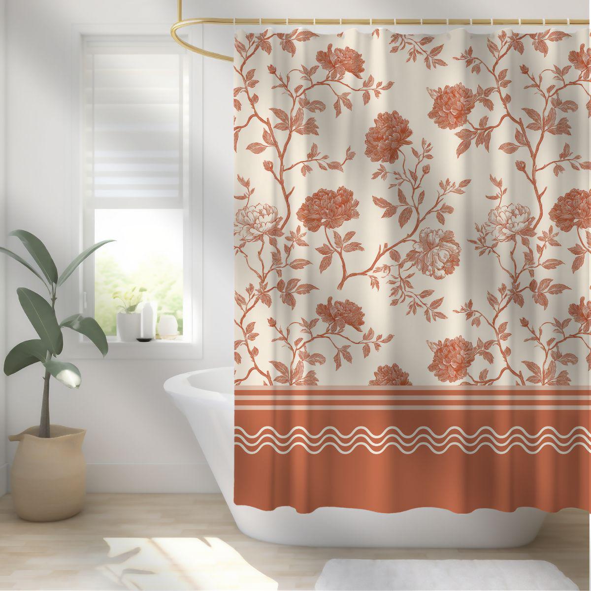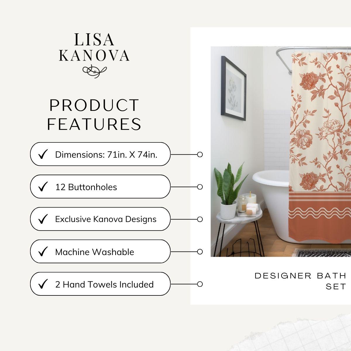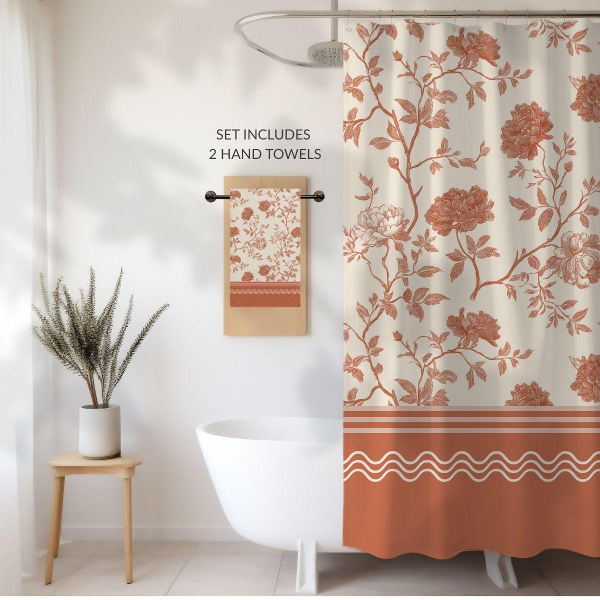 Designer Toile Bath Set • Vintage Floral Shower Curtain and 2 Hand Towels in Garden Terracotta
