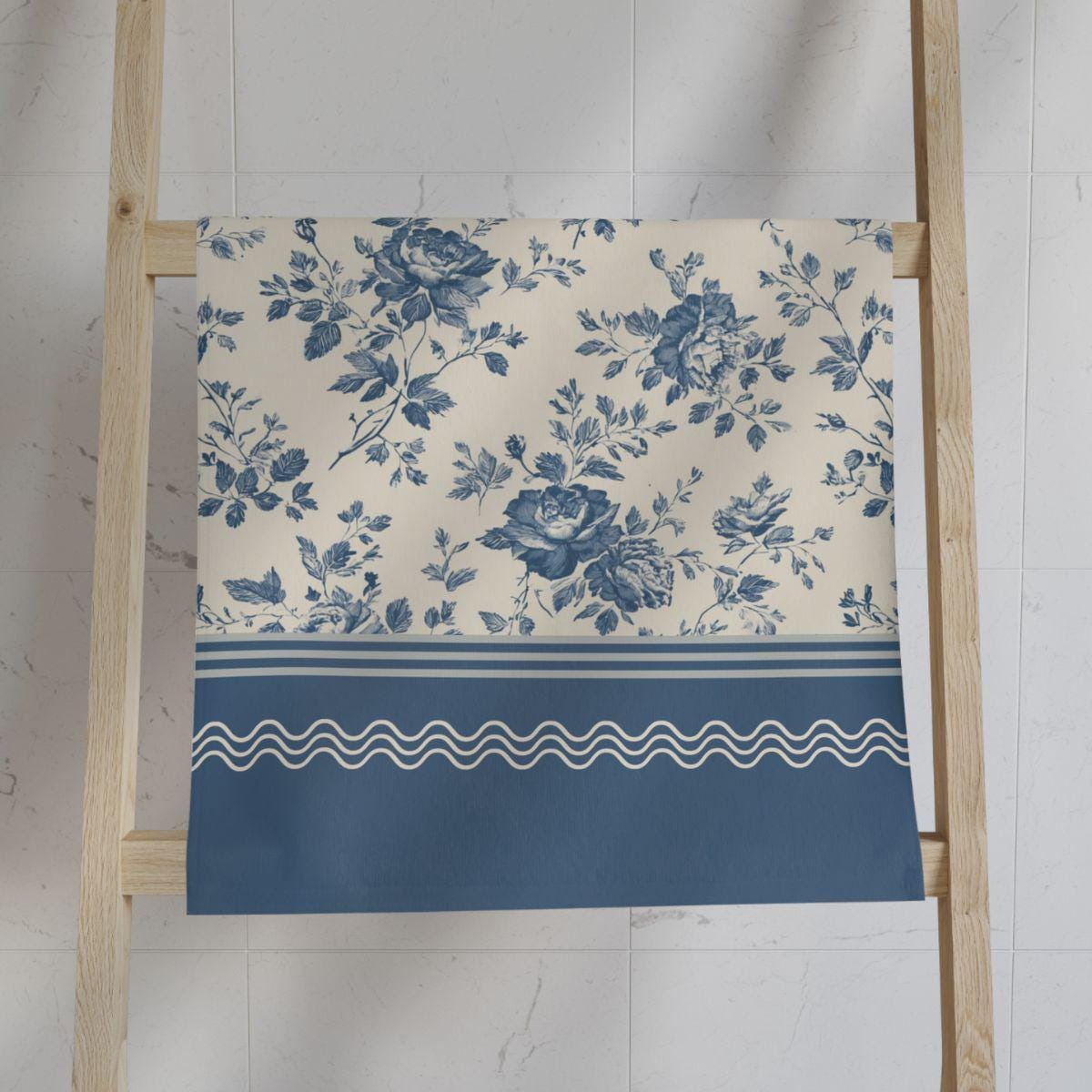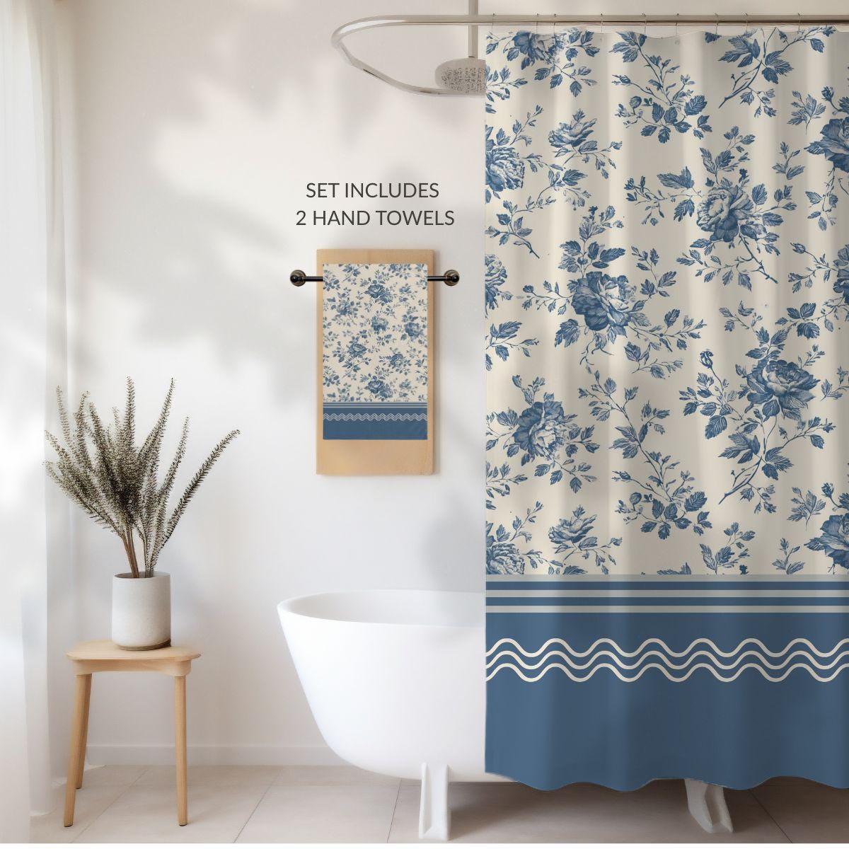 Designer Toile Bath Set • Vintage Floral Shower Curtain and 2 Hand Towels in Garden Azure