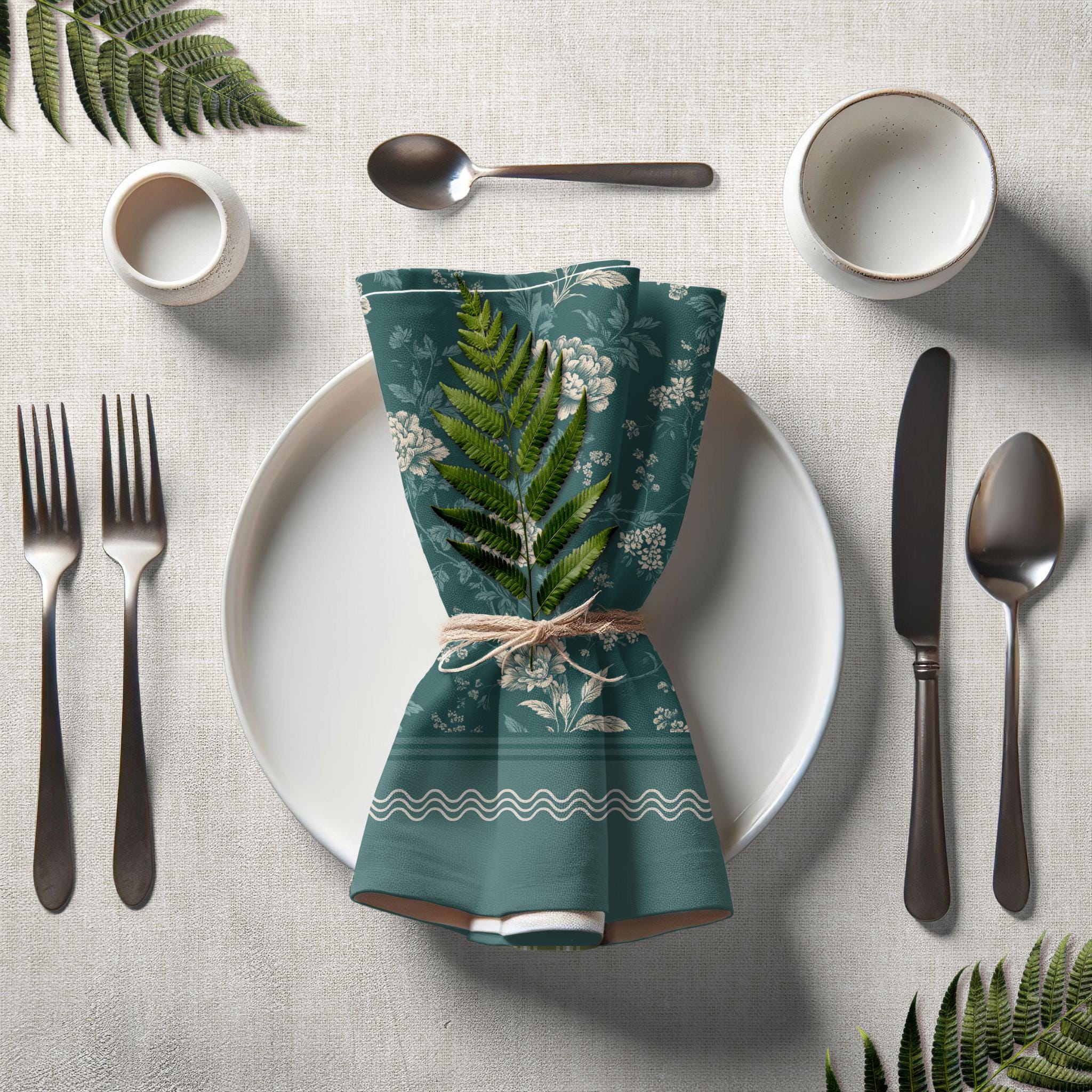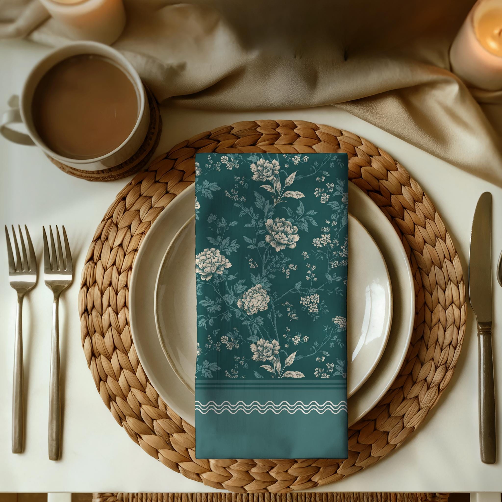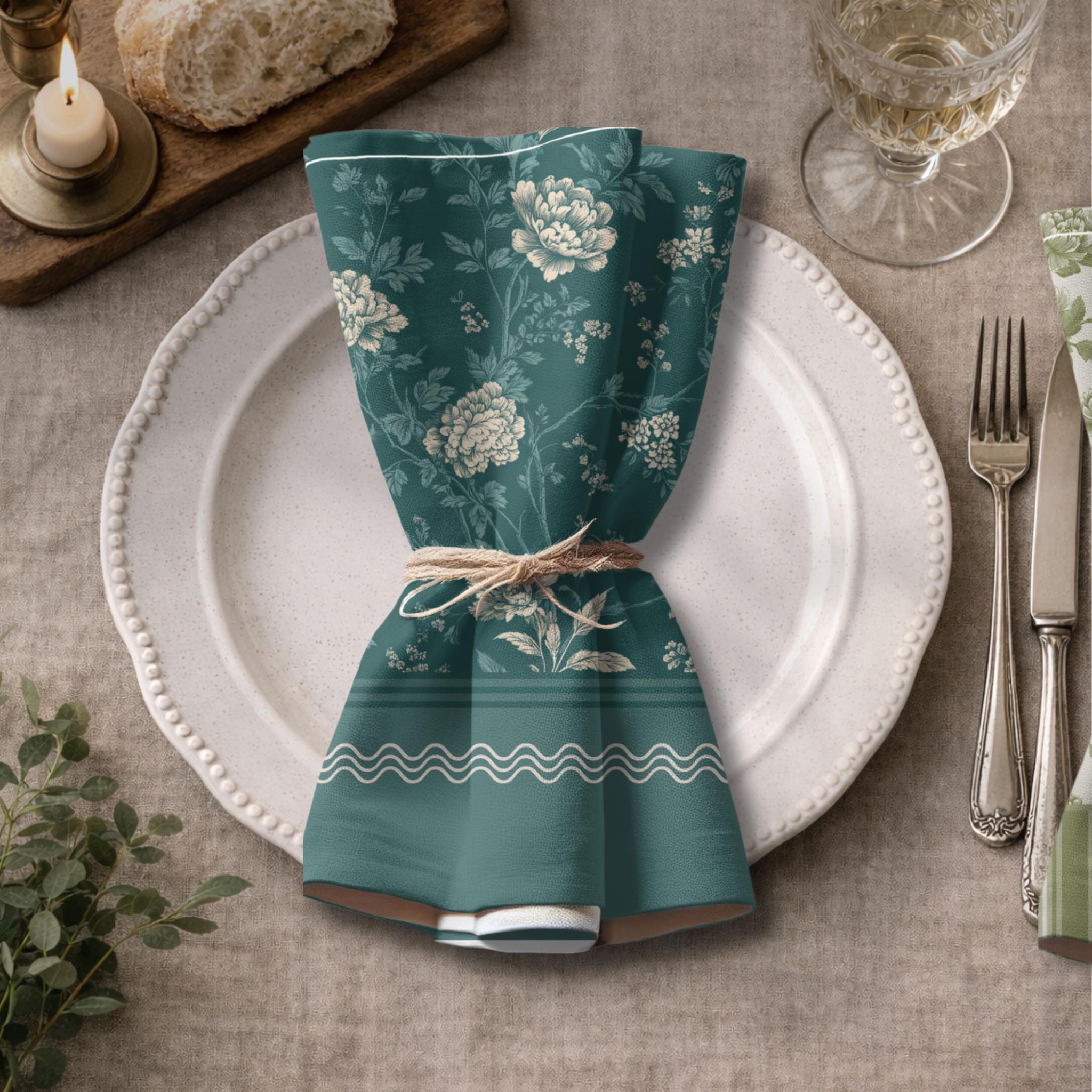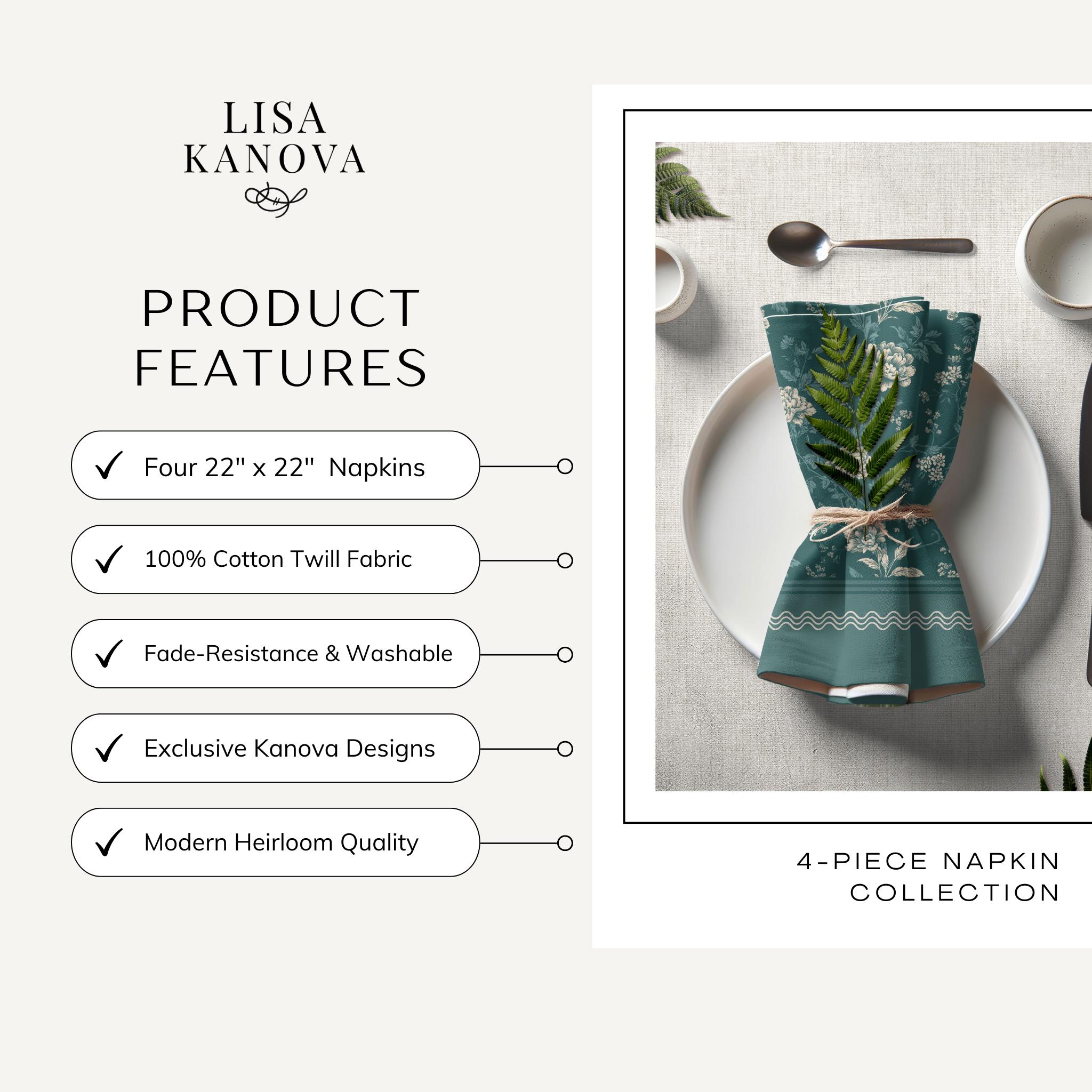 Designer Set of 4 - 100% Cotton Twill 22" x 22" Modern Heirloom Napkins in Teal Garden
