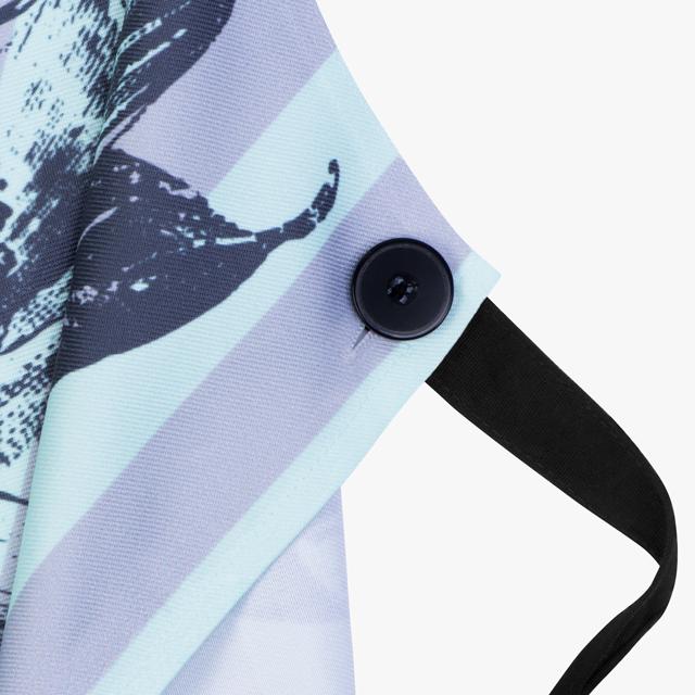Finished with black adjustable neck and waist straps for a modern, polished contrast