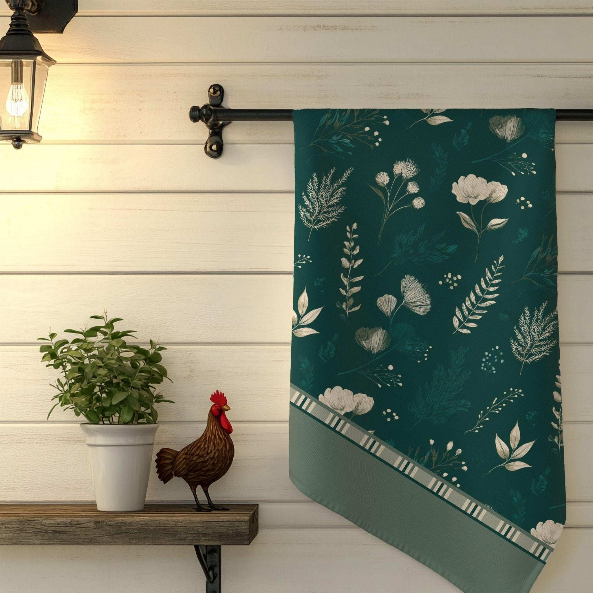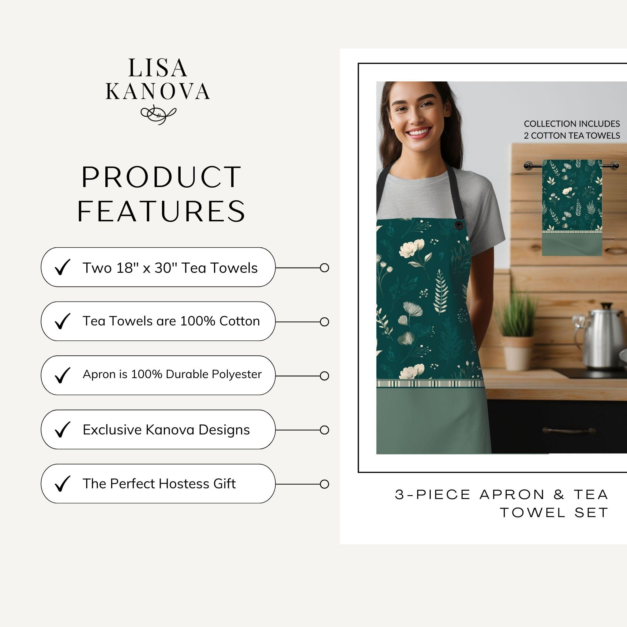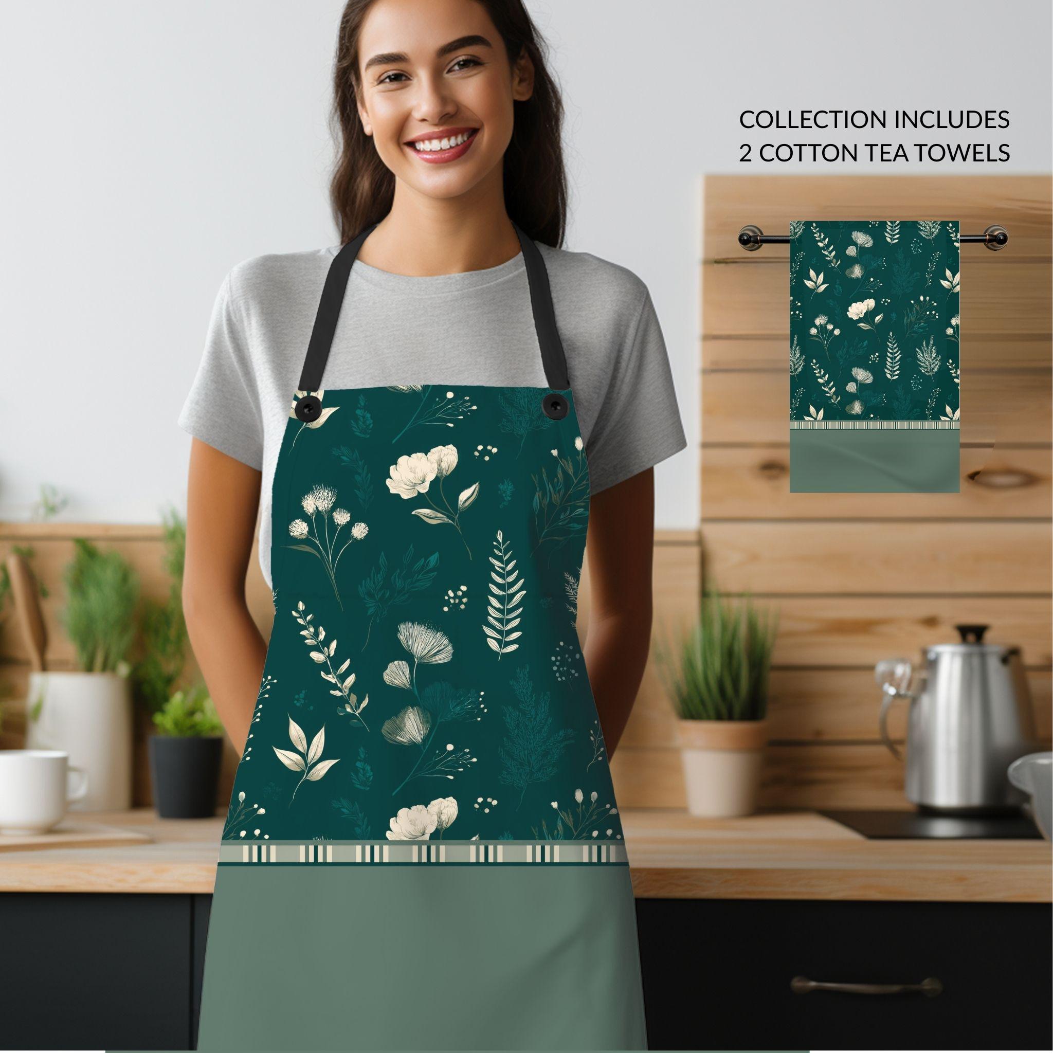 Designer Kitchen Collection | Apron and Two Cotton Tea Towels in Teal Garden