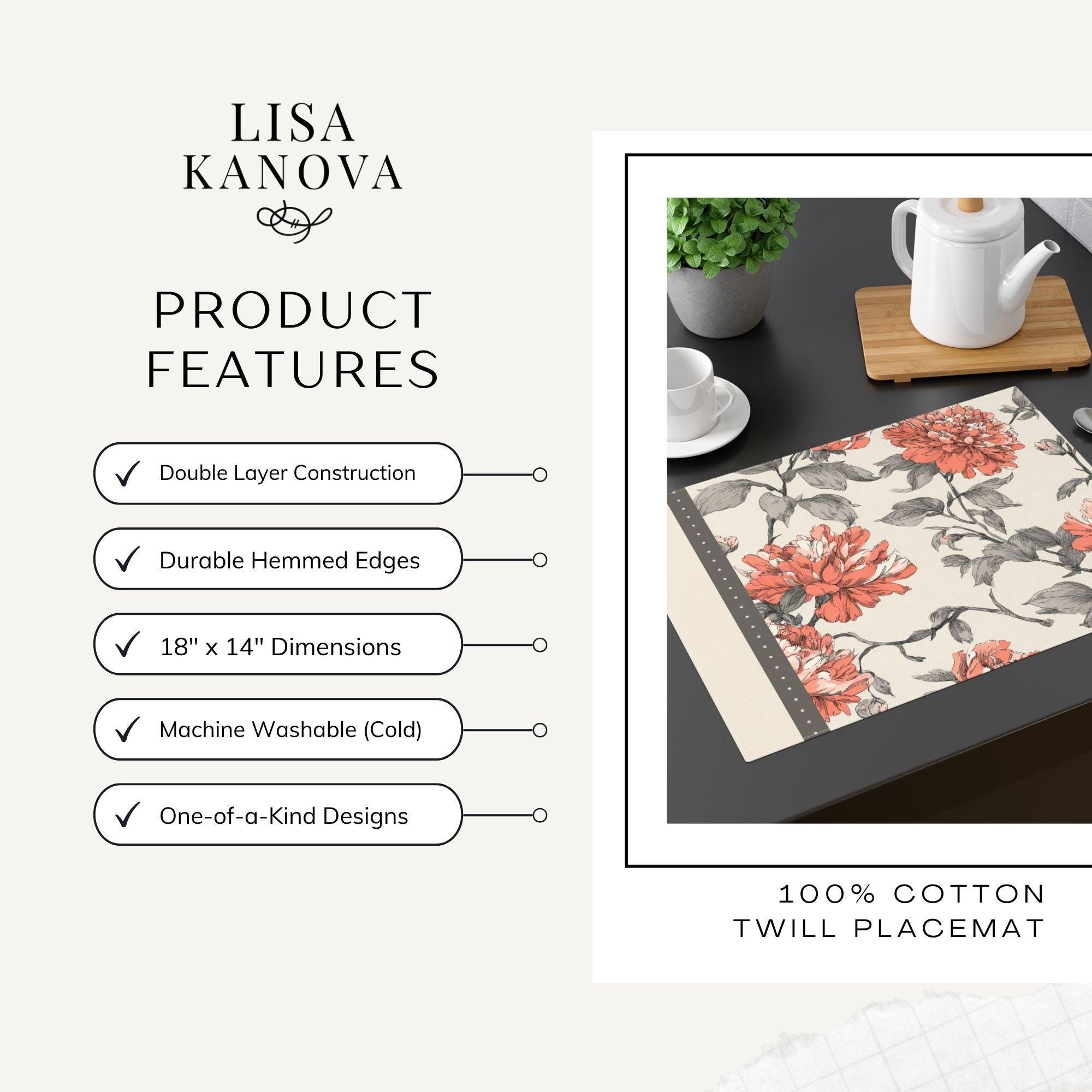 Lay a quiet, lived-in charm across your table with this cotton twill placemat. The weight of the fabric and its vintage-inspired weave feel like afternoons spent with sun through the window, slow conversations and warm mugs. The designer pattern printed on one side gives the surface personality while the hemmed edges and double-layer construction promise it will stay part of your everyday rituals. At 18" × 14", it frames plates and bowls without fuss. It’s the kind of table linen that ages into the home—softening, familiar, and always ready for another meal together.