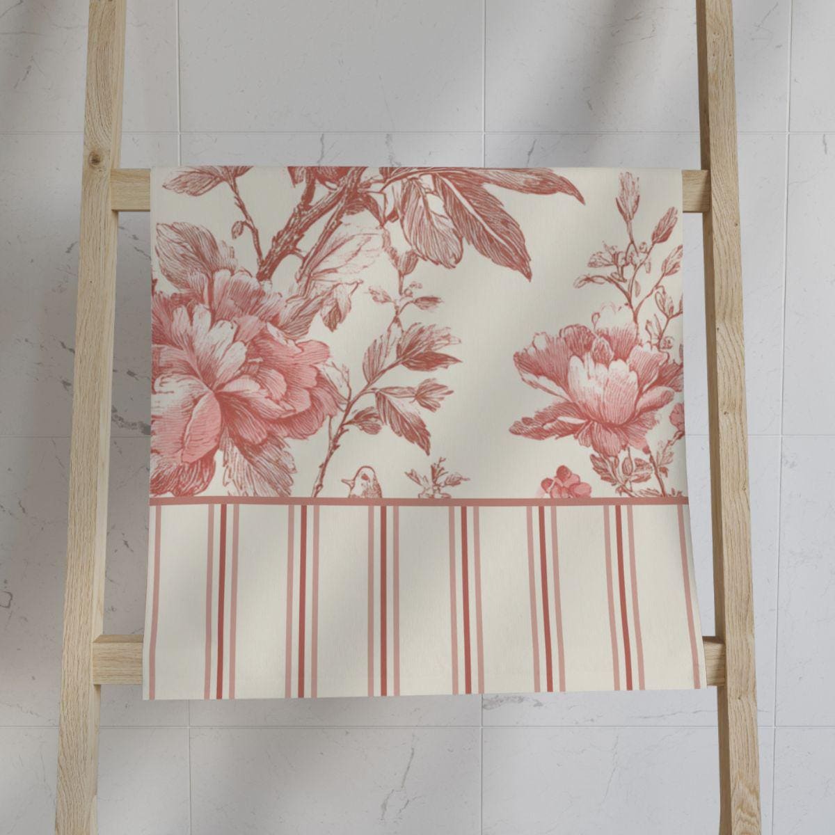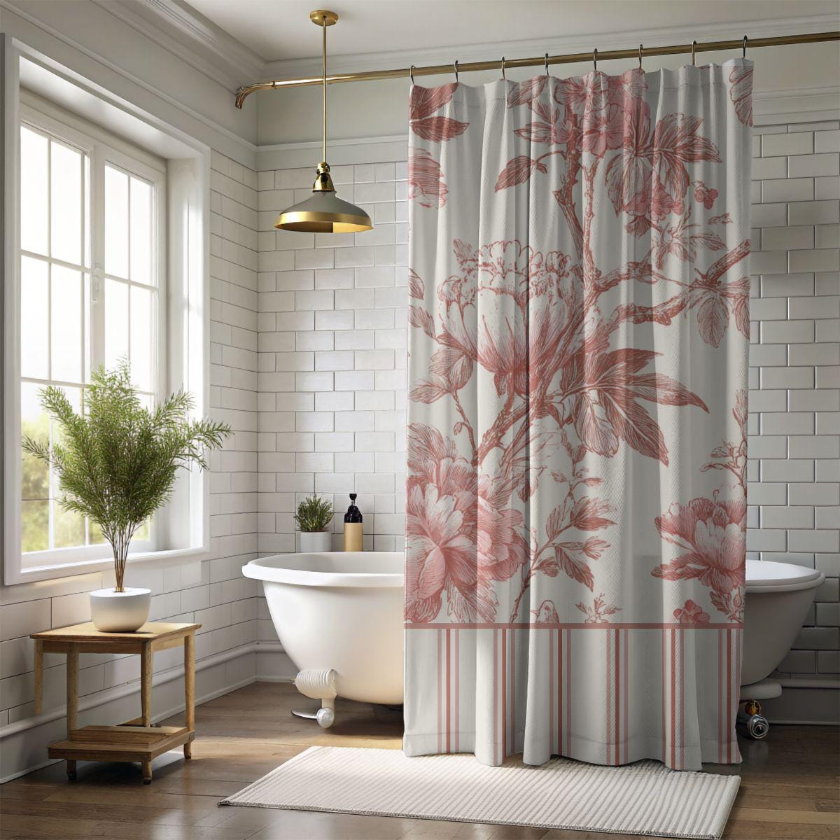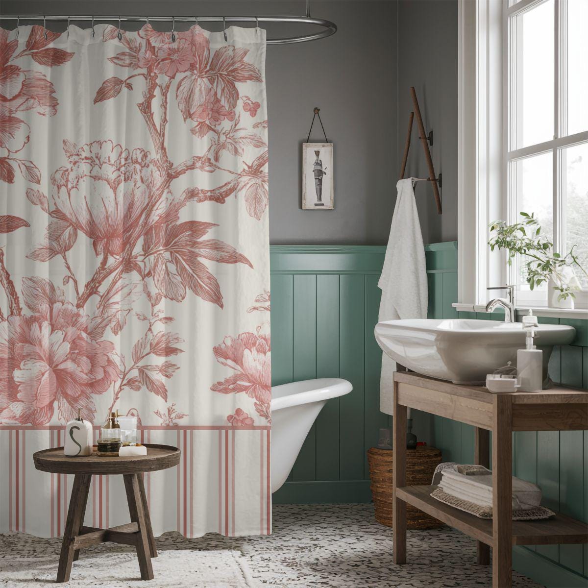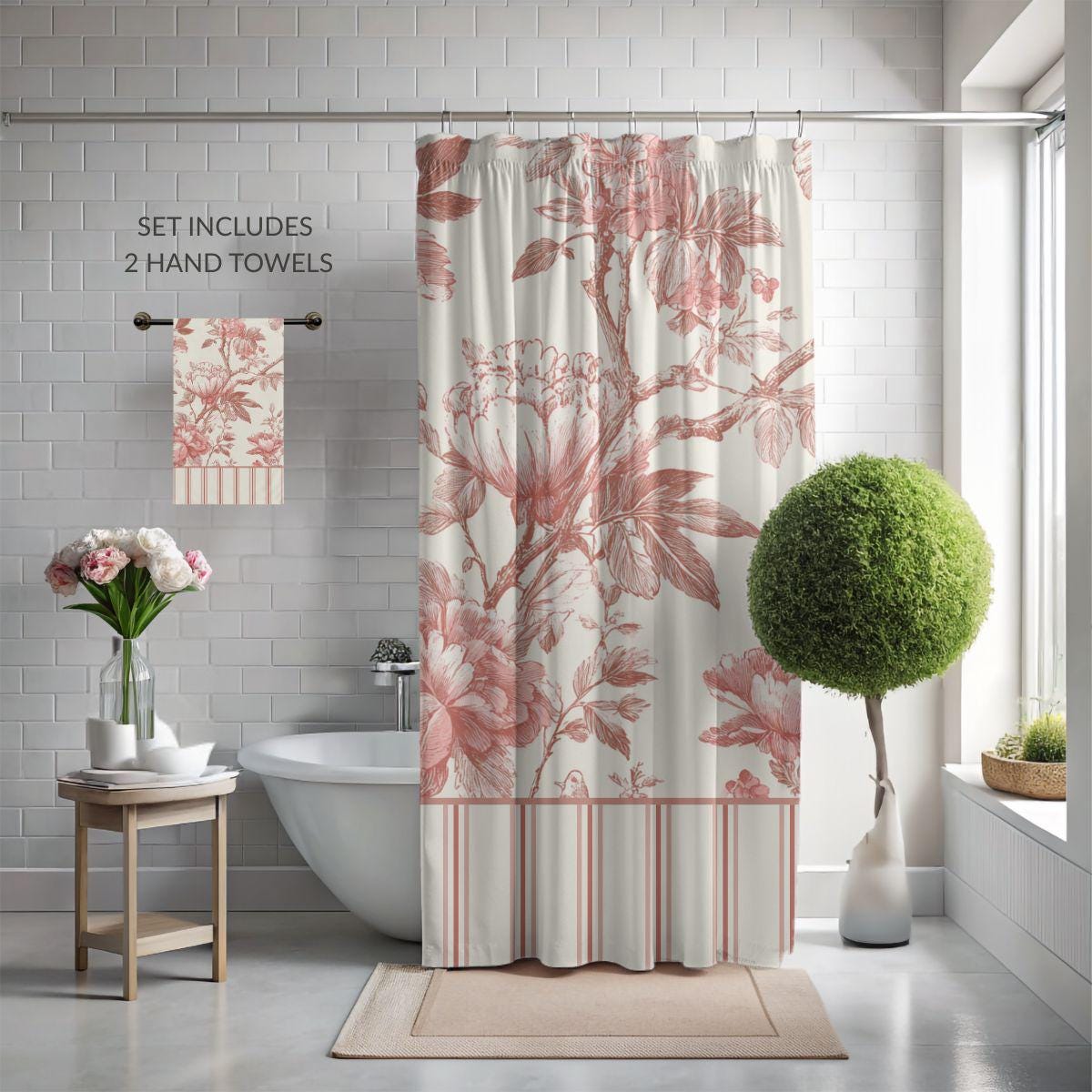 Designer Toile Bath Set • Vintage Floral Shower Curtain and 2 Hand Towels in Blush Garden