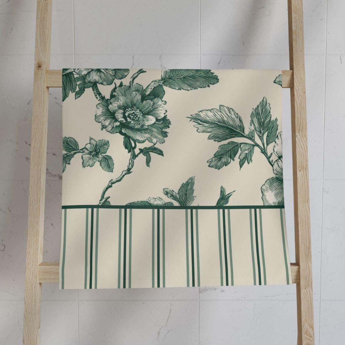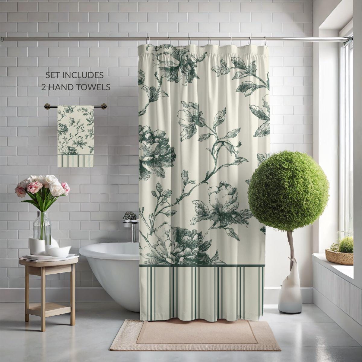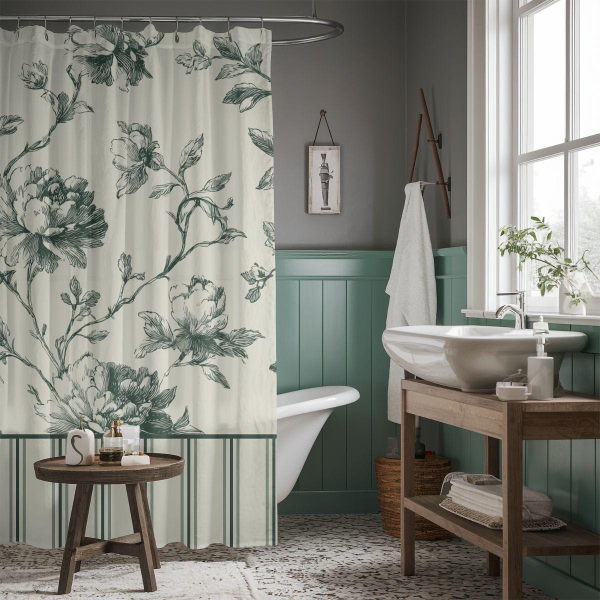 Designer Toile Bath Set • Vintage Floral Shower Curtain and 2 Hand Towels in Sage Garden
