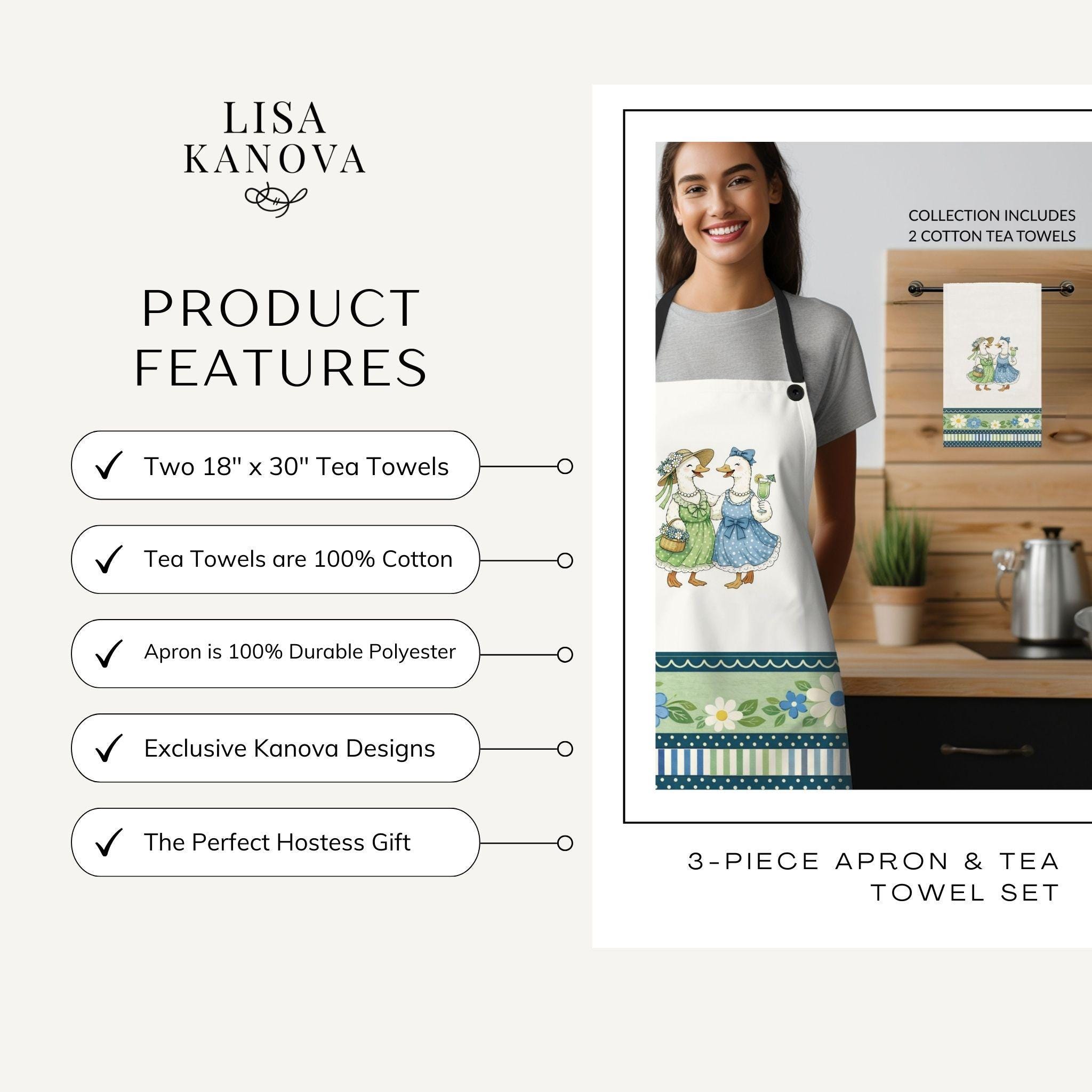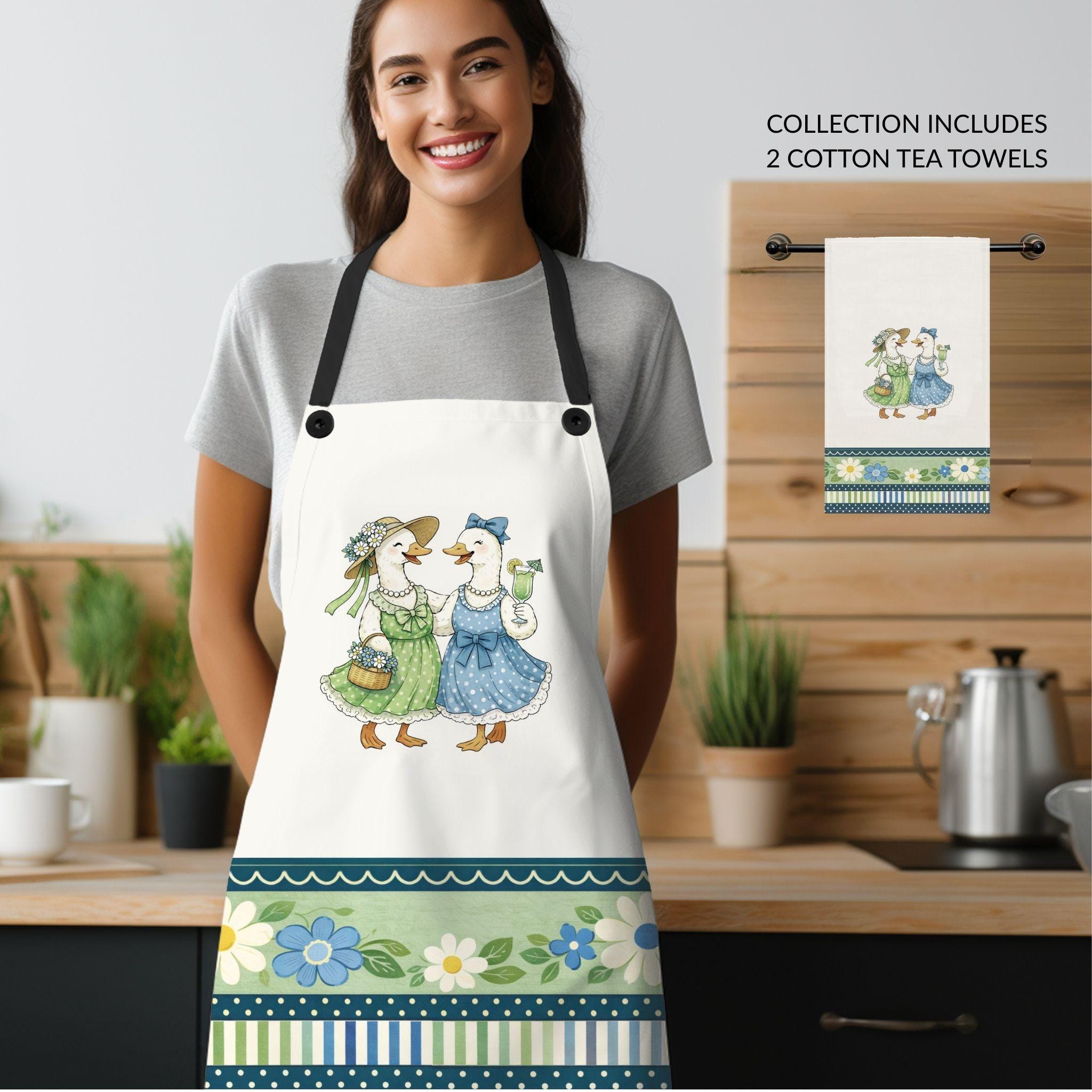 Designer Kitchen Collection | Apron and Two Cotton Tea Towels in Best Friends Forever Geese