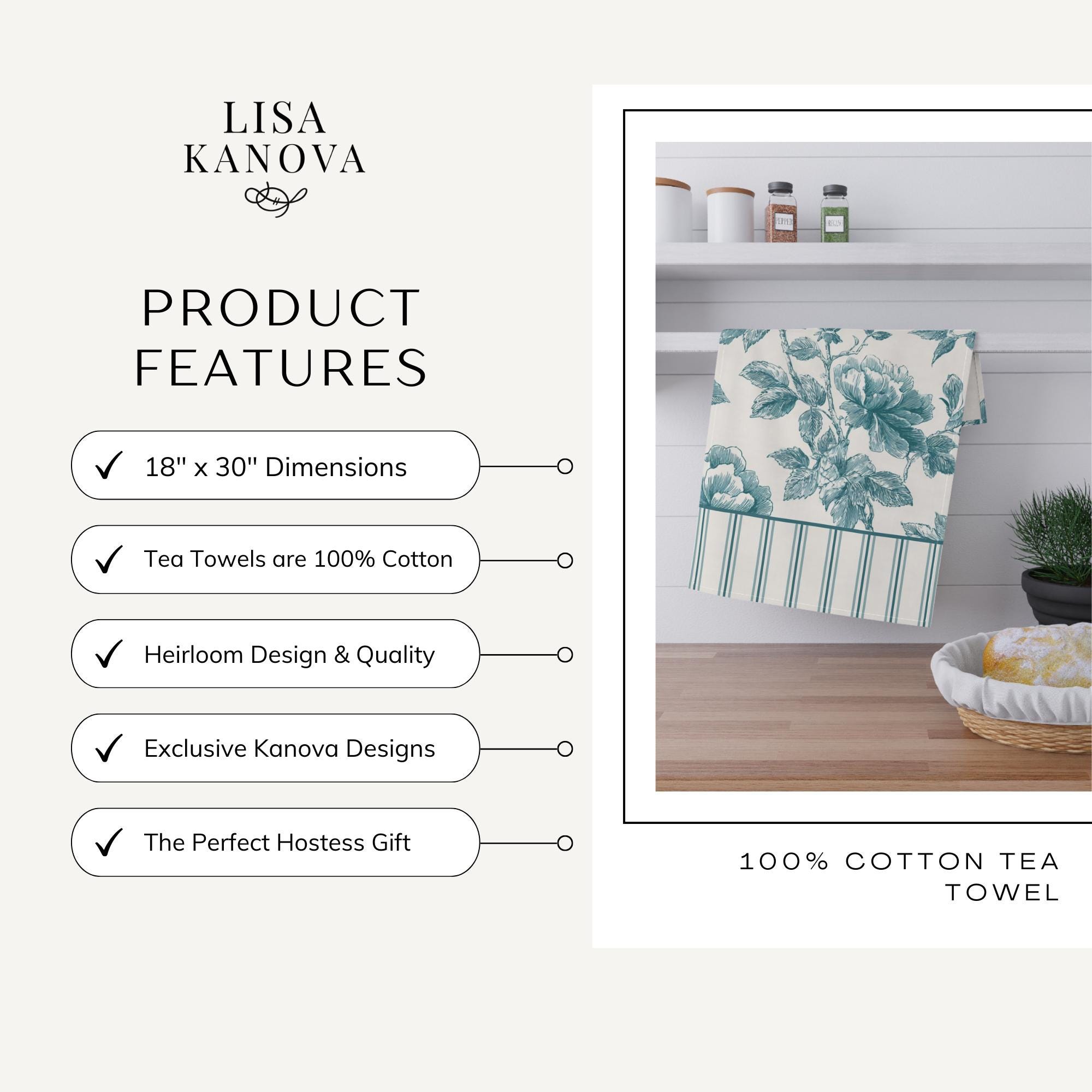 Teal Blue Floral Toile Pattern 100% Cotton Tea Towel | Vintage Heirloom Motif