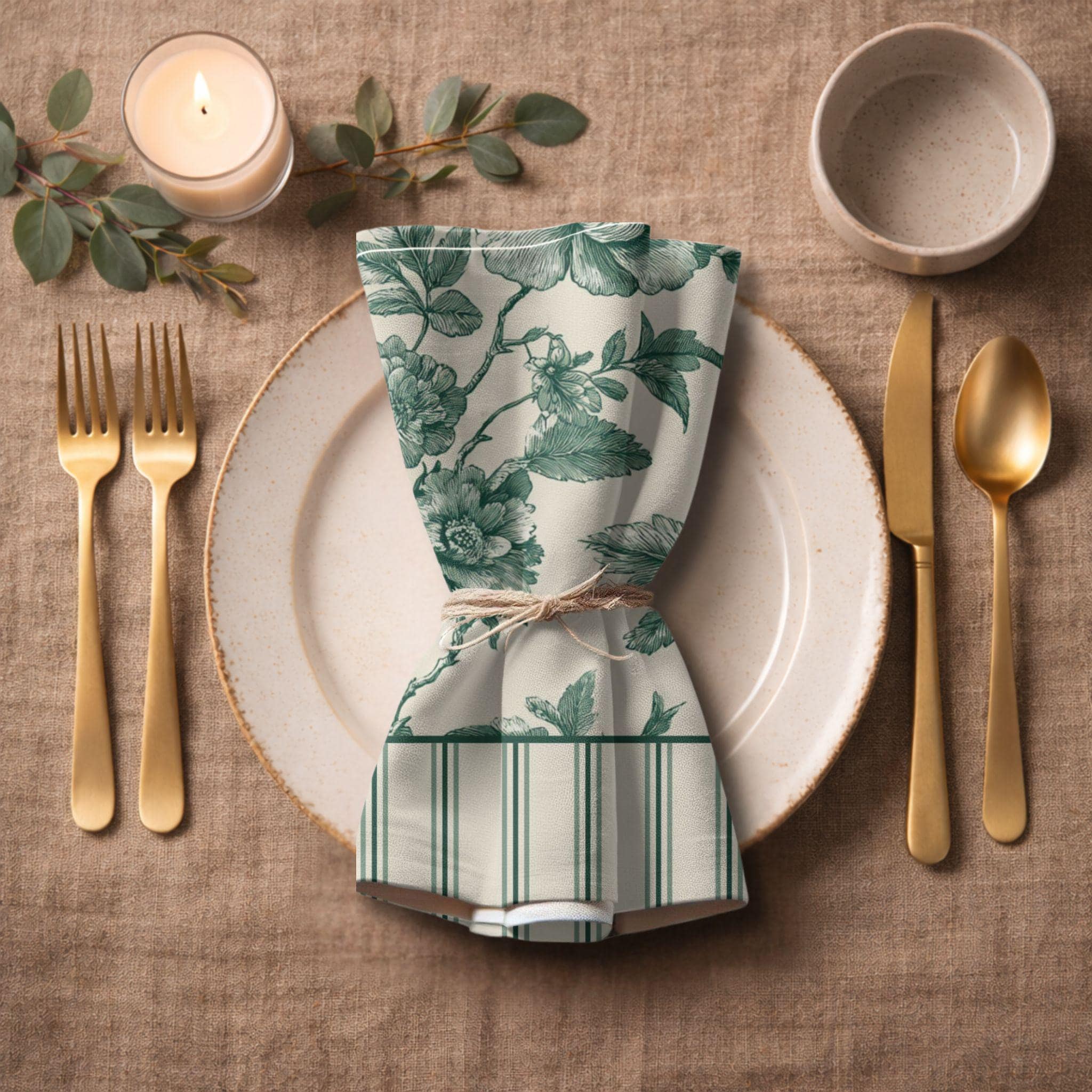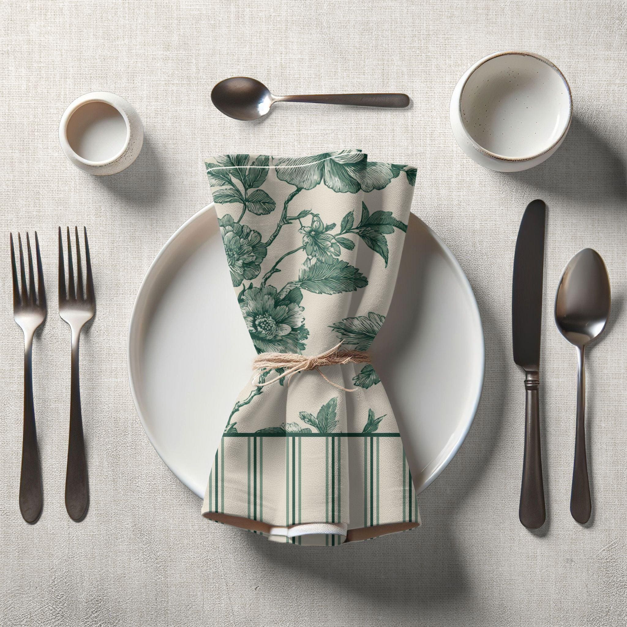 Designer Set of 4 - 100% Cotton Twill 22" x 22" Modern Heirloom Napkins in Vintage Green Toile