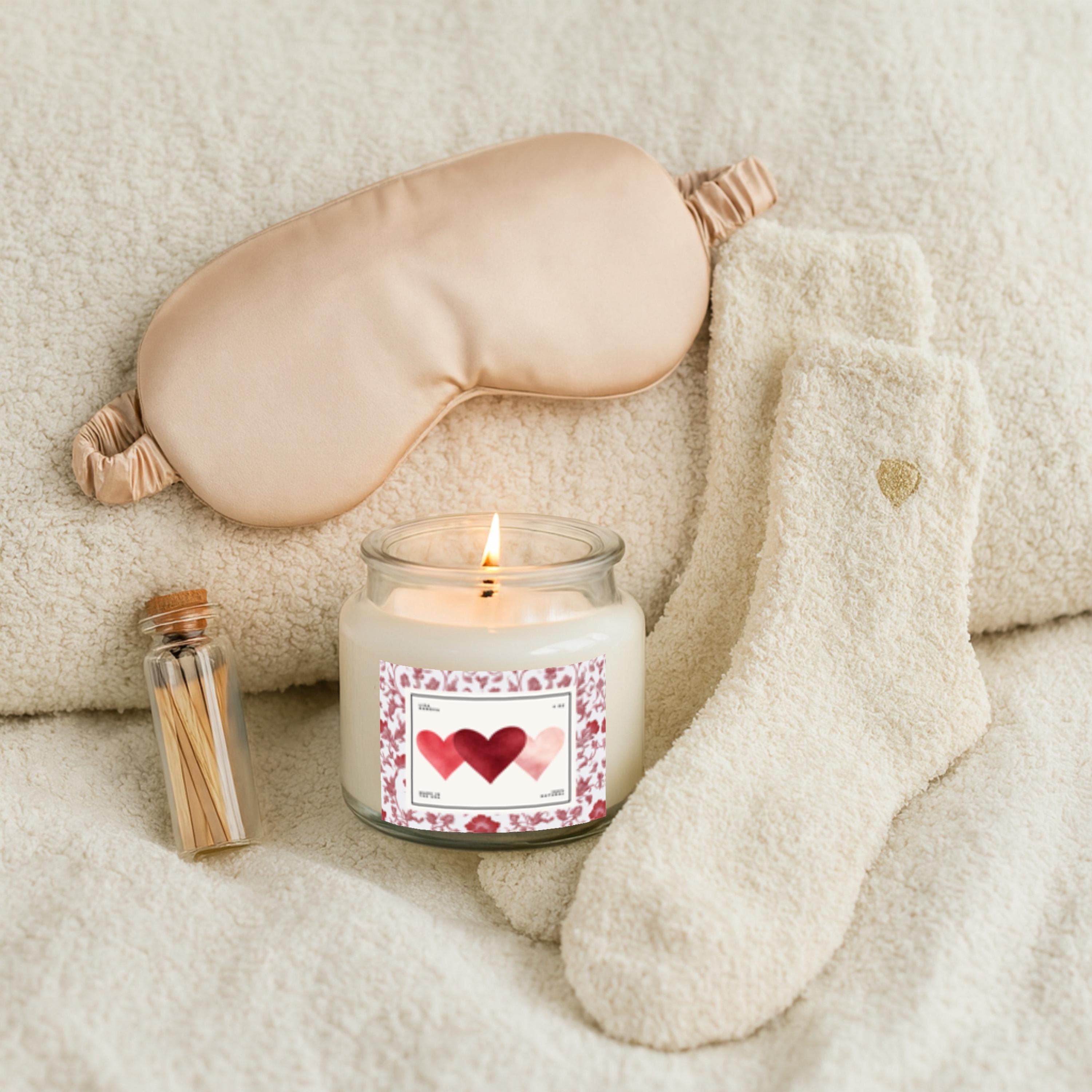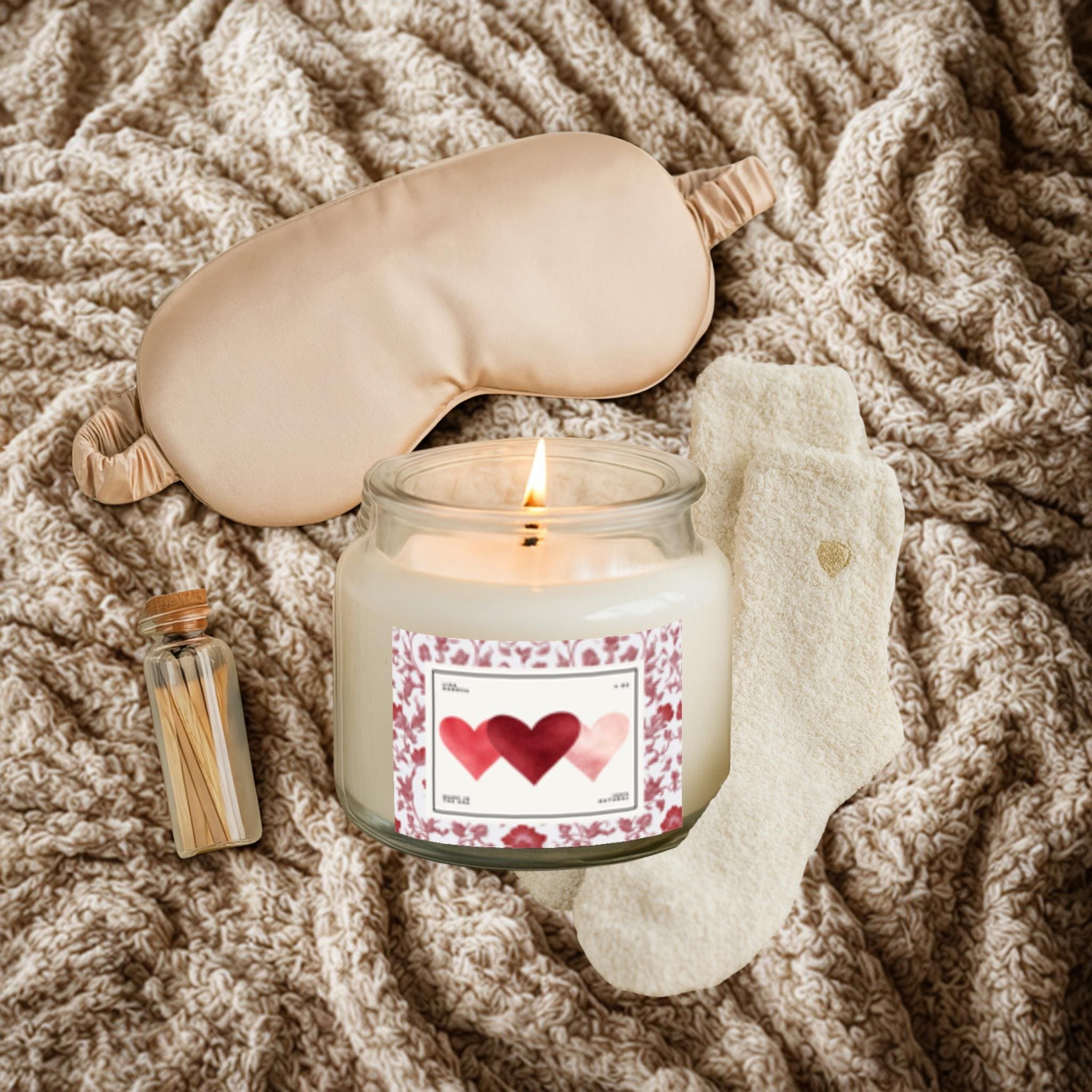 Nestled in plush ivory textures, this set pairs a softly glowing candle with cozy heart-detail socks, a silky sleep mask, and a bottle of matches for effortless ambiance. The candle’s gentle light and romantic heart label create an inviting atmosphere, perfect for unwinding, journaling, or settling in for a quiet night at home.