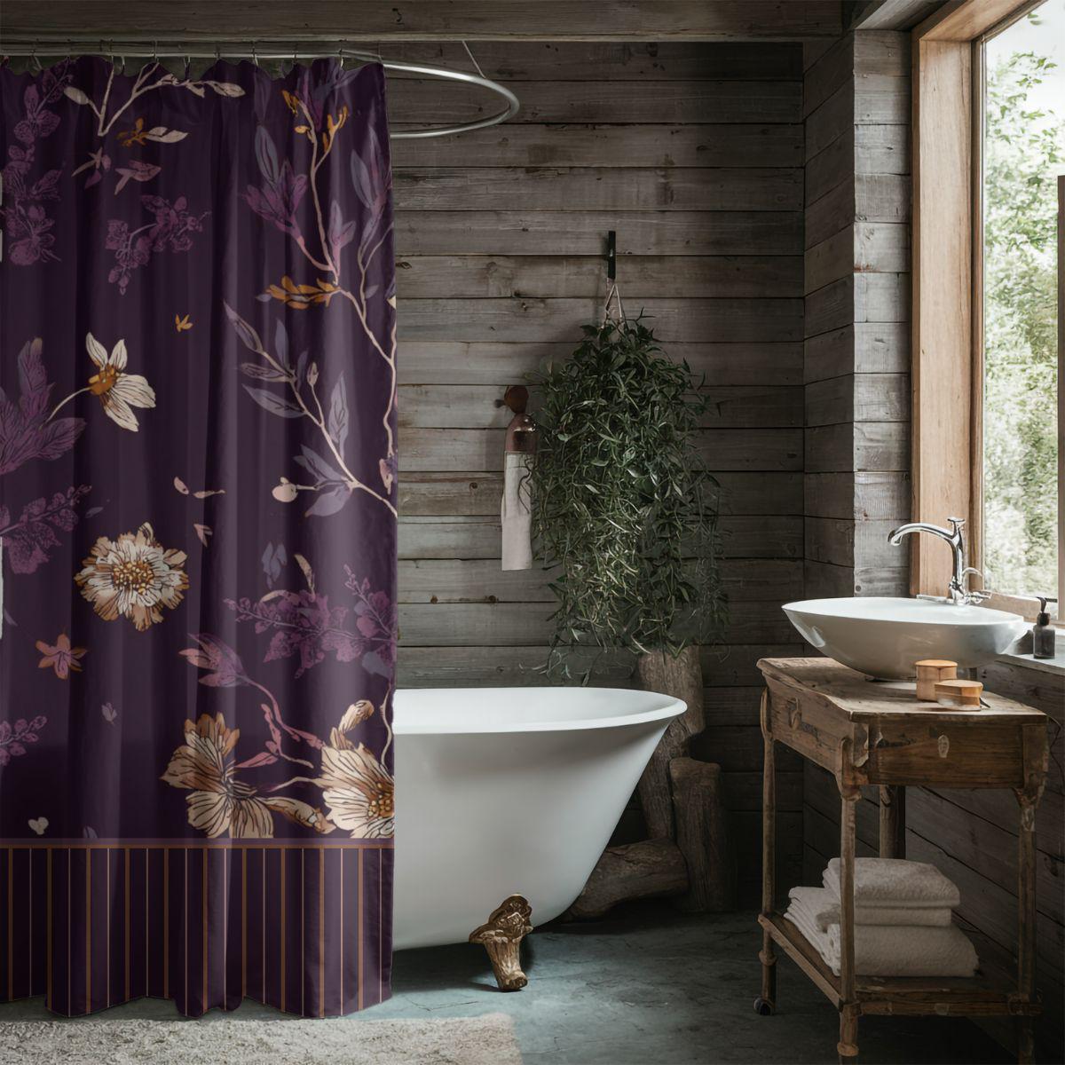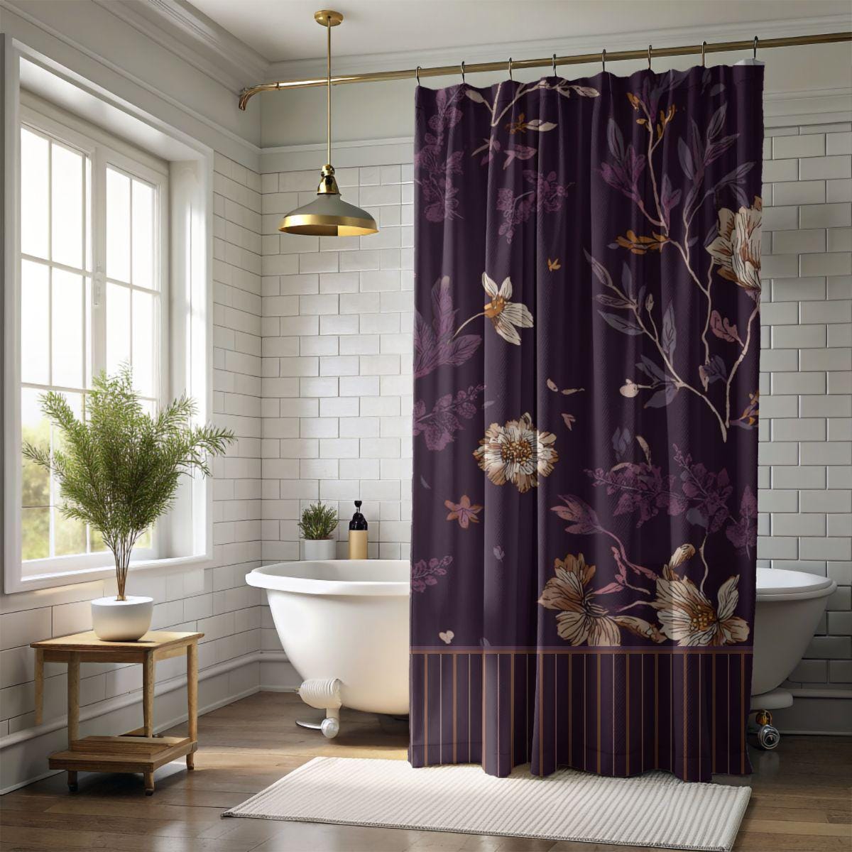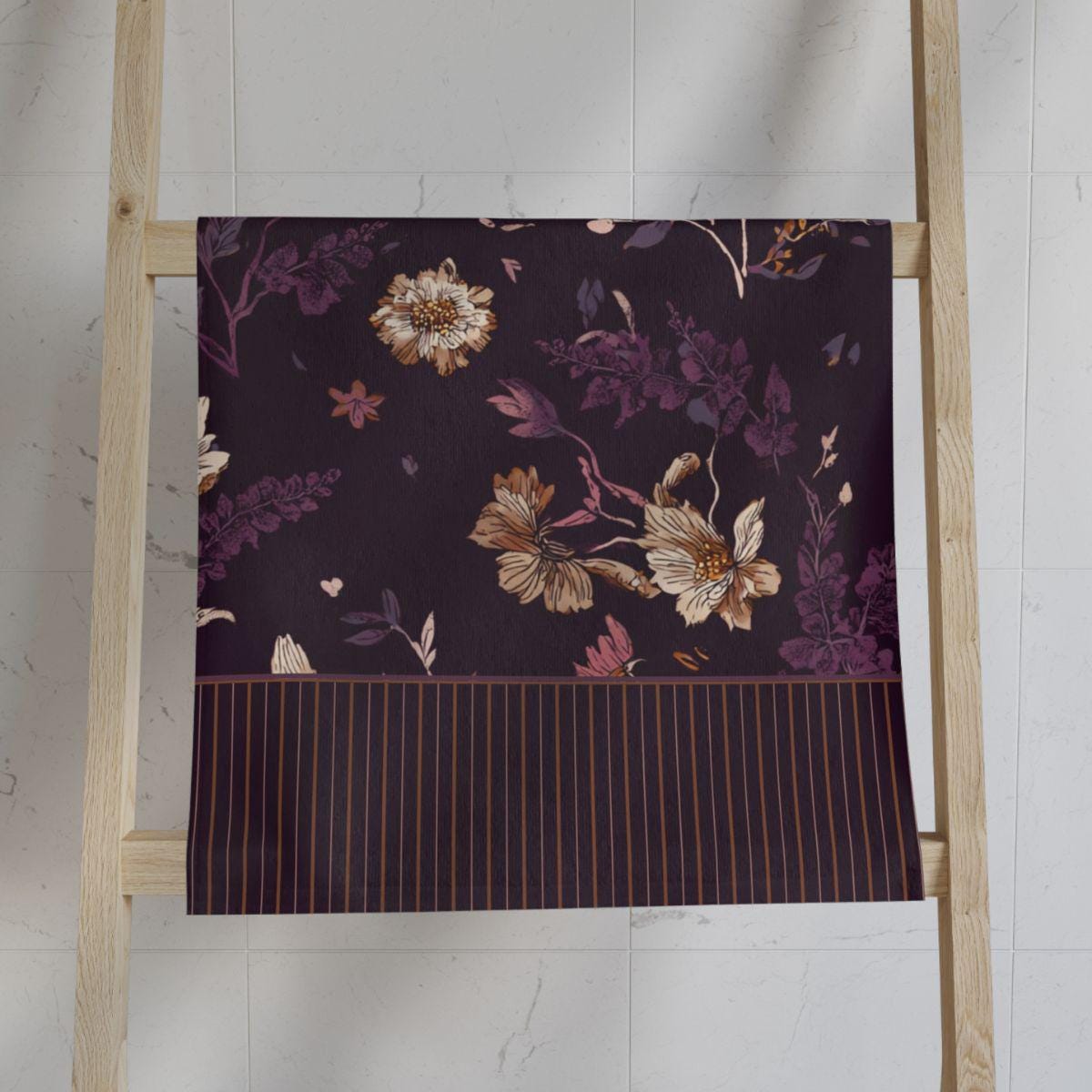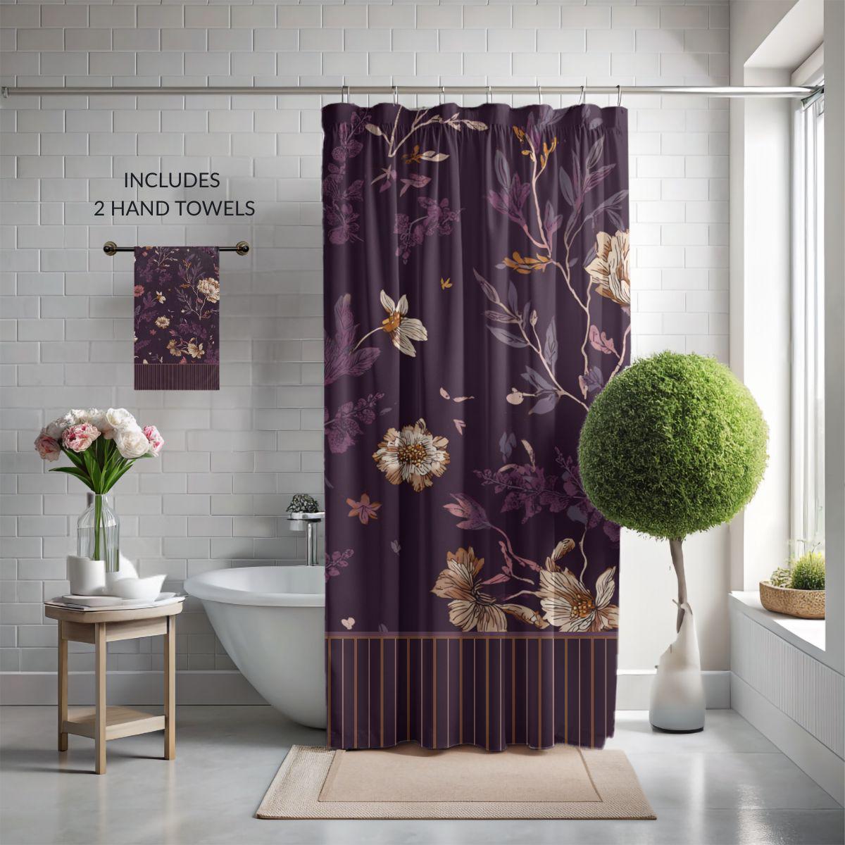 A dramatic plum ground layered with hand-drawn florals and a tailored striped border. Rich, romantic, and quietly bold — designed to turn an everyday bath into a statement moment. Includes coordinating hand towels for a pulled-together, intentional look.