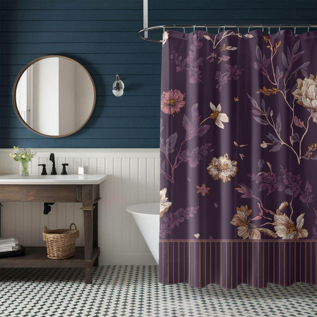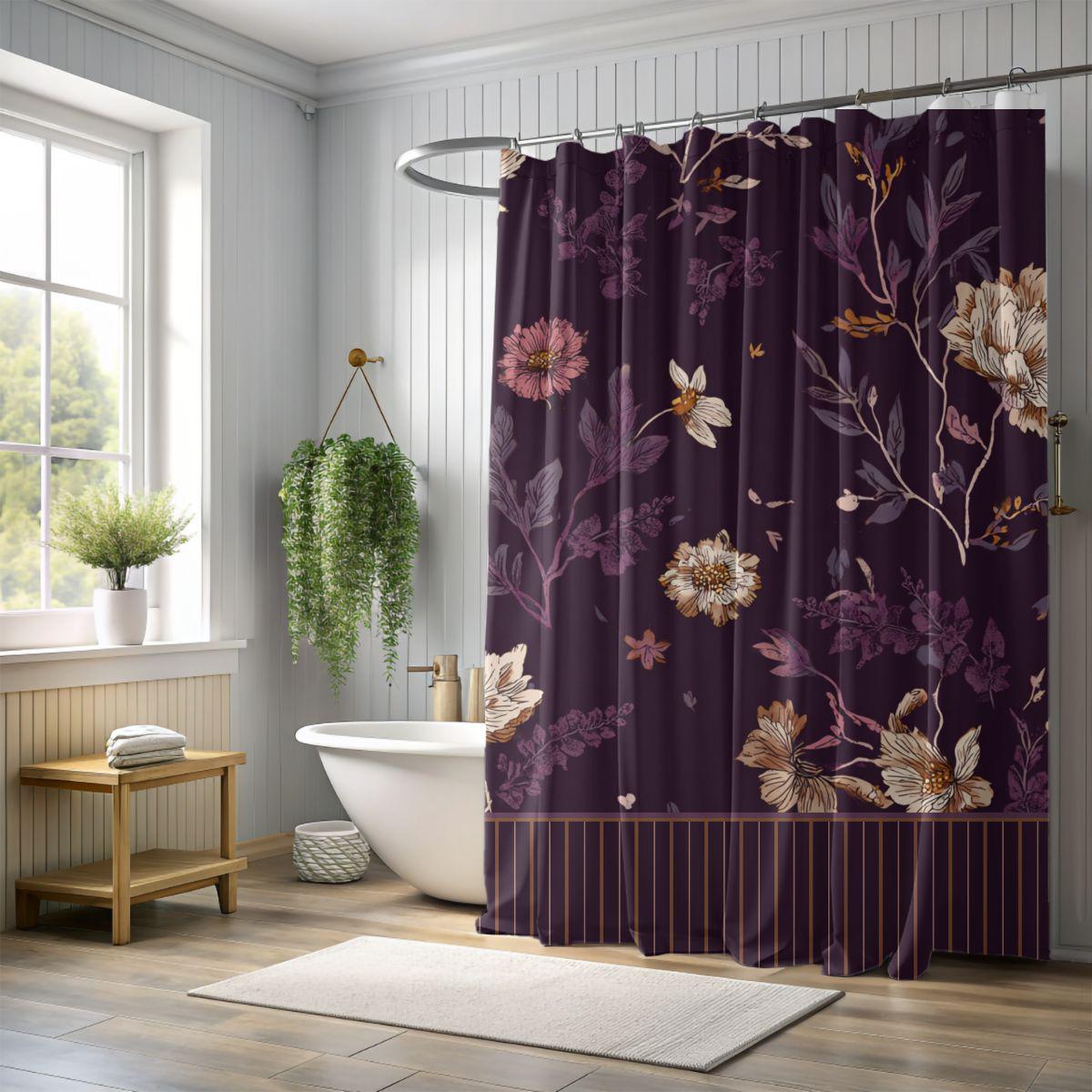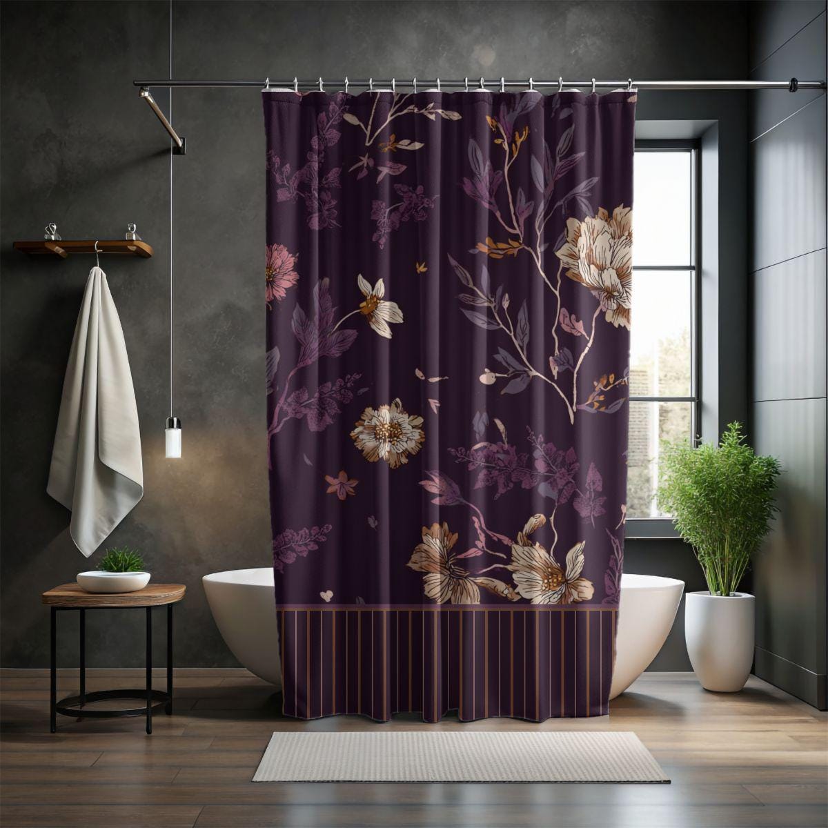 A dramatic plum ground layered with hand-drawn florals and a tailored striped border. Rich, romantic, and quietly bold — designed to turn an everyday bath into a statement moment. Includes coordinating hand towels for a pulled-together, intentional look.