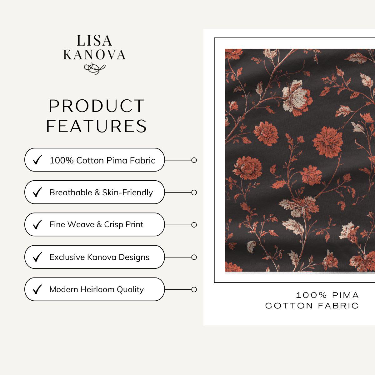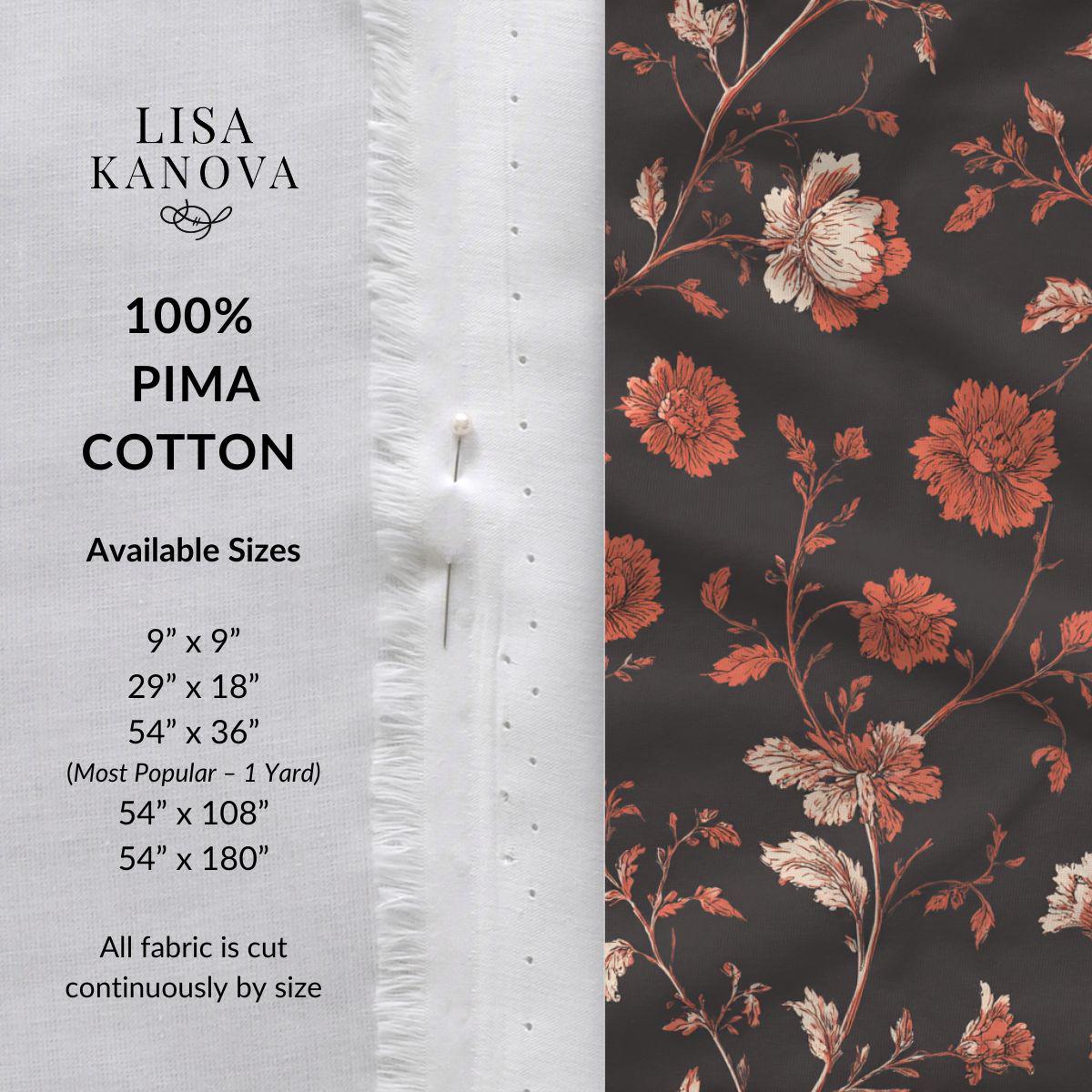 Copper in Curated Spaces is a warm, earthy floral printed on smooth, breathable Pima cotton, where burnished copper and soft ivory blooms unfold across a deep charcoal ground. The palette feels settled and intentional, bringing warmth without brightness and detail without excess. There’s a calm confidence in this pattern — organic, refined, and deeply livable — making it ideal for bedrooms, reading spaces, or interiors that favor texture and tone over contrast. Designed to feel timeless and steady, this fabric adds depth and character without ever demanding attention.