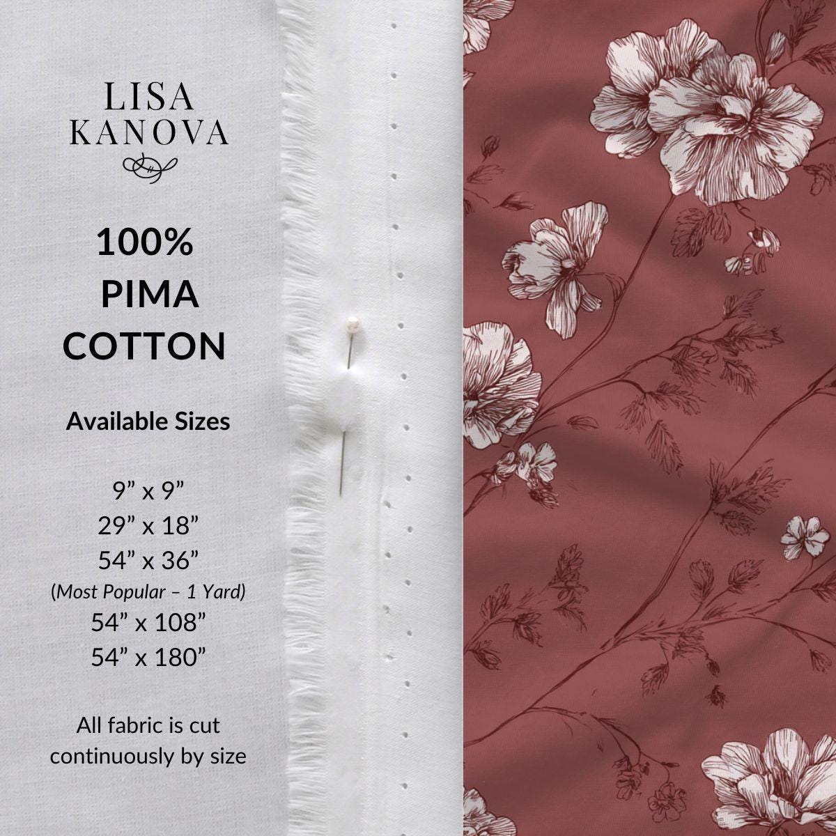 Afternoon Merlot in the Garden pairs a muted wine-toned ground with softly sketched florals that feel relaxed rather than formal. The palette is warm and grounded, designed to add richness without overpowering a space. Printed on smooth Pima cotton, the pattern has gentle movement and depth that works beautifully for pillows, bedding accents, or layered textiles where you want color that feels lived-in, not loud. It’s a floral meant for rooms that value comfort, intention, and a touch of quiet sophistication.