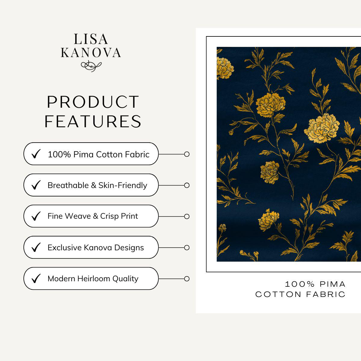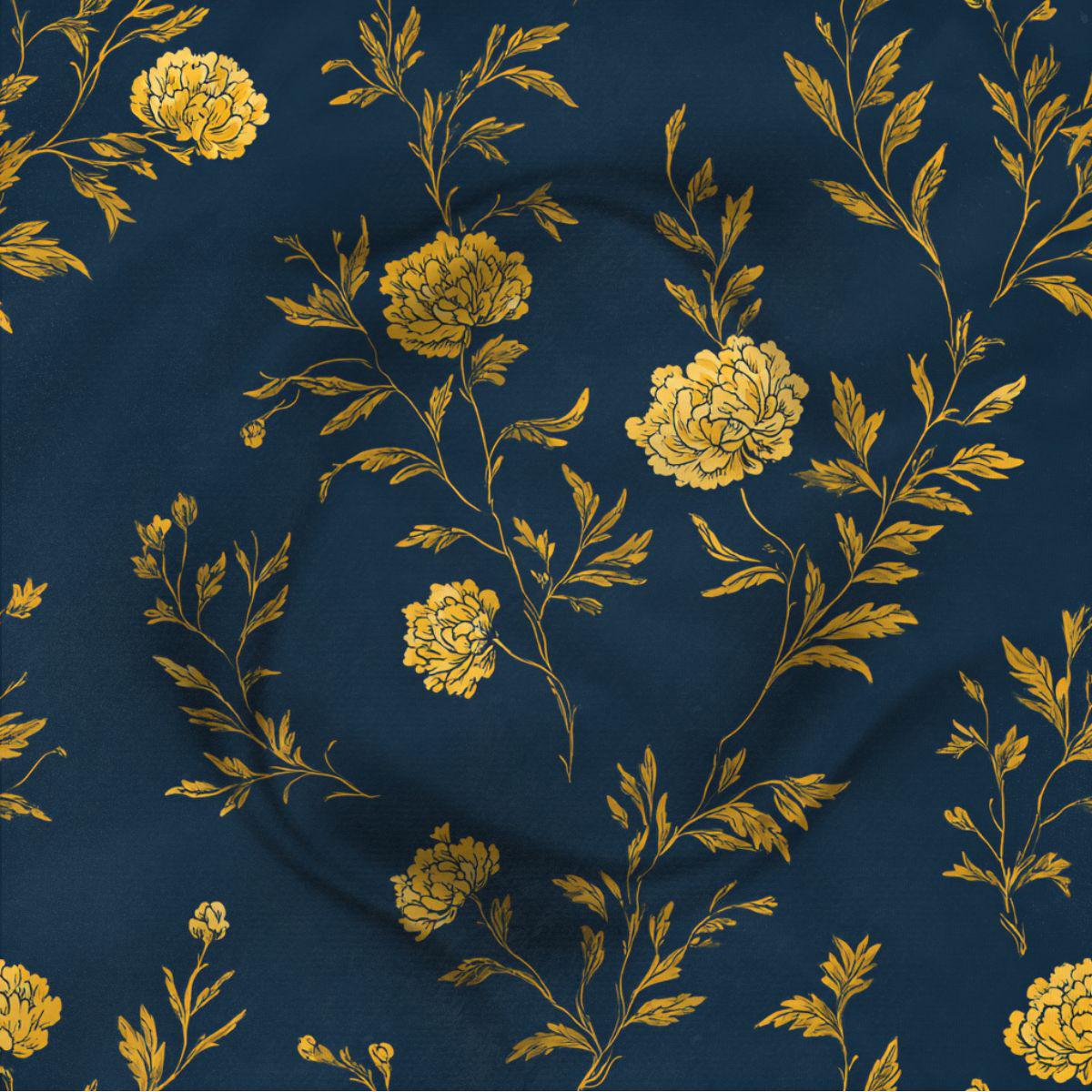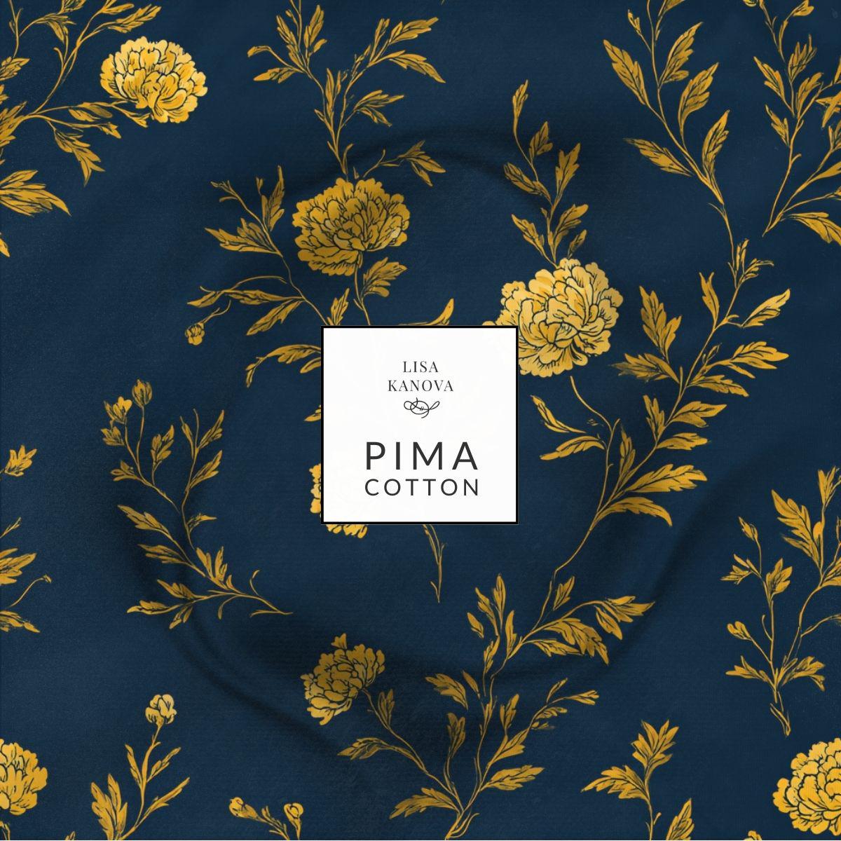Gold Settles in the Evening pairs a deep blue ground with softly drawn florals in warm golden tones, creating a pattern that feels luminous yet grounded. The contrast is elegant rather than bold, designed to add warmth and depth without overwhelming a space. Printed on smooth Pima cotton, the fabric has a refined hand and subtle movement, making it ideal for pillows, bedding accents, or layered textiles in rooms that feel composed, intentional, and quietly confident.