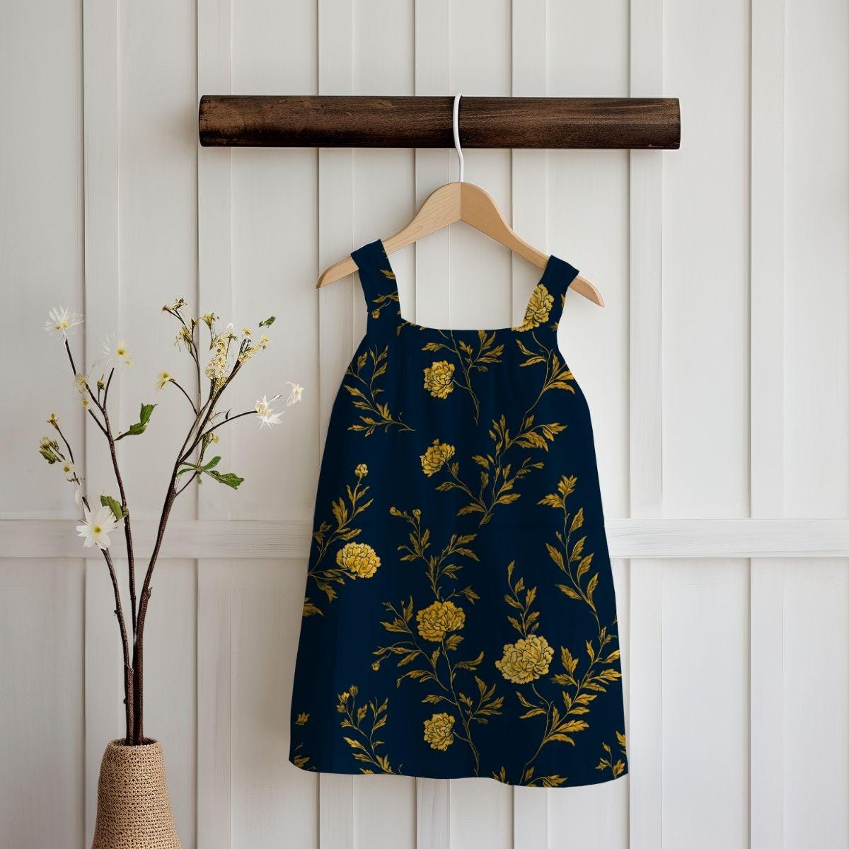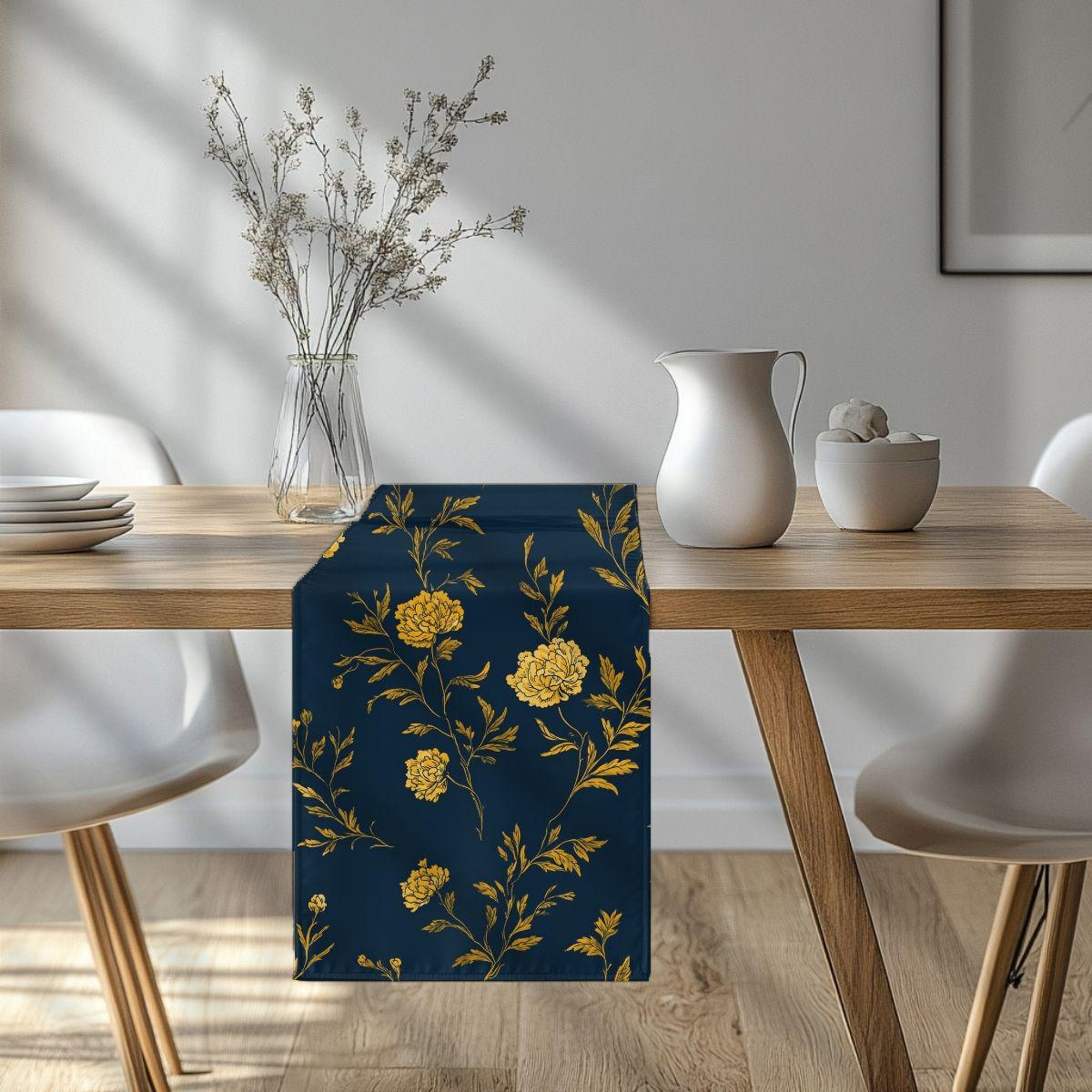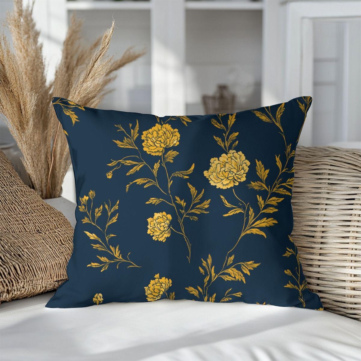 Gold Settles in the Evening pairs a deep blue ground with softly drawn florals in warm golden tones, creating a pattern that feels luminous yet grounded. The contrast is elegant rather than bold, designed to add warmth and depth without overwhelming a space. Printed on smooth Pima cotton, the fabric has a refined hand and subtle movement, making it ideal for pillows, bedding accents, or layered textiles in rooms that feel composed, intentional, and quietly confident.