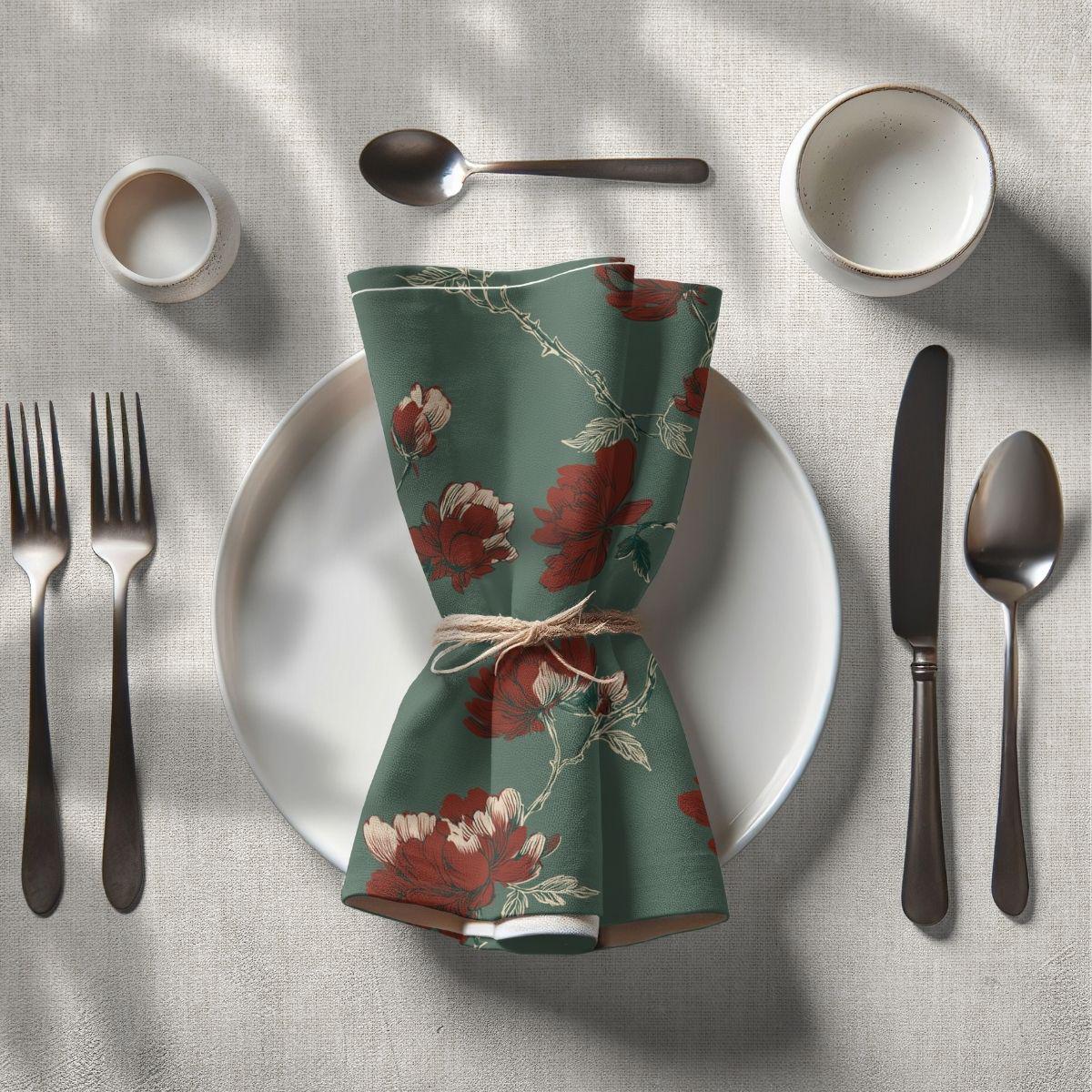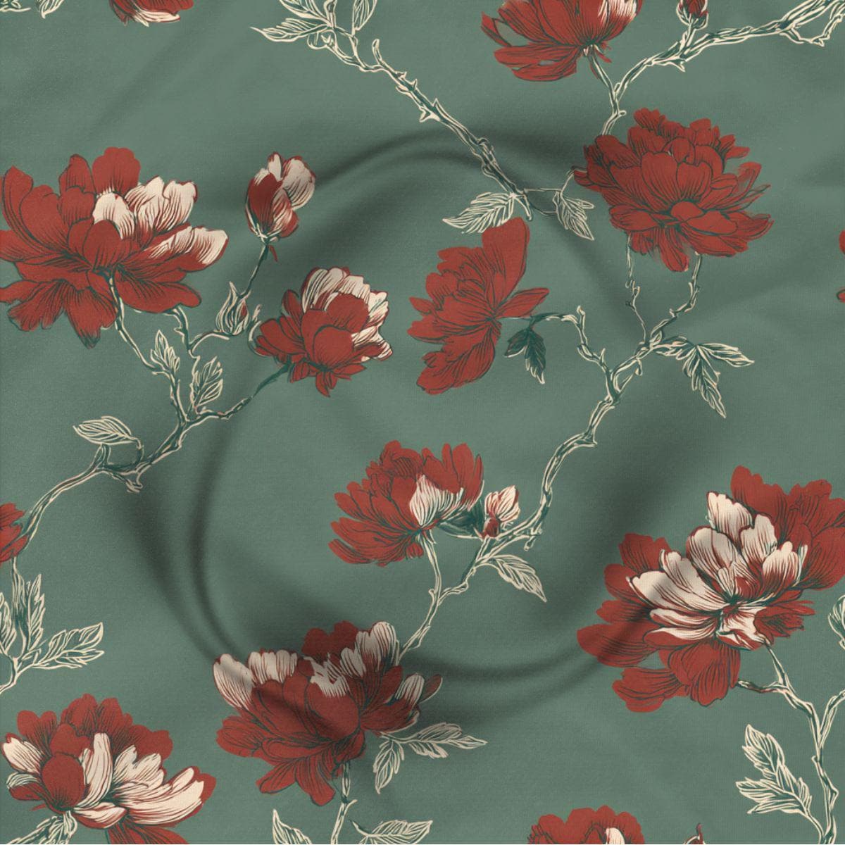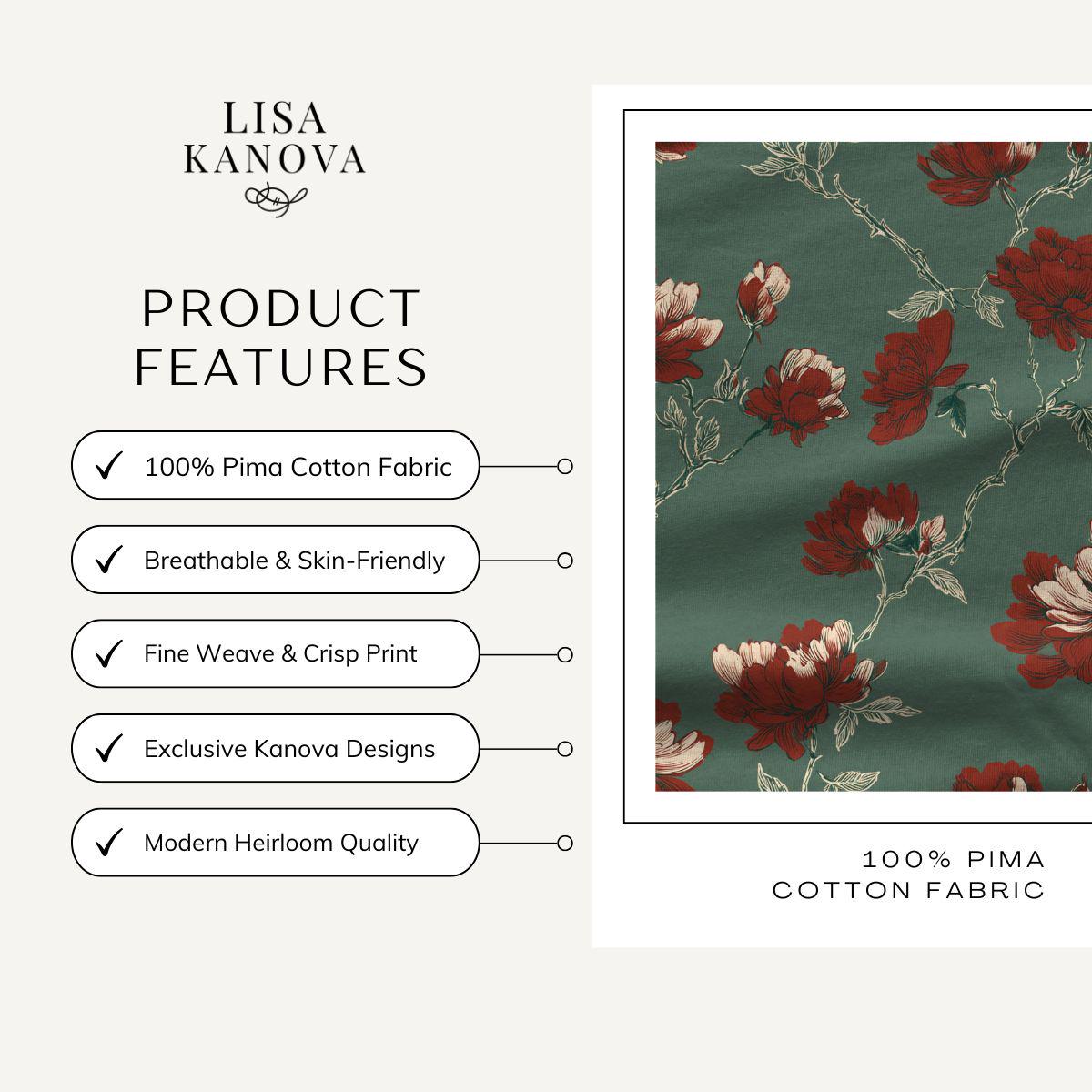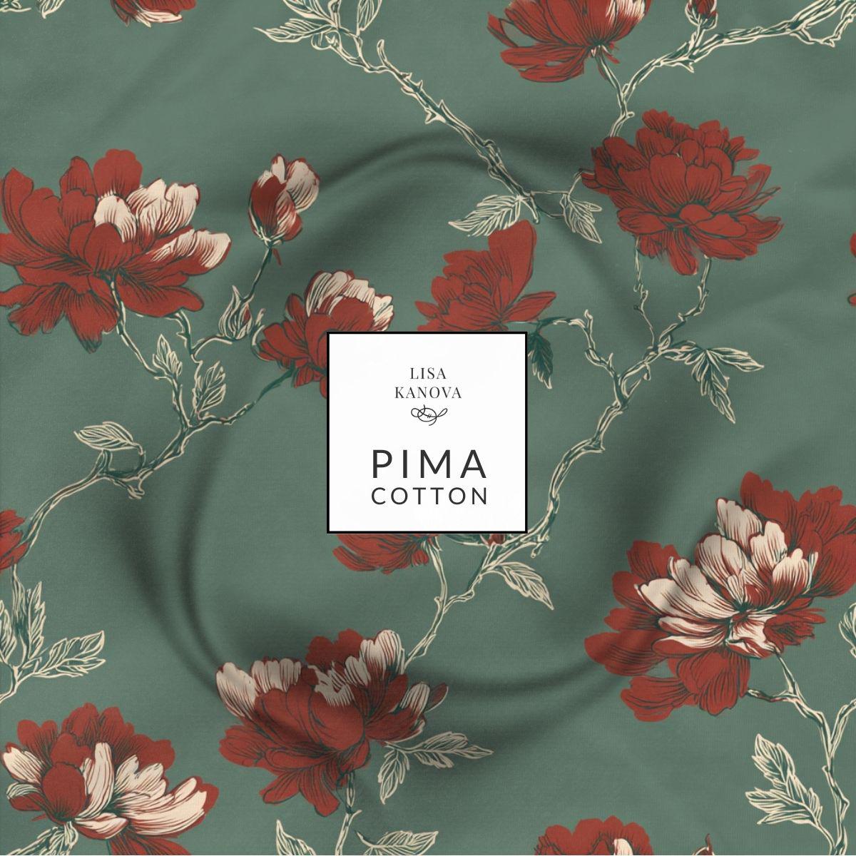 Green Velvet at Dinnertime brings together deep green tones and warm florals in rust and ivory, creating a pattern that feels rich, welcoming, and composed. The contrast is soft rather than dramatic, designed to add warmth and depth without overwhelming a space. Printed on smooth Pima cotton, the fabric has a refined hand and gentle movement, making it ideal for pillows, bedding accents, or layered textiles in rooms meant to be gathered in, lingered in, and enjoyed.