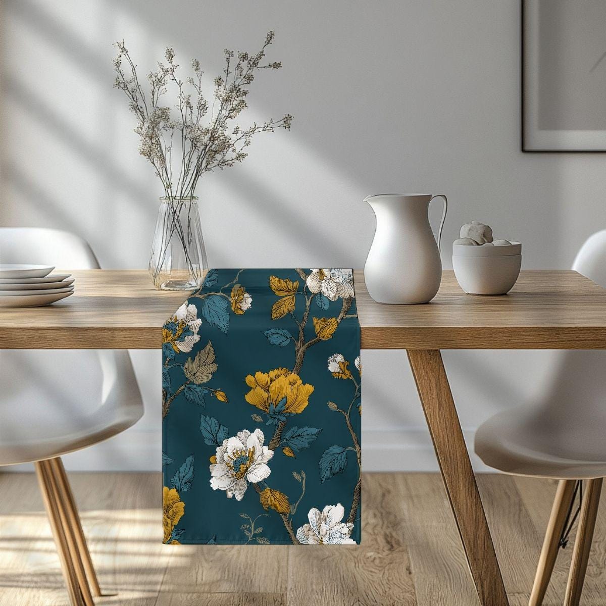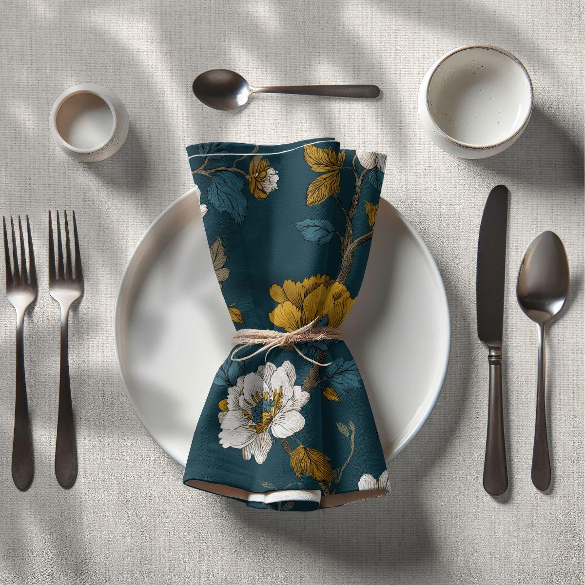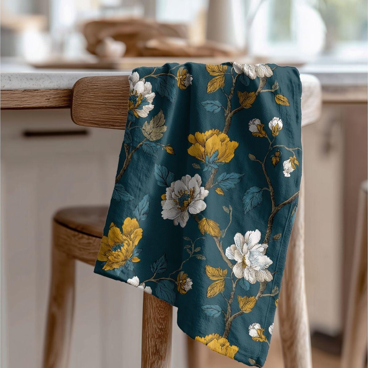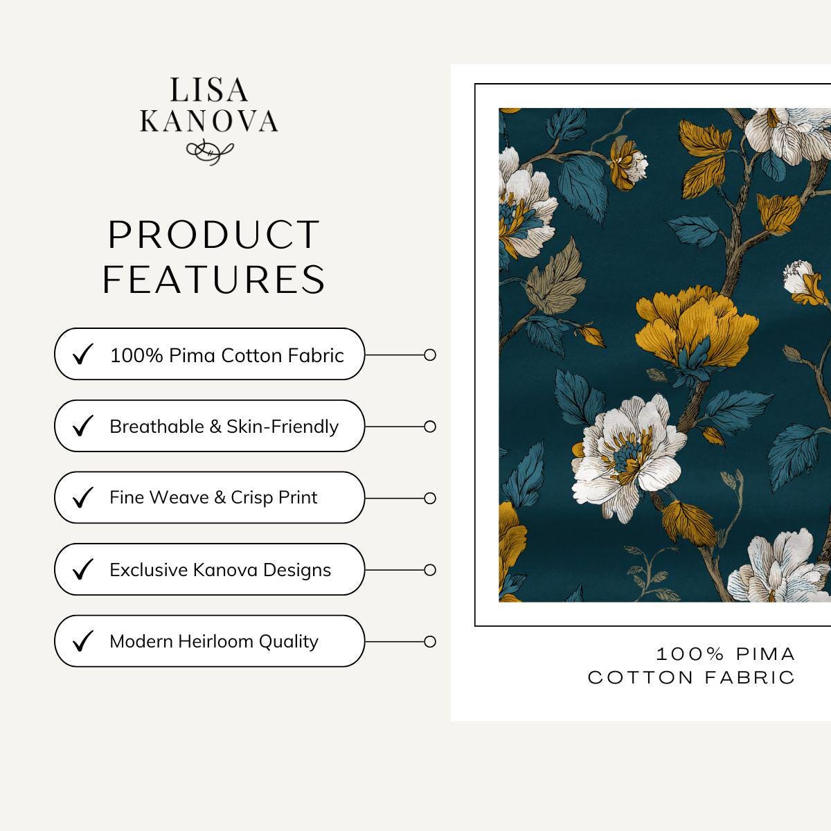 Golden Hour in the Study is a softly luminous floral set against a deep teal ground, layered with ivory blossoms and warm golden accents. Inspired by the gentle light that fills a room late in the afternoon, the pattern feels calm, composed, and quietly rich. Printed on smooth, breathable Pima cotton, the fabric has a refined hand and an easy drape, making it ideal for textiles meant to be used and lived with. Golden Hour in the Study brings warmth, balance, and understated elegance to everyday pieces.