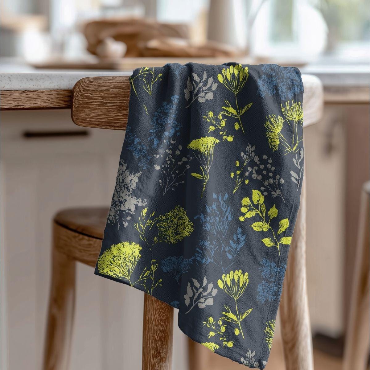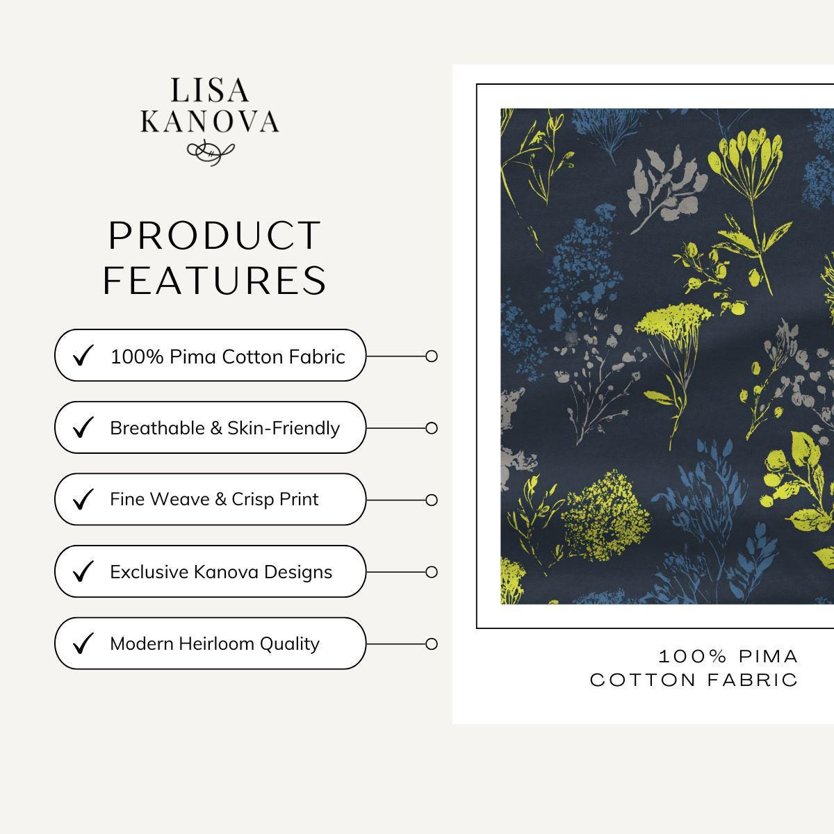 Field Notes at Twilight feels like a modern botanical study captured just as the light fades. Layered sprigs and pressed florals drift across a deep charcoal ground, highlighted by fresh chartreuse and muted blue tones that feel both alive and restrained. The composition is loose and collected rather than arranged — a pattern that reads as thoughtful, textural, and quietly confident. Printed on smooth Pima cotton, it’s ideal for spaces that lean modern, organic, and editorial, where pattern is meant to be noticed up close rather than announced.