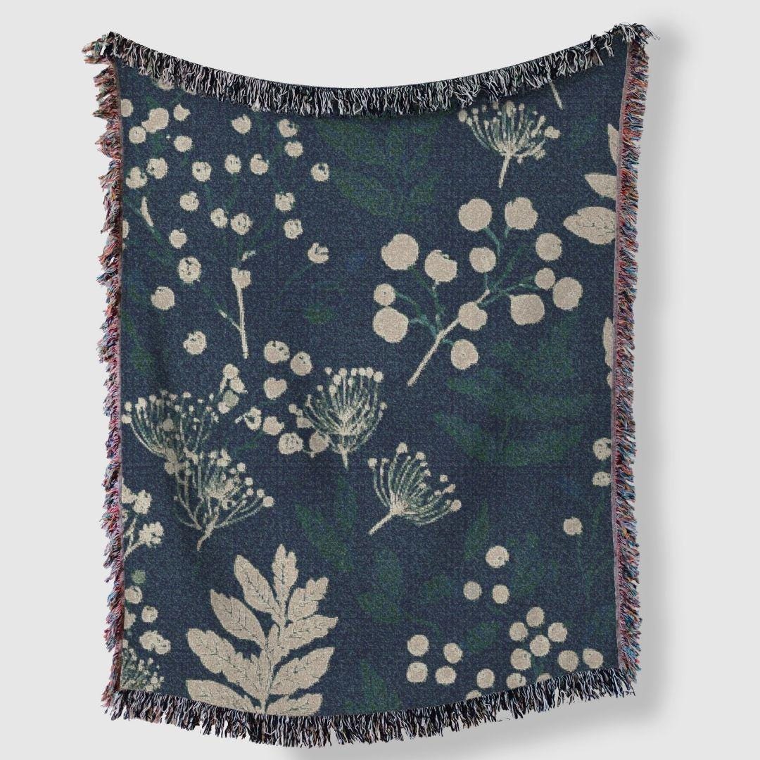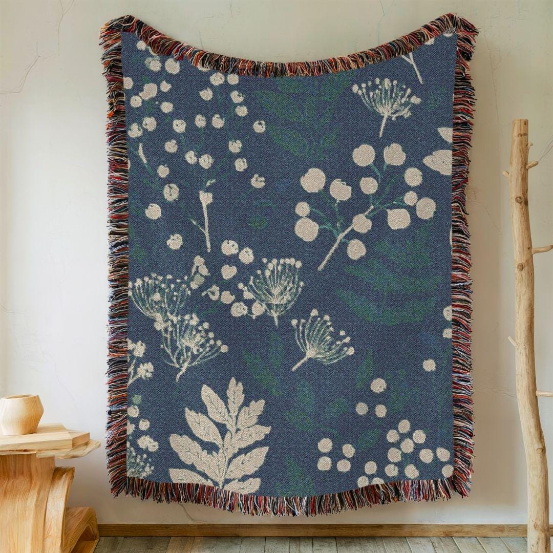 Statement Heirloom Cotton Woven Throw, A Bold, Curated Textile for Modern Interiors in Blue Botanica in the Evening