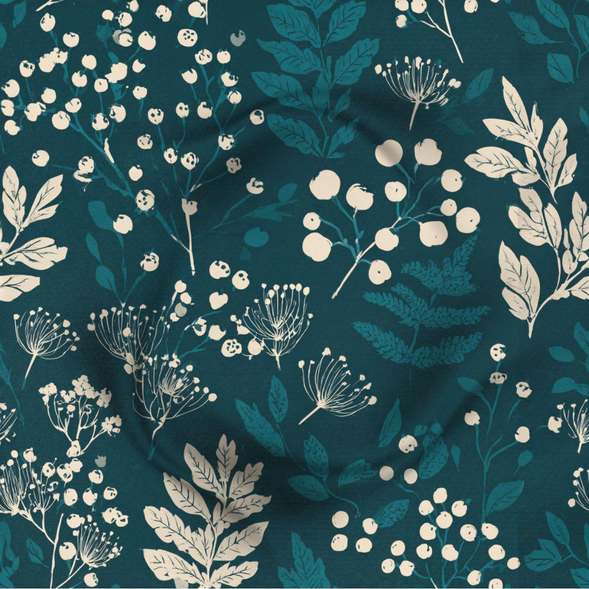 Deep Teal Herbarium draws from archival botanical plates and quiet natural studies, layering soft ivory berries and foliage against a rich teal ground. The composition feels curated rather than decorative—measured, grounded, and intentional. It’s a pattern that brings depth without heaviness, detail without noise. Designed for spaces that favor calm confidence over trend, and beauty that reveals itself slowly.