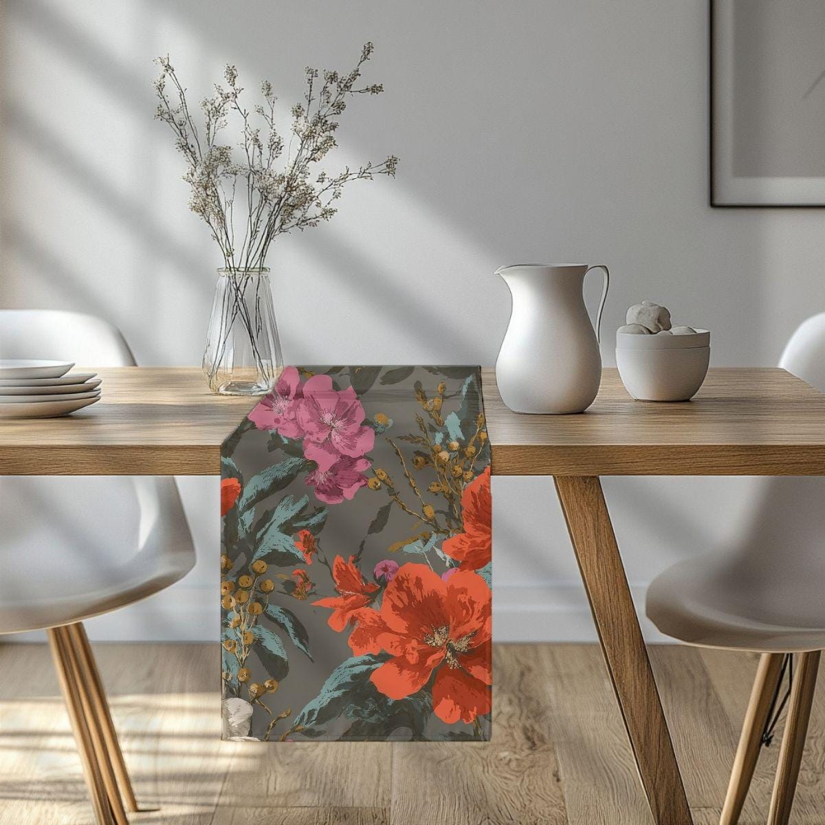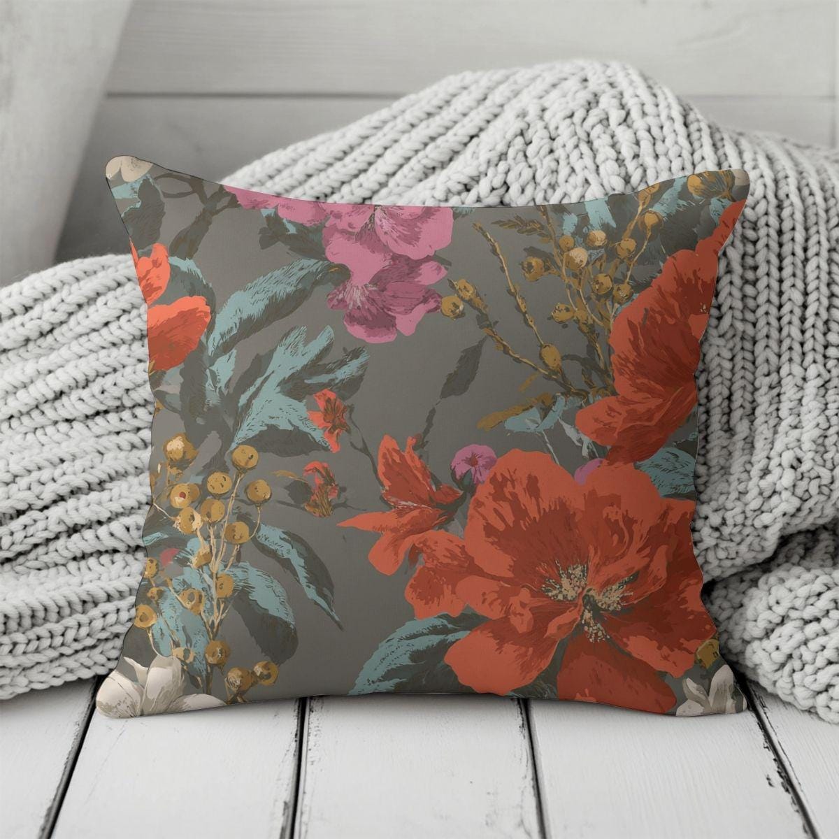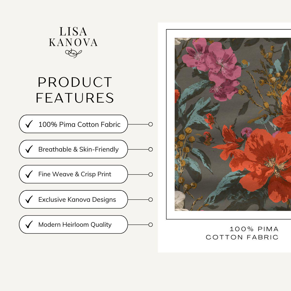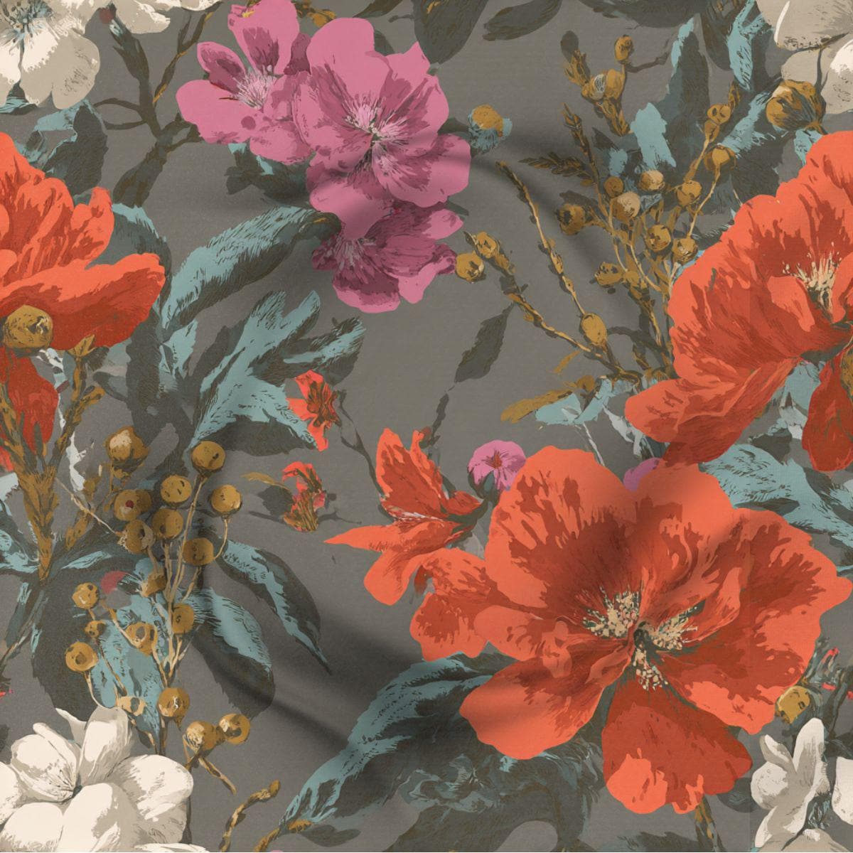 A Study in Contrast—bold florals in coral, blush, ivory, and teal layered against a softened charcoal ground. The palette is expressive without being chaotic, rich without feeling heavy. This pattern doesn’t romanticize softness; it celebrates strength that has settled into beauty. It brings warmth, depth, and presence to a space, the kind that feels lived-in and intentional rather than styled.