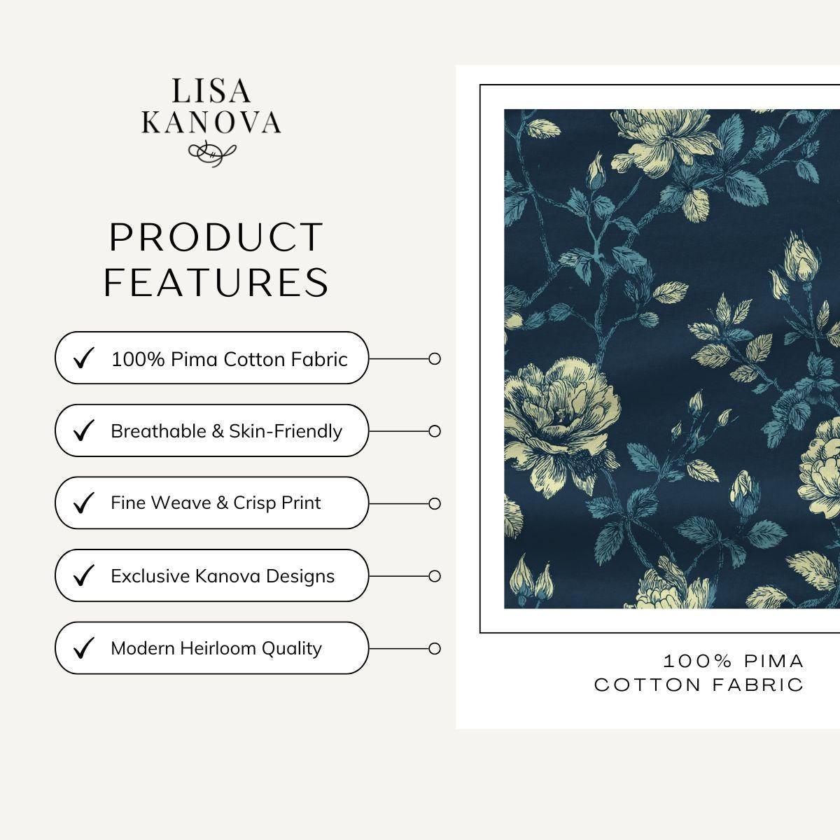 A deep midnight-blue ground layered with hand-drawn florals in softened ivory and muted teal, this pattern feels timeless without trying too hard. The scale is generous, the linework intentional, and the mood unmistakably refined—equal parts old-world romance and modern restraint. Printed on smooth Pima cotton for a crisp, breathable finish that gets better with time. Designed to feel collected, not trendy—like it’s always belonged in the room.